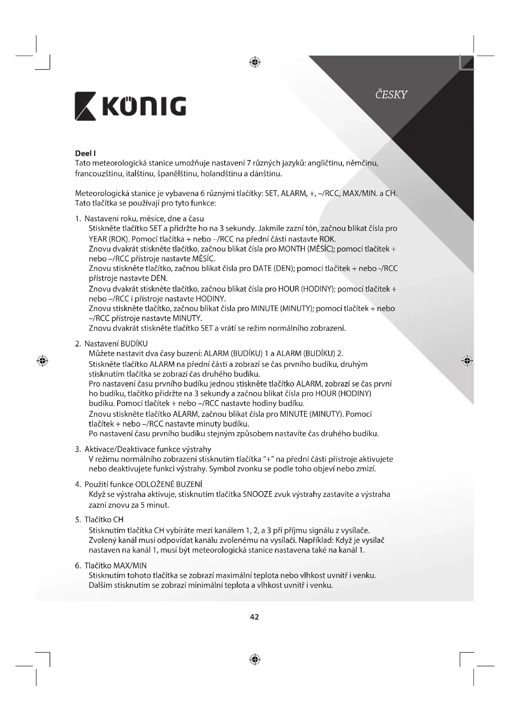Bezpečnostní opatření: Je-li nutný servis, musí toto zařízení otevřít POUZE autorizovaný technik, aby se snížilo riziko úrazu elektrickým proudem. Dojde-li kporuše, odpojte zařízení odnapájení a od ostatních zařízení. Nevystavujte zařízení působení vody nebo vlhkosti. Údržba: Kčištění používejte pouze suchý hadřík. Nepoužívejte čisticí rozpouštědla ani abrazivní čisticí prostředky. Záruka: Za změny, úpravy nebo poškození zařízení vdůsledku nesprávného zacházení není nesena zodpovědnost a není na ně poskytována záruka. Obecné upozornění: Design a specikace výrobku mohou být změněny bez předchozího upozornění. Všechna loga a obchodní názvy jsou registrované obchodní značky příslušných vlastníků a jsou chráněny zákonem. Pro budoucí použití uschovejte tento návod a obal. Upozornění: Tento výrobek je označen tímto symbolem. To znamená, že se s výrobkem musí zacházet jako s nebezpečným elektrickým a elektronickým odpadem a nelze jej po skončení životnosti vyhazovat s běžným domácím odpadem. Pro likvidaci těchto výrobků existují zvláštní sběrné systémy. Tento produkt byl vyroben a je dodáván v souladu se všemi příslušnými nařízeními a směrnicemi platnými ve všech členských státech Evropské Unie. Splňuje také veškeré relevantní specikace a předpisy státu, ve kterém se prodává. Ociální dokumentaci lze získat na vyžádání. Patří sem např: Prohlášení o shodě (a identikace produktu), materiálový bezpečnostní list, zpráva o testování produktu. V případě dotazů kontaktujte naše oddělení služeb zákazníkům: Webové stránky: http://www.nedis.com/en-us/contact/contact-form.htm E-mail: service@nedis.com Telefon: +31 (0)73-5993965 (během otevírací doby) NEDIS B.V., De Tweeling 28, 5215 MC ’s-Hertogenbosch, NIZOZEMSKO46 ROMÂNĂ Partea I Această staţie meteo are 7 opţiuni de limbă: engleză, germană, franceză, italiană, spaniolă, neerlandeză şi daneză. Staţia meteo dispune de 6 butoane: SET, ALARM, +, –/RCC, MAX/MIN şi CH. Aceste butoane corespund următoarelor funcţii: