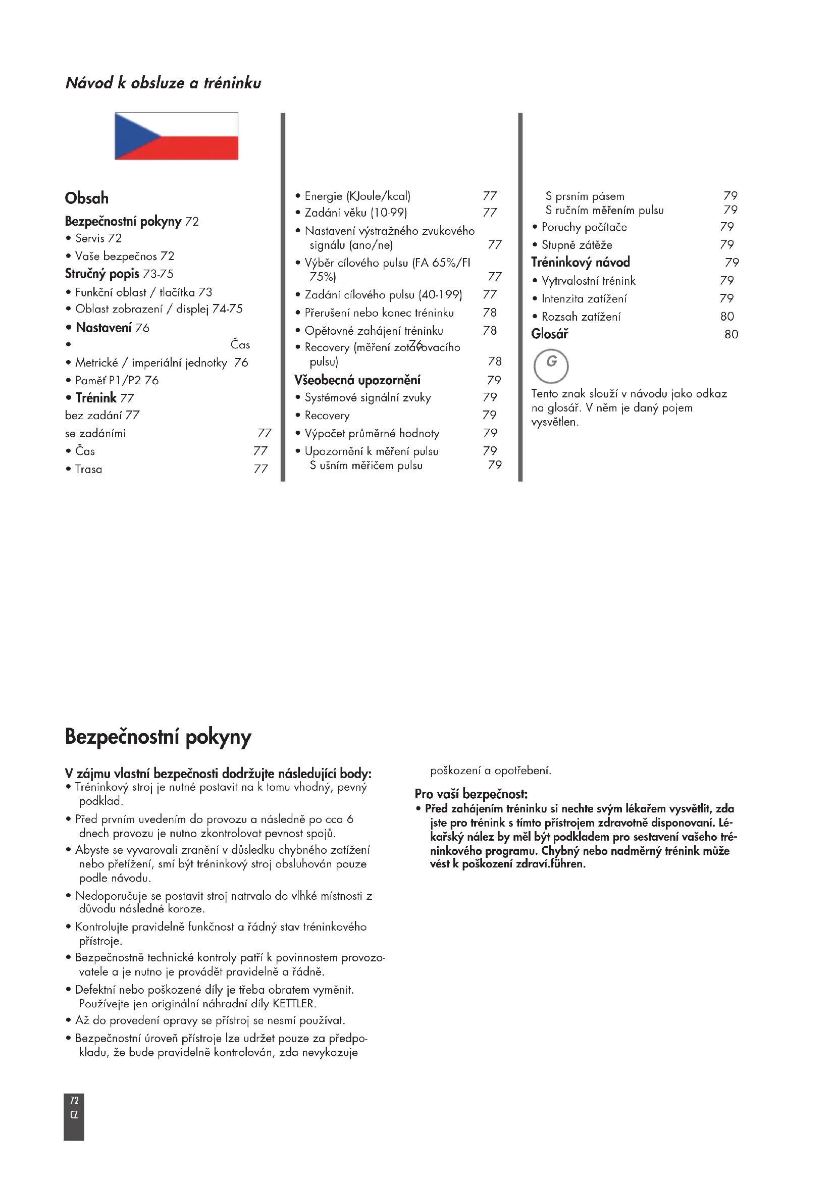 - Trénink 77 bez zadání 77se zadáními 77• Čas 77• Trasa 77• Energie (KJoule/kcal) 77• Zadání věku (10-99) 77• Nastavení výstražného zvukového signálu (ano/ne) 77• Výběr cílového pulsu (FA 65%/FI75%) 77• Zadání cílového pulsu (40-199) 77• Přerušení nebo konec tréninku 78• Opětovné zahájení tréninku 78• Recovery (měření zotavovacího pulsu) 78 Všeobecná upozornění 79