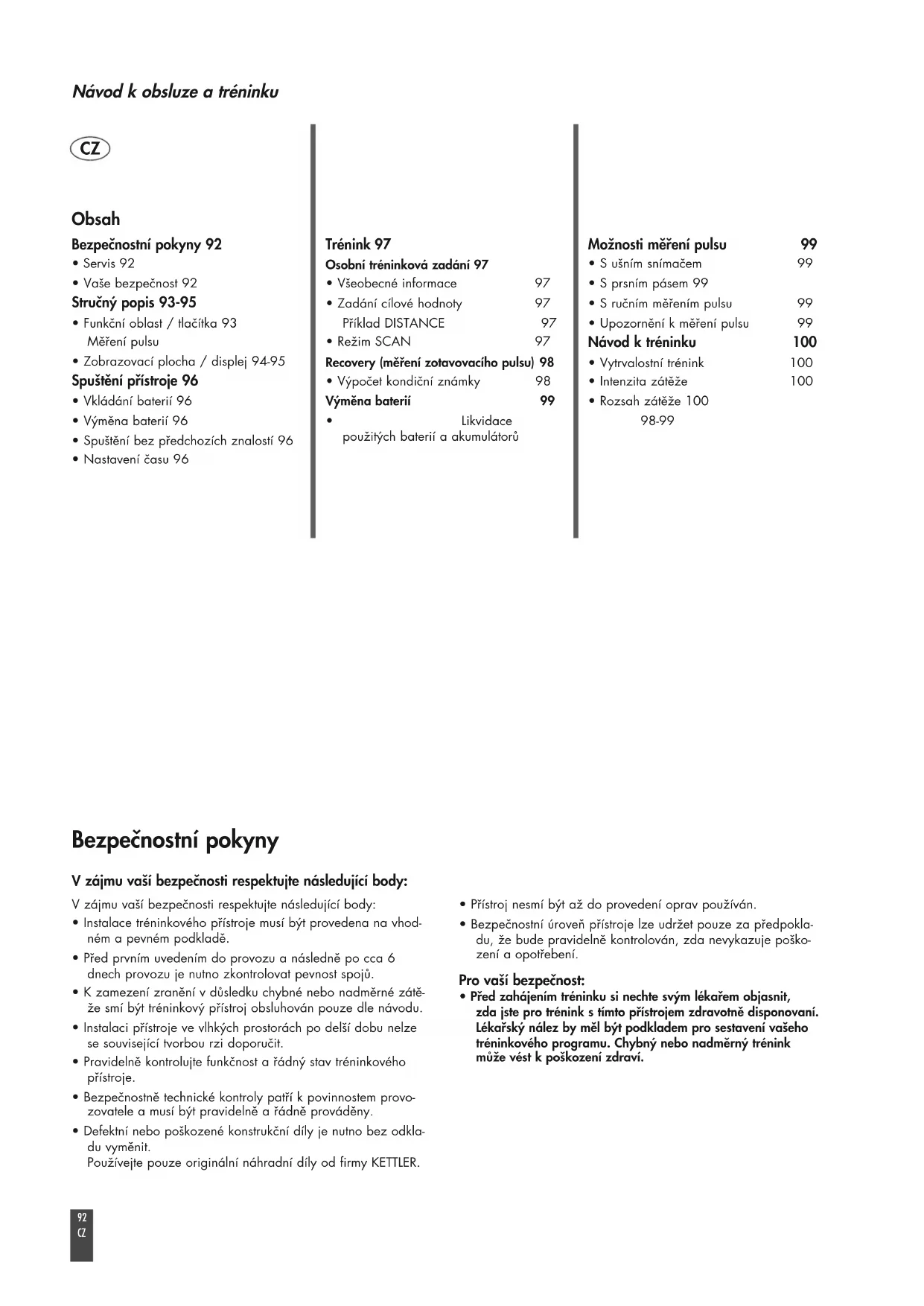 - Upozornění k měření pulsu 99 Návod k tréninku 100