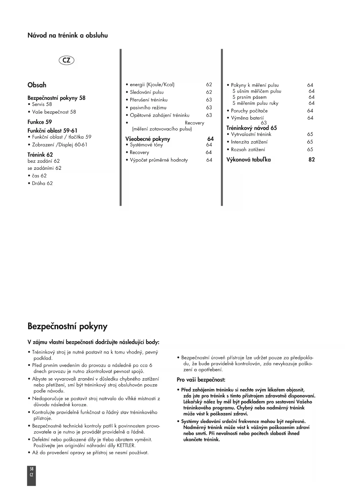 - Systémy sledování srdeční frekvence mohou být nepřesné. Nadměrný trénink může vést k vážným poškozením zdraví nebo smrti. Při nevolnosti nebo pocitech slabosti ihned ukončete trénink. Obsah Bezpečnostní pokyny 58