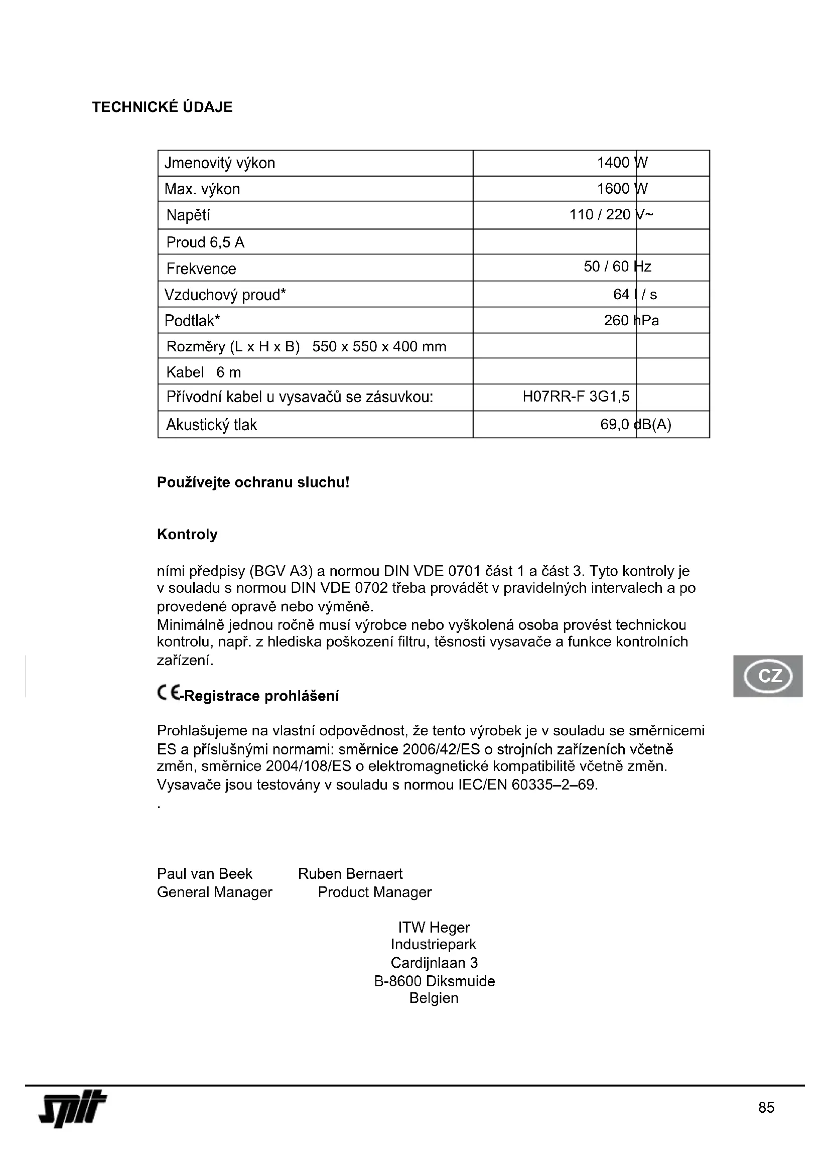 Prohlašujeme na vlastní odpovědnost, že tento výrobek je v souladu se směrnicemi ES a příslušnými normami: směrnice 2006/42/ES o strojních zařízeních včetně změn, směrnice 2004/108/ES o elektromagnetické kompatibilitě včetně změn. Vysavače jsou testovány v souladu s normou IEC/EN 60335–2–69.