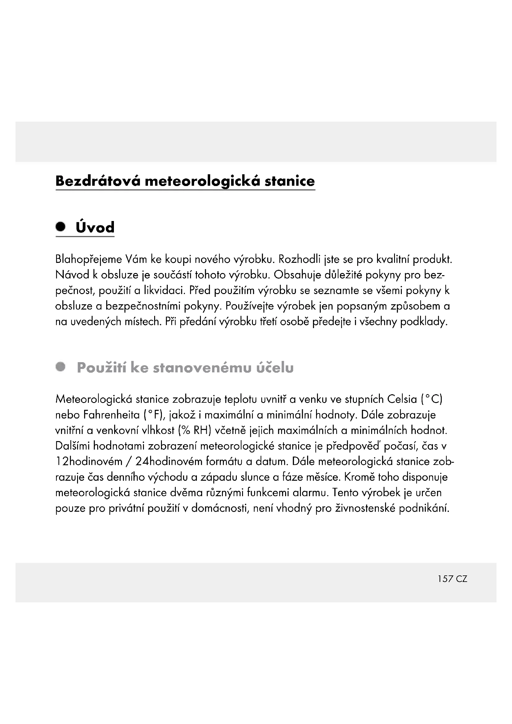 Schránka na baterie Technické údaje Meteorologická stanice: Rozsah měření teploty: 0 až +50°C +32 až +122°F Rozlišení teploty: 0,1°C Rozsah měření vlhkosti vzduchu: 20–95 % Rozlišení vlhkosti vzduchu: 1% Rádiový signál: DCF Baterie: 3 x AA, 1,5 V (stejnosměrný proud) Rozsah měření tlaku vzduchu: 850 - 1050hPa Frekvenční pásmo: 433.050 do 434.790 MHz Venkovní čidlo: Rozsah měření teploty: –20 až +65 °C –4 až +149 °F160 CZ Rozsah měření vlhkosti vzduchu: 20–95 % Rozlišení vlhkosti vzduchu: 1% VF přenosový signál: 433 MHz VF dosah přenosu: maximálně 30 metrů (ve volném terénu) Baterie: 2 x AA, 1,5 V (stejnosměrný proud) Stupeň krytí: IPX4 (ochrana před stříkající vodou) Frekvenční pásmo: 433.050 do 434.790 MHz Maximální přenosový výkon: 433.999 MHz, <10 dBm Rozsah dodávky 1 meteorologická stanice 1 venkovní čidlo 3 baterie AA, 1,5 V (předinstalované) 2 baterie AA, 1,5 V (předinstalované) 1 návod k obsluze Bezpečnost Přečtěte si všechna bezpečnostní upozornění a pokyny. Zanedbání dodržování bezpečnostních pokynů a návodů mohou způsobit úraz elektrickým proudem, požár a / nebo těžká poranění.161 CZ USCHOVEJTE VŠECHNY BEZPEČNOSTNÍ POKYNY A INSTRUKCE PRO POUŽITÍ VBUDOUCNOSTI! Všeobecné bezpečnostní pokyny Děti často podcení nebezpečí. Chraňte vždy výrobek před dětmi. Tento výrobek mohou používat děti od 8 let, osoby se sníženými fyzickými, smyslovými nebo duševními schopnosti nebo s nedostatečnými zkušenostmi a znalostmi, jestliže budou pod dohledem nebo byly poučeny o bezpečném používání výrobku a chápou nebezpečí, která z jeho používání vyplývají. S výrobkem si děti nesmí hrát. Děti nesmí bez dohledu provádět čištění ani uživa- telskou údržbu. Vadný výrobek neuvádějte do provozu. Bezpečnostní pokyny pro baterie a akumulátory NEBEZPEČÍ OHROŽENÍ ŽIVOTA! Uchovávejte baterie a akumulátory mimo dosah dětí. V případě spolknutí okamžitě vyhledejte lékařskou pomoc!162 CZ NEBEZPEČÍ VÝBUCHU! Nenabíjecí baterie nikdy znovu nenabí- jejte. Baterie nebo akumulátory nezkratujte ani je neotevírejte. Hrozí přehřátí, nebezpečí požáru nebo jejich prasknutí. Nikdy neházejte baterie nebo akumulátory do ohně ani do vody. Nevystavujte baterie nebo akumulátory mechanickému zatížení. Nebezpečí vytečení baterií / akumulátorů Zabraňte extrémním podmínkám a teplotám, např. na topení anebo na slunci, které mohou negativně ovlivnit funkci baterií nebo akumulátorů. Vpřípadě vytečení baterií / akumulátorů zabraňte kontaktu chemikálií spokož- kou, očima a sliznicemi! Omyjte ihned postižená místa dostatečným množstvím čisté vody a vyhledejte lékařskou pomoc! NOSTE OCHRANNÉ RUKAVICE! Vyteklé i poškozené baterie nebo akumulátory mohou při kontaktu s pokožkou způsobit její po- leptání. Noste proto vhodné rukavice. V případě vytečení ihned odstraňte baterie nebo akumulátory z výrobku, abyste zabránili jeho poškození! Používejte jen baterie nebo akumulátory stejného typu. Nekombinujte staré baterie nebo akumulátory s novými! Odstraňte baterie nebo akumulátory při delším nepoužívání z výrobku.163 CZ Nebezpečí poškození výrobku Používejte jen udaný typ baterie nebo akumulátoru! Nasazujte baterie nebo akumulátory podle označení polarity (+) a (-) na bateriích nebo akumulátorech a na výrobku. Vyčistěte před vložením kontakty baterie nebo akumulátoru a kontakty v při- hrádce na baterie! Vybité baterie nebo akumulátory ihned vyjměte z výrobku. Před uvedením do provozu Instalace zařízení Vložte baterie nejdříve do venkovního čidla a teprve potom do meteorologické stanice. POZOR! Při volbě místa instalace se ujistěte, že zařízení nejsou vystavena pří- mému slunečnímu záření, vibraci, prachu, horku, chladu a vlhkosti. Zařízení neumisťuj