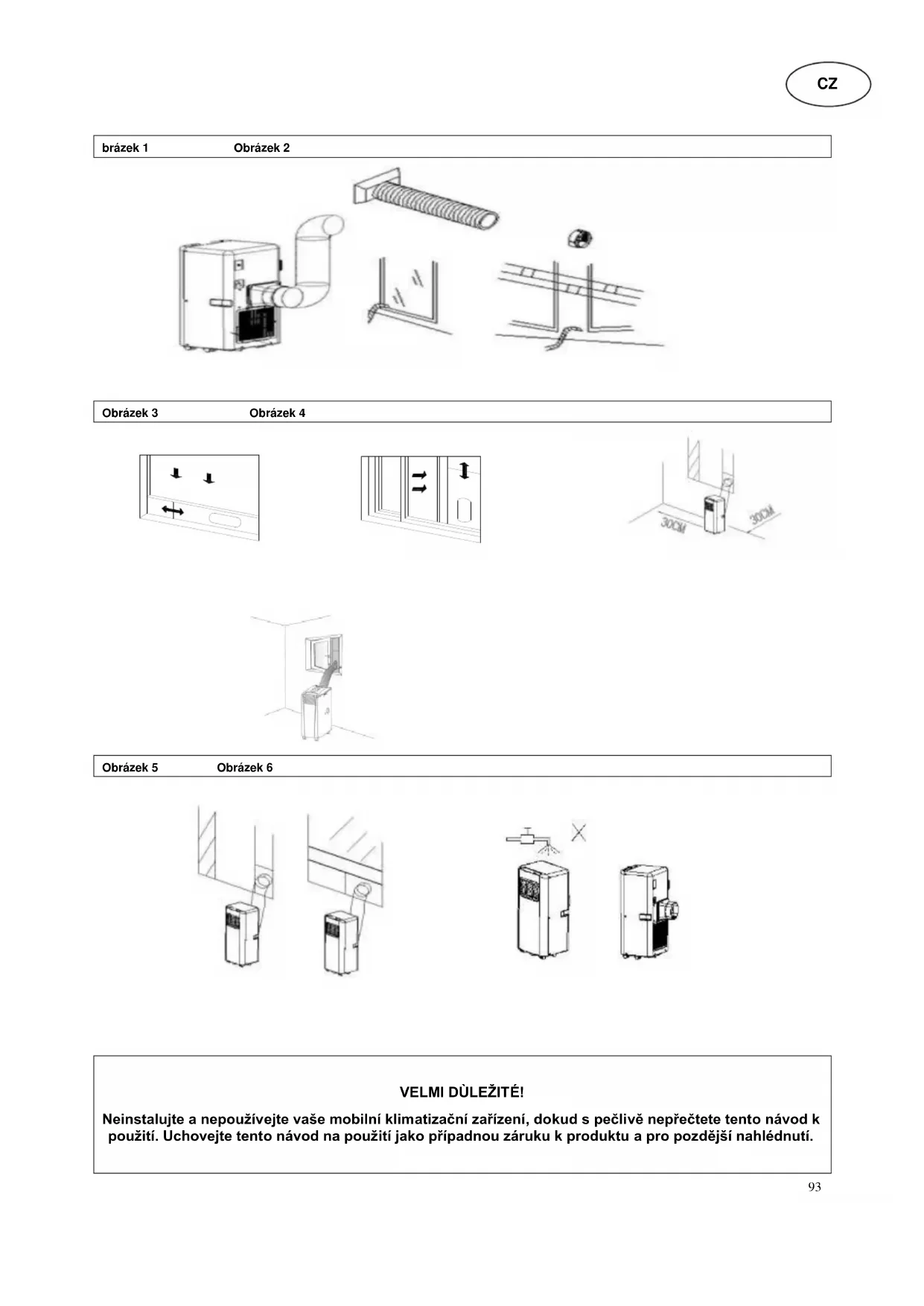VELMI DÙLEŽITÉ! Neinstalujte a nepoužívejte vaše mobilní klimatizační zařízení, dokud s pečlivě nepřečtete tento návod k použití. Uchovejte tento návod na použití jako případnou záruku k produktu a pro pozdější nahlédnutí. CZ94 Upozornění! Toto zařízení může být používáno dětmi od 8 roků a osobami se sníženými fyzickými, senzorickými nebo duševními schopnostmi, nebo osobami bez zkušeností a/nebo s chybějícími znalostmi, pokud budou pod odpovídajícím dozorem nebo získají poučení k používání tohoto zařízení a chápou nebezpečí plynoucí z jeho provozu. Děti si nesmí hrát s tímto přístrojem. Děti nesmí provádět bez dozoru čištění a uživatelskou údržbu přístroje. Přístroj je určen pouze pro použití uvnitř. Zařízení nesmí být připojeno k vadné zásuvce. Před uvedením do provozu dbejte na to, aby byl přístroj správně nainstalován. Neprovozujte zařízení v blízkosti otevřeného ohnì. Neprovozujte zařízení v prostředí, kde mùže dojít k rozstříknutí oleje nebo vody. Nevystavujte zaøízení pøímému sluneènímu záøení. Přístroj neprovozujte v blízkosti vany, sprchy, bazénu nebo v prádelně. Nikdy nestrkejte prsty, tužky nebo jiné předměty, když stráž když je připojen napájecí konektor, a to zejména při běhu. Klimatizační zařízení je nutné skladovat a transportovat vždy vestoje.V případě pochyb vyčkejte aspoň 24 hodin, než klimatizační zařízení znovu zapnete. Najděte umístění poblíž zásuvky. Před čištěním zařízení nebo filtru ověřte, že je zařízení vypnuté a odpojené ze sítì. Před transportem zařízení vypusťte vodu, která se v něm nachází. Zajistěte, aby nebyl blokován otvor pro vstup a výstup vzduchu. Přístroj musí být nainstalován ve shodě s národními předpisy pro elektrická zařízení.95 Používejte zařízení výhradně na horizontálním povrchu. Udržujte 30cm odstup od zařízení, jak je vidět na vedlejším obrázku Nikdy nepoužívejte zástrčku ze zásuvky jako vypínač pro spuštění a vypnutí klimatizační jednotky. Použijte dodaný POWER vypínač umístěný na ovládacím panelu. Ujistěte se, že napájecí kabel je správně uzemněn. Pokud je síťový kabel poškozený, je nutné, aby ho vyměnil prodávajícím nebo jeho servisním zástupcem, nebo podobně kvalifikovanou osobou, aby se předešlo možnému nebezpečí. Označení náhradních dílů/komponent