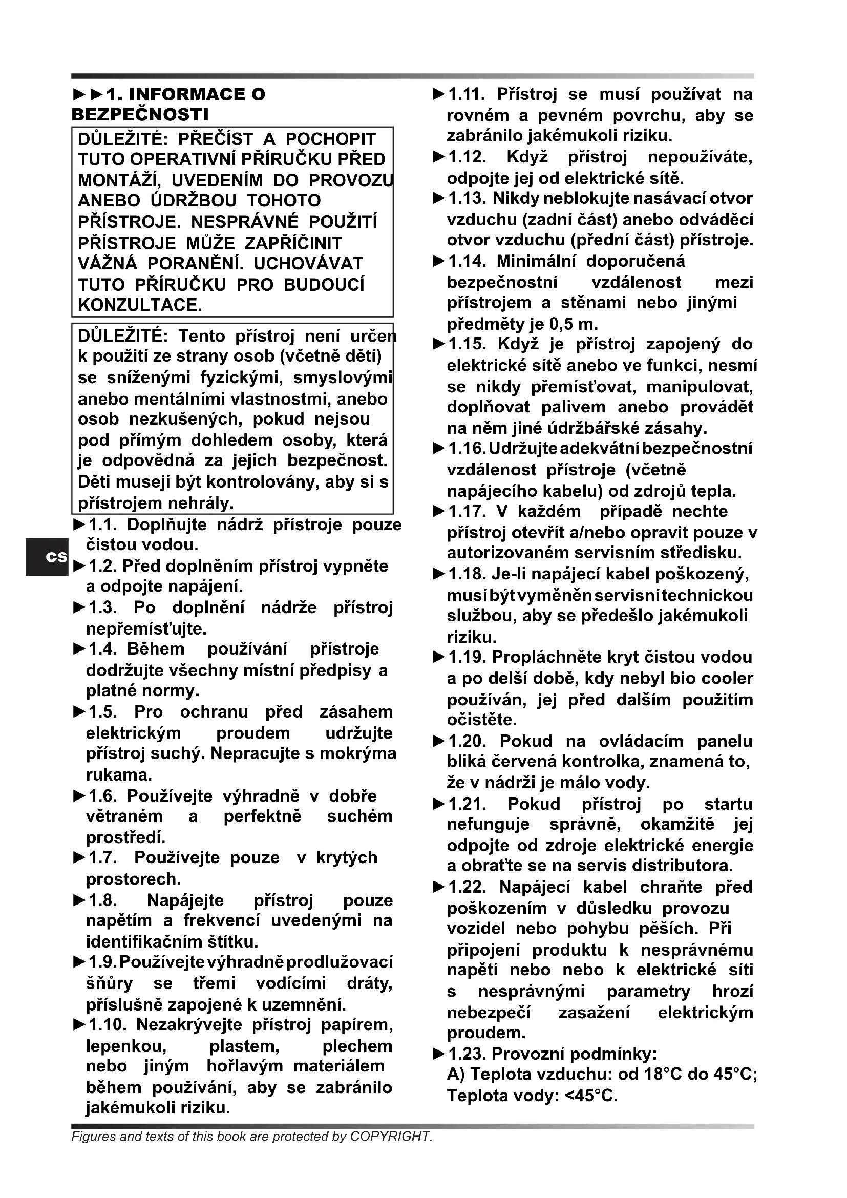 KONZULTACE. DŮLEŽITÉ: Tento přístroj není určen k použití ze strany osob (včetně dětí) se sníženými fyzickými, smyslovými anebo mentálními vlastnostmi, anebo osob nezkušených, pokud nejsou pod přímým dohledem osoby, která je odpovědná za jejich bezpečnost. Děti musejí být kontrolovány, aby si s přístrojem nehrály. ►1.1. Doplňujte nádrž přístroje pouze čistou vodou. ►1.2. Před doplněním přístroj vypněte a odpojte napájení. ►1.3. Po doplnění nádrže přístroj nepřemísťujte. ►1.4. Během používání přístroje dodržujte všechny místní předpisy a platné normy. ►1.5. Pro ochranu před zásahem elektrickým proudem udržujte přístroj suchý. Nepracujte s mokrýma rukama. ►1.6. Používejte výhradně v dobře větraném a perfektně suchém prostředí. ►1.7. Používejte pouze v krytých prostorech. ►1.8. Napájejte přístroj pouze napětím a frekvencí uvedenými na identikačním štítku. ►1.9. Používejte výhradně prodlužovací šňůry se třemi vodícími dráty, příslušně zapojené k uzemnění. ►1.10. Nezakrývejte přístroj papírem, lepenkou, plastem, plechem nebo jiným hořlavým materiálem během používání, aby se zabránilo jakémukoli riziku. ►1.11. Přístroj se musí používat na rovném a pevném povrchu, aby se zabránilo jakémukoli riziku. ►1.12. Když přístroj nepoužíváte, odpojte jej od elektrické sítě. ►1.13. Nikdy neblokujte nasávací otvor vzduchu (zadní část) anebo odváděcí otvor vzduchu (přední část) přístroje. ►1.14. Minimální doporučená bezpečnostní vzdálenost mezi přístrojem a stěnami nebo jinými předměty je 0,5 m. ►1.15. Když je přístroj zapojený do elektrické sítě anebo ve funkci, nesmí se nikdy přemísťovat, manipulovat, doplňovat palivem anebo provádět na něm jiné údržbářské zásahy. ►1.16. Udržujte adekvátní bezpečnostní vzdálenost přístroje (včetně napájecího kabelu) od zdrojů tepla. ►1.17. V každém případě nechte přístroj otevřít a/nebo opravit pouze v autorizovaném servisním středisku. ►1.18. Je-li napájecí kabel poškozený, musí být vyměněn servisní technickou službou, aby se předešlo jakémukoli riziku. ►1.19. Propláchněte kryt čistou vodou a po delší době, kdy nebyl bio cooler používán, jej před dalším použitím očistěte. ►1.20. Pokud na ovládacím panelu bliká červená kontrolka, znamená to, že v nádrži je málo vody. ►1.21. Pokud přístroj po startu nefunguje správně, okamžitě jej odpojte od zdroje elektrické energie a obraťte se na servis distributora. ►1.22. Napájecí kabel chraňte před poškozením v důsledku provozu vozidel nebo pohybu pěších. Při připojení produktu k nesprávnému napětí nebo nebo k elektrické síti s nesprávnými parametry hrozí nebezpečí zasažení elektrickým proudem. ►1.23. Provozní podmínky: A) Teplota vzduchu: od 18°C do 45°C; Teplota vody: <45°C. Figures and texts of this book are protected by COPYRIGHT.cs B) Napětí v napájecím zdroji nesmí překračovat požadovanou hodnotu o (+/-) 5%. C) Přiváděný vzduch musí být zbaven prachu, nečistot a v případě potřeby je nutno použít další zařízení na čištění vzduchu. ►►2. ROZBALENÍ ►2.1. Odstraňte všechny materiály, které byly použity pro zabalení a dodání přístroje a zlikvidujte je podle platných předpisů. ►2.2. Vytáhněte všechny prvky z obalu. ►2.3. Zkontrolujte eventuální škody, vzniklé během přepravy. Pokud se vám zdá, že je přístroj poškozen, okamžitě informujte prodejce, u kterého byl zakoupen. ►►3. MONTÁŽ Přístroj je vybaven kolečky pro snadnou manipulaci. V závislosti na modelu jsou kolečka již namontovány, anebo je třeba namontovat. Komponenty, včetně odpovídajících šroubů pro montáž, se nacházejí uvnitř balení (Obr. 1). ►►4. FUNGOVÁNÍ UPOZORNĚNÍ: Před zapnutím přístroje si pozorně přečtěte ”INFORMACE O BEZPEČNOSTI”. UPOZORNĚNÍ: Používejte pouze čistou vodu, abyste se vyhnuli poruchám nebo anomáliím. UPOZORNĚNÍ: Zkontrolujte správné uzemnění vašeho elektrického systému. Zapojení k elektrické síti se musí provádět v souladu s platnými národními normami. Napájejte přístroj pouze napětím a frekvencí uvedenými na identikačním štítku. POZNÁMKA: Tyto modely lze napojovat na vodovodní přípojku napojením trubky na přípojný element (Obr. 10). ►►4.1. ZAPNUTÍ: ►4.1.1. Otevřete dvířka nádrže (Obr. 2). ►4.1.2. Doplňte vodu v nádrži (Obr. 3), hladina vody musí být mezi MIN a MAX stupnice, umístěné na boku přístroje (Obr. 4), aby se předešlo vzniku rizik. ►4.1.3. Zavřete dvířka nádrže (Obr. 5). ►4.1.4. Zapojte napájecí zástrčku do elektrické sítě (Obr. 6). ►4.1.5. Stiskněte tlačítko ON/OFF pro zapnutí přístroje (Obr. 9). ►►4.2. OVLÁDACÍ PANEL,