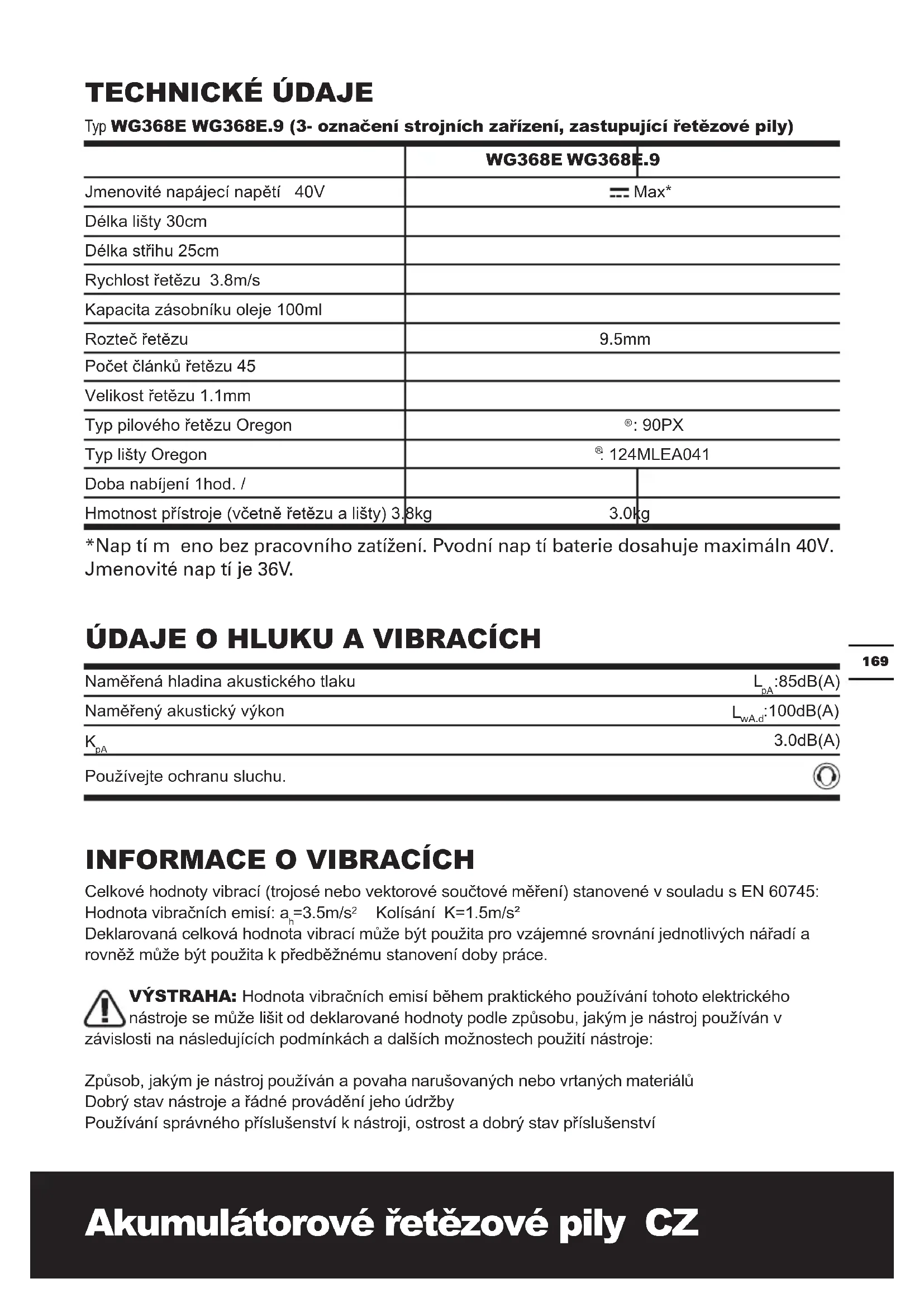 : 124MLEA041 Doba nabíjení 1hod. / Hmotnost přístroje (včetně řetězu a lišty) 3.8kg 3.0kg *Napętí męęeno bez pracovního zatížení. Pvodní napętí baterie dosahuje maximáln 40V. Jmenovité napętí je 36V.