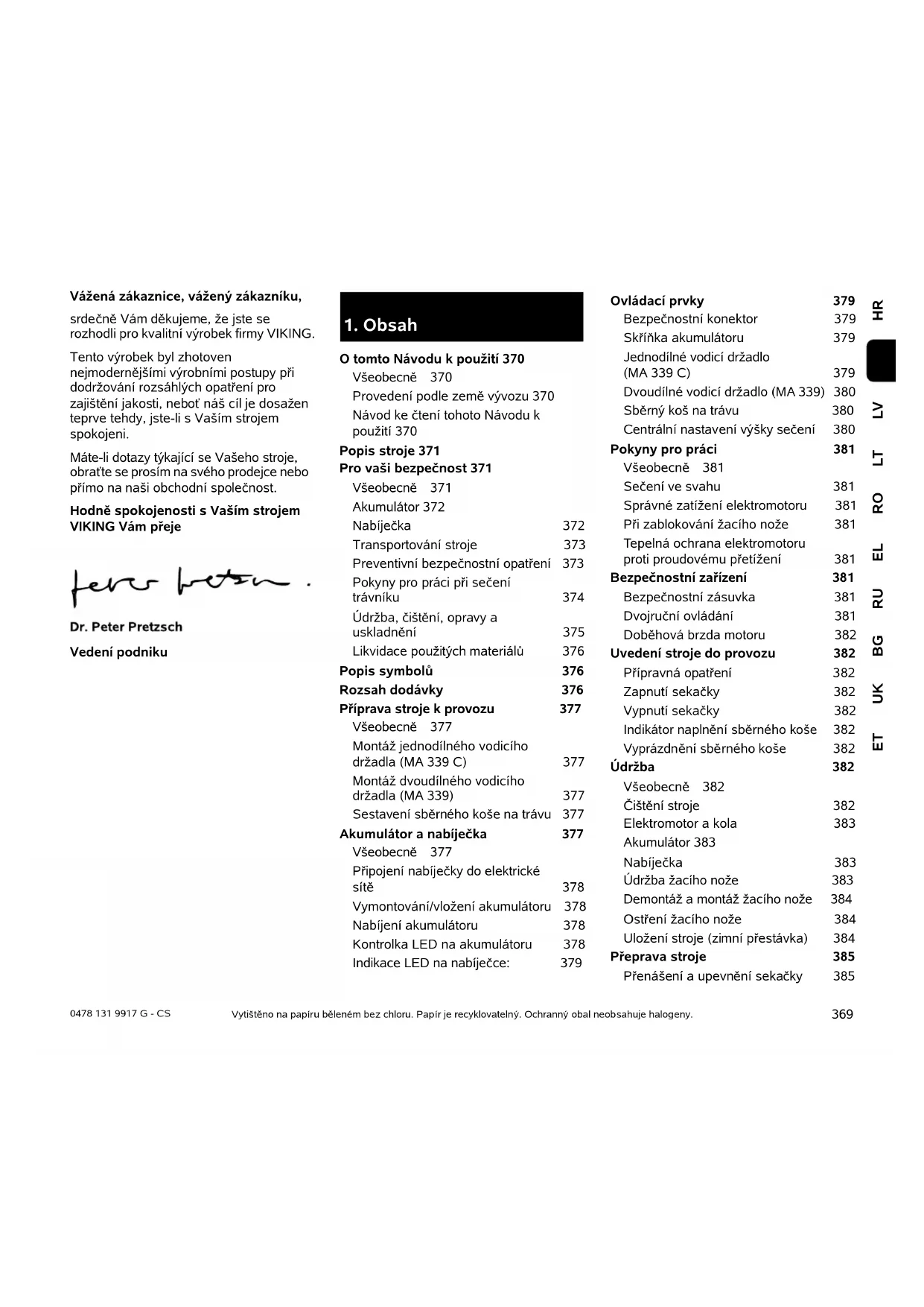 O tomto Návodu k použití 370 Všeobecně 370 Provedení podle země vývozu 370 Návod ke čtení tohoto Návodu k použití 370 Popis stroje 371 Pro vaši bezpečnost 371 Všeobecně 371 Akumulátor 372 Nabíječka 372 Transportování stroje 373 Preventivní bezpečnostní opatření 373 Pokyny pro práci při sečení trávníku 374 Údržba, čištění, opravy a uskladnění 375 Likvidace použitých materiálů 376 Popis symbolů 376 Rozsah dodávky 376 Příprava stroje k provozu 377 Všeobecně 377 Montáž jednodílného vodicího držadla (MA 339 C) 377 Montáž dvoudílného vodicího držadla (MA 339) 377 Sestavení sběrného koše na trávu 377 Akumulátor a nabíječka 377 Všeobecně 377 Připojení nabíječky do elektrické sítě 378 Vymontování/vložení akumulátoru 378 Nabíjení akumulátoru 378 Kontrolka LED na akumulátoru 378 Indikace LED na nabíječce: 379 Ovládací prvky 379 Bezpečnostní konektor 379 Skříňka akumulátoru 379 Jednodílné vodicí držadlo (MA 339 C) 379 Dvoudílné vodicí držadlo (MA 339) 380 Sběrný koš na trávu 380 Centrální nastavení výšky sečení 380 Pokyny pro práci 381 Všeobecně 381 Sečení ve svahu 381 Správné zatížení elektromotoru 381 Při zablokování žacího nože 381 Tepelná ochrana elektromotoru proti proudovému přetížení 381 Bezpečnostní zařízení 381 Bezpečnostní zásuvka 381 Dvojruční ovládání 381 Doběhová brzda motoru 382 Uvedení stroje do provozu 382 Přípravná opatření 382 Zapnutí sekačky 382 Vypnutí sekačky 382 Indikátor naplnění sběrného koše 382 Vyprázdnění sběrného koše 382 Údržba 382 Všeobecně 382 Čištění stroje 382 Elektromotor a kola 383 Akumulátor 383 Nabíječka 383 Údržba žacího nože 383 Demontáž a montáž žacího nože 384 Ostření žacího nože 384 Uložení stroje (zimní přestávka) 384 Přeprava stroje 385 Přenášení a upevnění sekačky 3850478 131 9917 G - CS