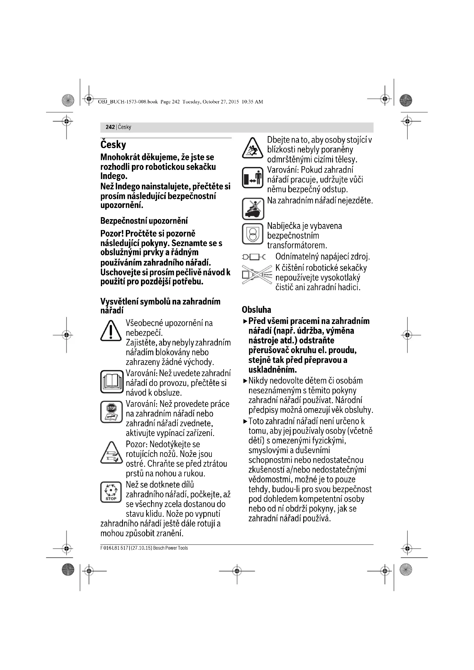 15 h OBJ_BUCH-1573-008.book Page 251 Tuesday, October 27, 2015 10:35 AM252 | Česky F 016 L81 517 | (27.10.15) Bosch Power Tools Časový plán Pod „Menu > Změna časového plánu“ lze vyvolat 5 časových plánů. „MANUÁLNĚ“ by se měl používat, pokud má zahradní nářadí pracovat pouze v aktuálním čase. Každý jednotlivý „ČASOVÝ PLÁN“ lze upravit podle Vašich požadavků. Příklad: Vyberte pomocí kurzoru nahoru/dolů jeden „ČASOVÝ PLÁN“ např. „ČAS. PLÁN 1“ a stiskněte „Změna“. Vyberte pomocí kurzoru nahoru/dolů požadovaný den sečení, např. „P“. Zvolte pomocí kurzoru vpravo/vlevo čas startu. Čas startu potvrďte pomocí tlačítka vpravo dole. Zvolte pomocí kurzoru vpravo/vlevo čas ukončení. Čas ukončení potvrďte pomocí tlačítka vpravo dole. Zahradní nářadí pracuje během časového úseku tak dlouho, než se musí nabít akumulátor. Je-li plocha trávníku posečená před uplynutím časového úseku, vrátí se zahradní nářadí zpátky k nabíjecí stanici. Naprogramované časové úseky se zobrazí v přehledovém plánu. Nastavte všechny navíc požadované dny sečení a potvrďte Váš osobní „ČAS. PLÁN 1“ pomocí tlačítka vlevo dole. Pro smazání časového okna umístěte kurzor k časovému oknu a to smažte pomocí tlačítka vpravo dole. Fajfka se zobrazuje vedle uloženého časového plánu. Zahradní nářadí začne sečení, jakmile se dosáhne dne a startovní doby časového úseku 1. Upozornění: Nastavte rozdílné časové plány kvůli sezónním podmínkám růstu na jaře, v létě a na podzim. Všímejte si růstu trávy a je-li to zapotřebí, časový plán přizpůsobte. Sečení Nenechávejte děti jezdit na zahradním nářadí. Dříve, než zahradní nářadí zvednete za nosnou rukojeť, stiskněte ruční tlačítko Stop. Výška sečení: výšku sečení lze nastavit mezi 20 mm a 60 mm (viz obrázek 19). K dispozici je 10 různých nastavení (ca. 20 mm, 24mm, 29 mm, 33 mm, 38 mm, 42 mm, 47 mm, 51 mm, 56 mm a 60 mm). Upozornění: Nožový systém Indego je dimenzovaný pro sečení krátké trávy (3–5 mm). Posečený materiál může zůstat ležet jako mulč pro přihnojování trávníku. Upozornění: Během prvních 3 týdnů nastavte výšku sečení mezi stupeň 5 a MAX, aby se nenastřihnul ohraničující vodič. Po 3 týdnech je vodič zakrytý trávníkem. Definujte časový plán s častým opakováním. Tím docílíte dobrých výsledků sečení, nabití akumulátoru vydrží déle a vyhnete se posečenému materiálu na trávníku. Výběr časového plánu Info MANUÁLNĚ