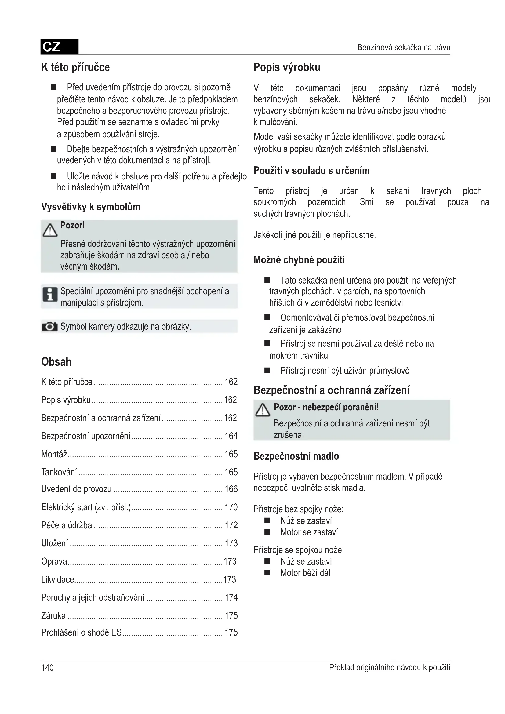 - ProhlášeníoshoděES K této příručce Předuvedenímpřístrojedoprovozusipozorně přečtětetentonávodkobsluze.Jetopředpokladem bezpečnéhoabezporuchovéhoprovozupřístroje. Předpoužitímseseznamtesovládacímiprvky azpůsobempoužívánístroje. Dbejtebezpečnostníchavýstražnýchupozornění uvedenýchvtétodokumentacianapřístroji. Uložtenávodkobsluzeprodalšípotřebuapředejto hoináslednýmuživatelům. Vysvětivky k symbolům Pozor! Přesnédodržovánítěchtovýstražnýchupozornění zabraňuješkodámnazdravíosoba/nebo věcnýmškodám. Speciálníupozorněníprosnadnějšípochopenía manipulacispřístrojem. Symbol kamery odkazuje na obrázky. Popis výrobku V této dokumentaci jsou popsány různé modely benzínových sekaček. Některé z těchto modelů jsou vybavenysběrnýmkošemnatrávua/nebojsouvhodné kmulčování. Modelvašísekačkymůžeteidentikovatpodleobrázků výrobkuapopisurůznýchzvláštníchpříslušenství. Použití v souladu s určením Tento přístroj je určen k sekání travných ploch na soukromých pozemcích. Smí se používat pouze na suchých travných plochách. Jakékolijinépoužitíjenepřípustné. Možné chybné použití Tatosekačkaneníurčenapropoužitínaveřejných travnýchplochách,vparcích,nasportovních hřištíchčivzemědělstvínebolesnictví Odmontovávatčipřemosťovatbezpečnostní zařízeníjezakázáno Přístrojsenesmípoužívatzadeštěnebona mokrémtrávníku Přístrojnesmíbýtužívánprůmyslově Bezpečnostní a ochranná zařízení Pozor - nebezpečí poranění! Bezpečnostníaochrannázařízenínesmíbýt zrušena! Bezpečnostní madlo Přístrojjevybavenbezpečnostnímmadlem.Vpřípadě nebezpečíuvolnětestiskmadla. Přístrojebezspojkynože: Nůžsezastaví Motorsezastaví Přístrojesespojkounože: Nůžsezastaví MotorběžídálCZ 141455 999_a1 Lanko startéru 9 Nastavenívýškystřihu*2 Start, stop* 10 Spojkanože* 3 Spínačpohonukol* 11 SpínačpohonuVario* 4 Bezpečnostnímadlo 12 Návod k obsluze5 Ergonomickénastavenívýšky* 13 Krytbočníhovyhazování*6 Ukazatel stavu paliva* 14 Víko*7 Kryttělasekačky* 15 Mulčovacíkit*8 Sběrnýkoš* 16 ElektrickýstartérZapalování17 StručnýprůvodceSymboly na přístrojiPozor! Mimořádnáopatrnostpřimanipulaci.Nežzačnetespraceminanoži,vytáhnětenástrčkuzapalovacíchsvíček!Nežuvedetepřístrojdoprovozu,bezpodmínečněsipřečtětetentonávodkpoužití!Stručnýprůvodce Odbrzdětemotorovoubrzdu.Voblastinebezpečísenesmízdržovattřetíosoby!Stručnýprůvodce Aktivujte pohon kol.Rukamaaninohamasenepřibližujteknožůmsekačky!Stručnýprůvodce Dálkovéovládáníplynustart/stop.Dodržujteodstupodoblastinebezpečí. p. 175