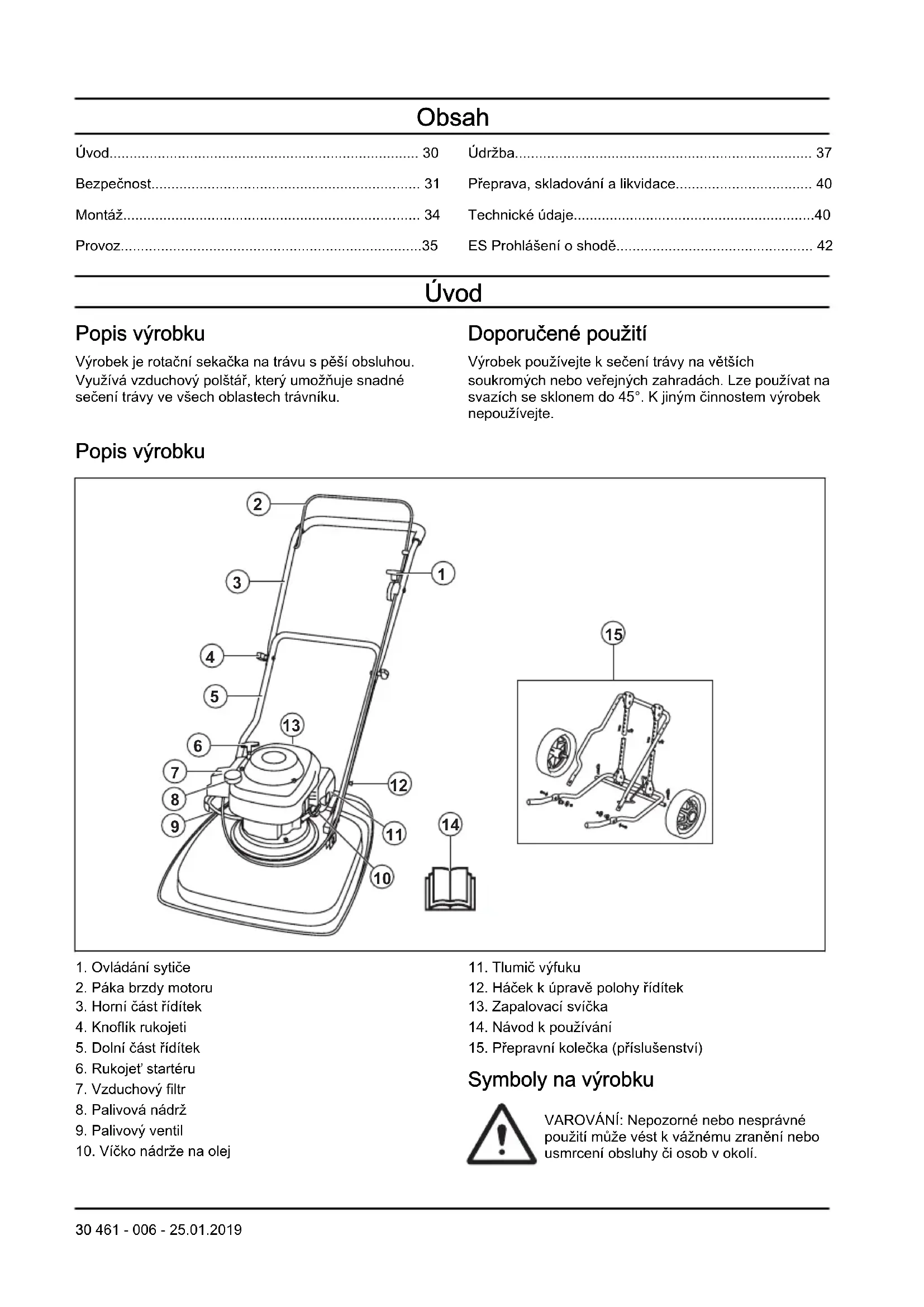- ES Prohlášení o shodě Úvod Popis výrobku Výrobek je rotační sekačka na trávu s pěší obsluhou. Využívá vzduchový polštář, který umožňuje snadné sečení trávy ve všech oblastech trávníku. Doporučené použití Výrobek používejte k sečení trávy na větších soukromých nebo veřejných zahradách. Lze používat na svazích se sklonem do 45°. K jiným činnostem výrobek nepoužívejte. Popis výrobku p. 42