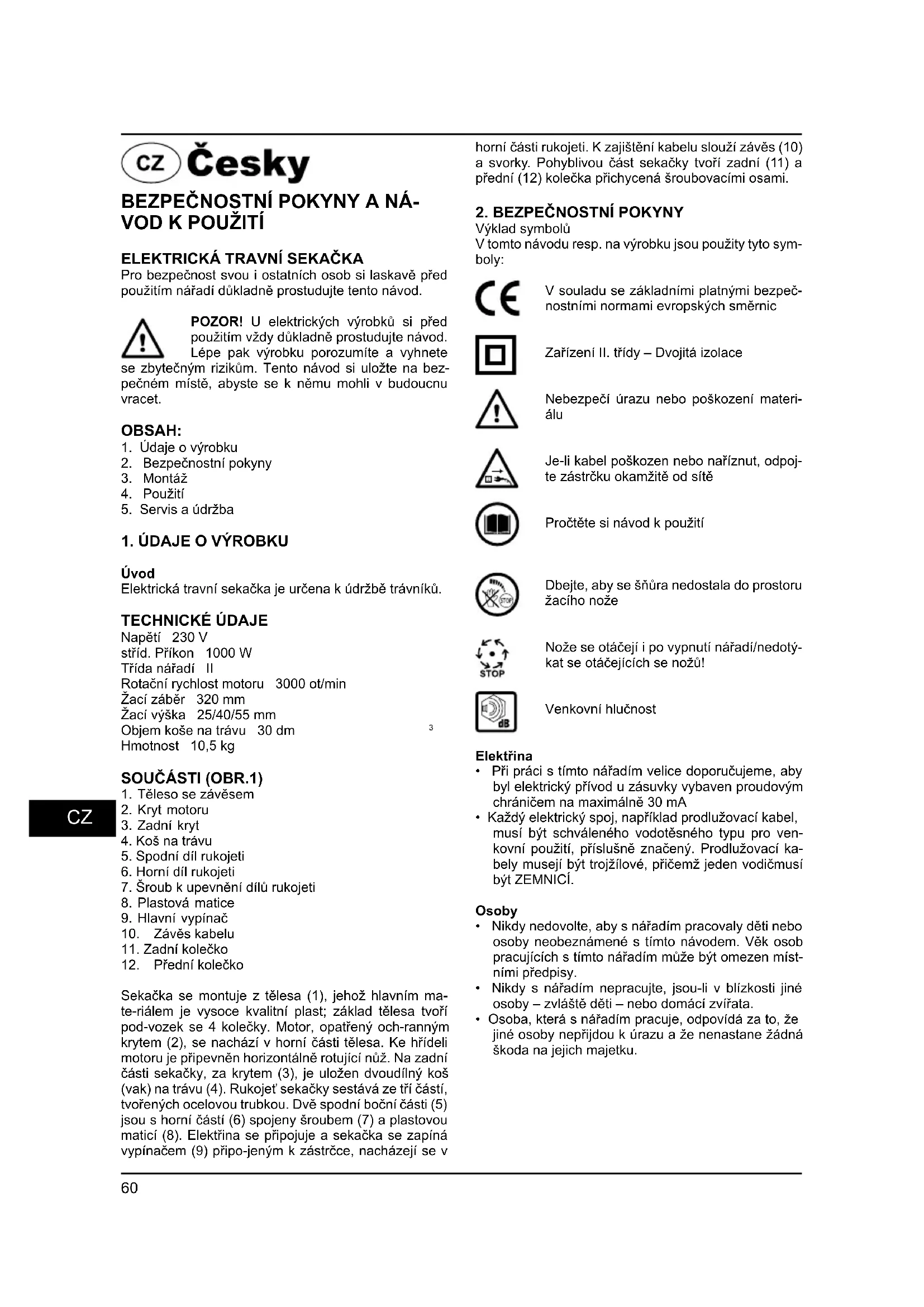 Úvod Elektrická travní sekačka je určena k údržbě trávníků. TECHNICKÉ ÚDAJE Napětí 230 V stříd. Příkon 1000 W Třída nářadí II Rotační rychlost motoru 3000 ot/min Žací záběr 320 mm Žací výška 25/40/55 mm Objem koše na trávu 30 dm