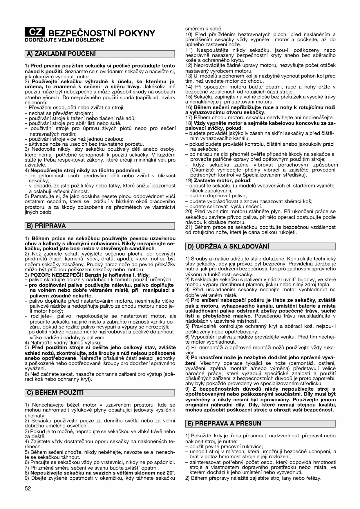 návodu k motoru, přitáhněte páku brzdy nože (1) k rukojeti a rázně potáhněte za rukoje startovacího lanka (2). Lepšího vzhledu posečeného trávníku dosáhnete, když plochu posečete při stejně nastavené výšce sečení ve dvou navzájem kolmých směrech. RADY PRO PÉČI O TRÁVNÍK Každý druh trávy se vyznačuje odlišnými vlastnostmi, a proto může být zapotřebí použít pro péči o trávník různé způsoby; pokaždé si přečtěte pokyny uvedené v baleních osiv, týkající se výšky sečení vzhledem k podmínkám růstu v dané oblasti. Je třeba mít stále na paměti, že větší část trávy je složena ze stébla a jednoho nebo více listů. Při úplném odseknutí listů dojde k poškození trávníku a obnovení růstu bude mnohem obtížnější. Všeobecně platí následující pokyny: – příliš nízké sečení způsobuje vytrhávání a prořídnutí travnatého porostu, charakterizované „skvrnitým“ vzhledem; – v létě musí být sečení vyšší, aby se zabránilo vysušení terénu; – nesekejte mokrou trávu; mohlo by to způsobit snížení účinnosti nože následkem zachytávání trávy na noži a vytrhávání travnatého porostu; – v případě mimořádně vysoké trávy je vhodné provést první sečení s maximální dovolenou výškou stroje a poté provést druhé sečení až po dvou nebo třech dnech. Po dokončení práce uvolněte páku brzdy (1) a odpojte koncovku zapalovací svíčky (2). POČKEJTE, AŽ SE ZASTAVÍ NŮŽ, dříve než provedete jakoukoli manipulaci se sekačkou. DŮLEŽITÉ – Pravidelná a pečlivá údržba sekačky je nezbytná pro zachování výkonu a bezpečnosti stroje.