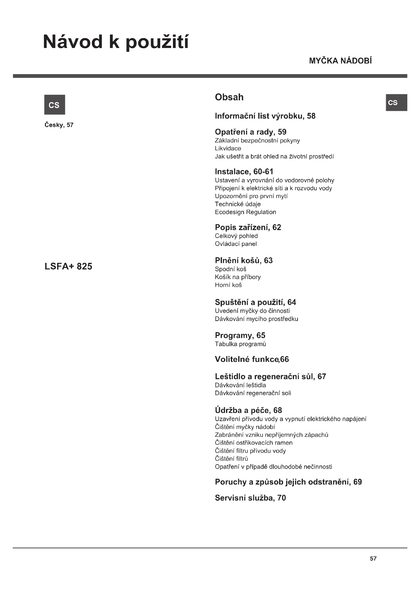Obsah Informační list výrobku, 58 Opatření a rady, 59 Základní bezpečnostní pokyny Likvidace Jak ušetřit a brát ohled na životní prostředí Instalace, 60-61 Ustavení a vyrovnání do vodorovné polohy Připojení k elektrické síti a k rozvodu vody Upozornění pro první mytí Technické údaje Ecodesign Regulation Popis zařízení, 62 Celkový pohled Ovládací panel Plnění košů, 63 Spodní koš Košík na příbory Horní koš Spuštění a použití, 64 Uvedení myčky do činnosti Dávkování mycího prostředku Programy, 65 Tabulka programů Volitelné funkce ,66 Leštidlo a regenerační sůl, 67 Dávkování leštidla Dávkování regenerační soli Údržba a péče, 68 Uzavření přívodu vody a vypnutí elektrického napájení Čištění myčky nádobí Zabránění vzniku nepříjemných zápachů Čištění ostřikovacích ramen Čištění ltru přívodu vody Čištění ltrů Opatření v případě dlouhodobé nečinnosti Poruchy a způsob jejich odstranění, 69 Servisní služba, 70CS