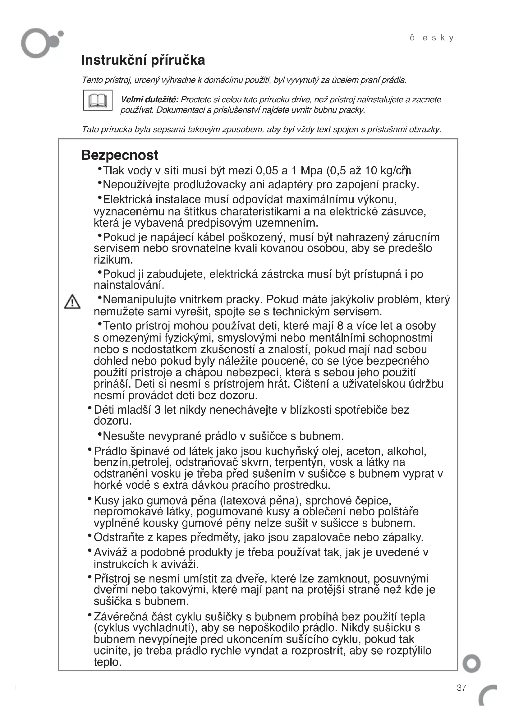 - Závěrečná část cyklu sušičky s bubnem probíhá bez použití tepla (cyklus vychladnutí), aby se nepoškodilo prádlo. Nikdy sušicku s bubnem nevypínejte pred ukoncením sušícího cyklu, pokud tak uciníte, je treba prádlo rychle vyndat a rozprostrít, aby se rozptýlilo teplo. Tento prístroj, urcený výhradne k domácímu použití, byl vyvynutý za úcelem praní prádla. Velmi duležité: Proctete si celou tuto prírucku dríve, než prístroj nainstalujete a zacnete používat. Dokumentaci a príslušenství najdete uvnitr bubnu pracky. Tato prírucka byla sepsaná takovým zpusobem, aby byl vždy text spojen s príslušnmi obrazky. Bezpecnost38 č esky