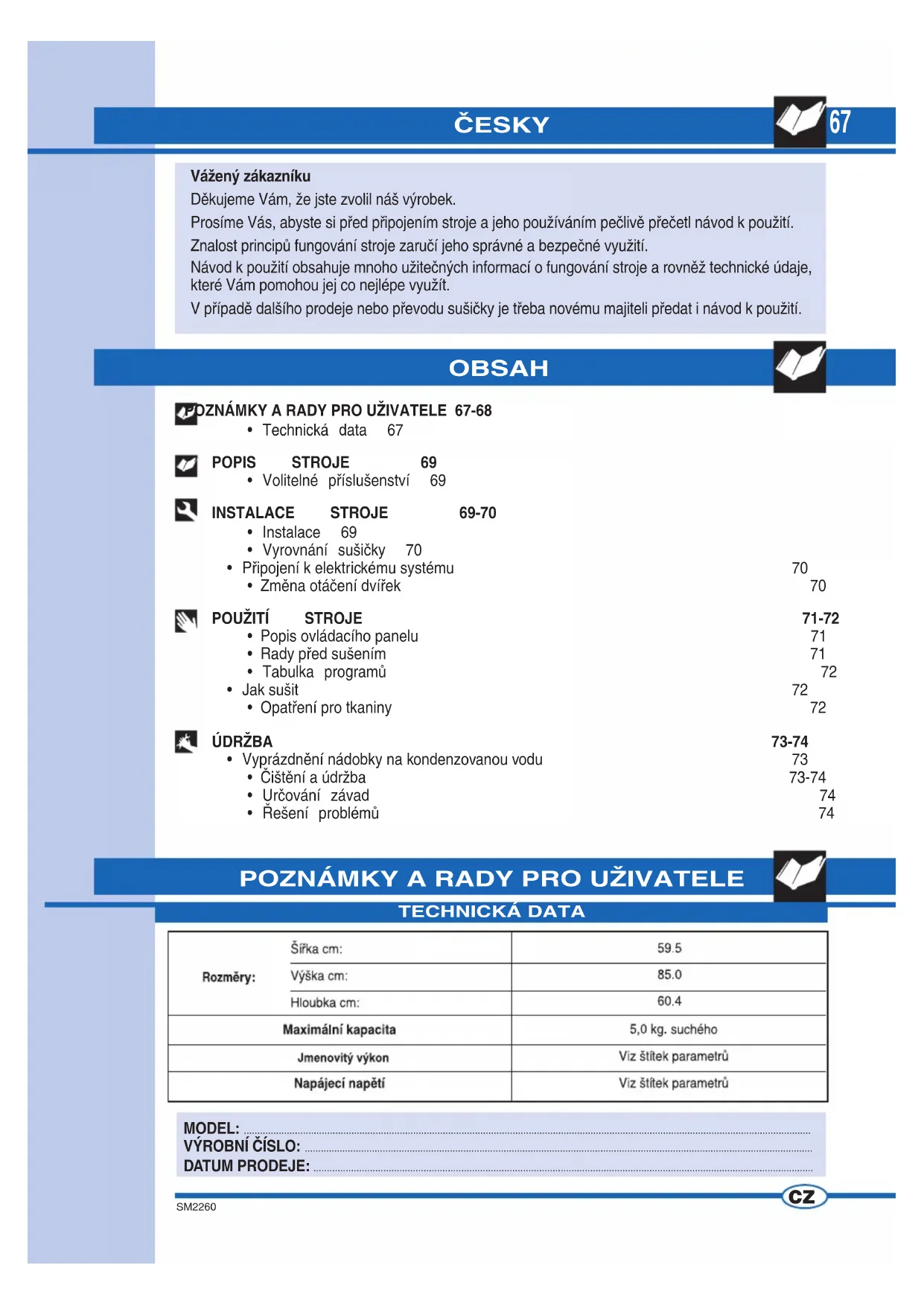 - Řešení problémů 7468 SM2260 POZNÁMKY A RADY PRO UŽIVATELE ▼ Tento přístroj musí být používán pouze jako sušička k domácímu použití. Jakékoliv jiné použití přístroje je nevhodné a proto nebez- pečné. ▼ Uchovávejte tuto příručku stále v blízkosti sušičky, aby bylo možné ji v případě potřeby rychle použít. ▼ Jakékoliv provádění úprav či pokusy o úpravy mohou být pro uživatele nebezpečné a mohou výrobek poškodit. ▼ Při dodání elektrospotřebiče zkontrolujte, zda nedošlo k jeho poškození během přepravy. V případě, že na přístroji zjistíte závady, okam- žitě se obraťte na prodejce. ▼ Nepokládejte na sušičku prádlo či jiné věci. ▼ Při umísťování přístroje zkontrolujte, zda napájecí kabel není ohnutý nebo stlačený. Kabel musí být přístupný pro případné zása- hy. ▼ Po použití elektrospotřebiče vždy zavírejte dveře. ▼ Tímto se zabrání dětem, aby se mohly opřít o dvířka a sušičku převrhnout. ▼ Děti nesmí používat přístroj bez dozoru. ▼ V sušičce nesušte špinavé prádlo. ▼ Nikdy nesušte prádlo, které bylo zašpiněno lát- kami jako kuchyňské oleje, nafta, aceton, líh, benzín, petrolej, čistící prostředky, terpentýn, vosky. ▼ Tyto látky odstraňte tím, že prádlo před vložením do sušičky vyperete v teplé vodě s větším množstvím pracího prášku. ▼ Nesušte materiály jako gumová pěna, latex, pláštěnky, nepropustné látky, gumové kober- ce, předměty, oděvy nebo polštářky vyrobené z bloků gumové pěny, neboť tyto materiály by se mohly rozpadnout a poškodit ostatní prádlo nebo i vlastní elektrospotřebič. ▼ Změkčovadla tkanin nebo podobné přípravky je třeba používat podle návodu k použití při- loženého k výrobku. ▼ V případě, že elektrospotřebič prodáte nebo darujete, nezapomeňte k němu přiložit i tuto příručku, která umožní novému majiteli použí- vat sušičku správně a bezpečně. ▼ Případné závady na elektrospotřebiči se nesnažte opravovat sami, protože opravy prováděné nekvalifikovaným personálem by mohly přístroj poškodit a zanikl by nárok na záruční opravy. ▼ Opravy přístroje mohou být prováděny pou- ze autorizovaným personálem v servisních střediscích. Při opravách musí být používány pouze originální náhradní díly. ▼ Před naplněním sušičky prádlo dobře odstřeďte a vyždímejte. Dobře odstředěné prádlo se usuší rychleji. ▼ Po každém použití sušičky dobře vyčistěte filtr, aby bylo umožněno perfektní proudění vzduchu. ▼ Nepřipojujte a neodpojujte elektrickou zástrč- ku ze zásuvky mokrýma rukama. ▼ Stroj musí být připojen k elektrické zásuvce vybavené uzemněním a odpovídající bez- pečnostním požadavkům. ▼ Je zakázáno připojovat stroj k elektrické zásuvce pomocí prodlužovaček nebo kom- binovaných zástrček. ▼ Nevystavujte přístroj působení atmosféric- kých vlivů. ▼ Při provádění revizí a čištění přístroje vždy pamatujte na to, že přístroj musí být odpojen z elektrické zásuvky. ▼ Při odpojování stroje z elektrické zásuvky netahejte za kabel, ale za zástrčku. ▼ Tento přístroj je označen v souladu s evrop- skou směrnicí 2002/96/EC, Waste Electrical and Electronic Equipment (WEEE). Zajistěte, aby likvidace výrobku proběhla řádným způsobem. Uživatel tím pomáhá zamezit potenciálním negativním vlivům na životní prostředí a zdraví. Symbol na výrobku či v doprovodné dokumentaci označuje, že tento výrobek není považován za normální domácí odpad a že je třeba jej odevzdat do příslušné sběrny elektrických a elektronických spotřebičů. Likvidaci spotřebiče je třeba provést v soula- du s platnými místními předpisy pro likvidaci odpadu. Další informace o zpracování, dalším použití a recyklaci tohoto spotřebiče Vám podá příslušný místní orgán, sběrná služba domácího odpadu nebo prodejce, u něhož byl výrobek zakoupen. Upozornění!!! Povrch, na němž se při chodu stroje objeví tento sym- bol, se může zahřívat. VÝROBCE SE ZŘÍKÁ JAKÉKOLIV ODPO- VĚDNOSTI ZA PŘÍPADNÉ ZÁVADY ZPŮSO- BENÉ NEDODRŽOVÁNÍM BEZPEČNOST- NÍCH PŘEDPISŮ A NÁVODU K POUŽITÍ CZ69 SM2260