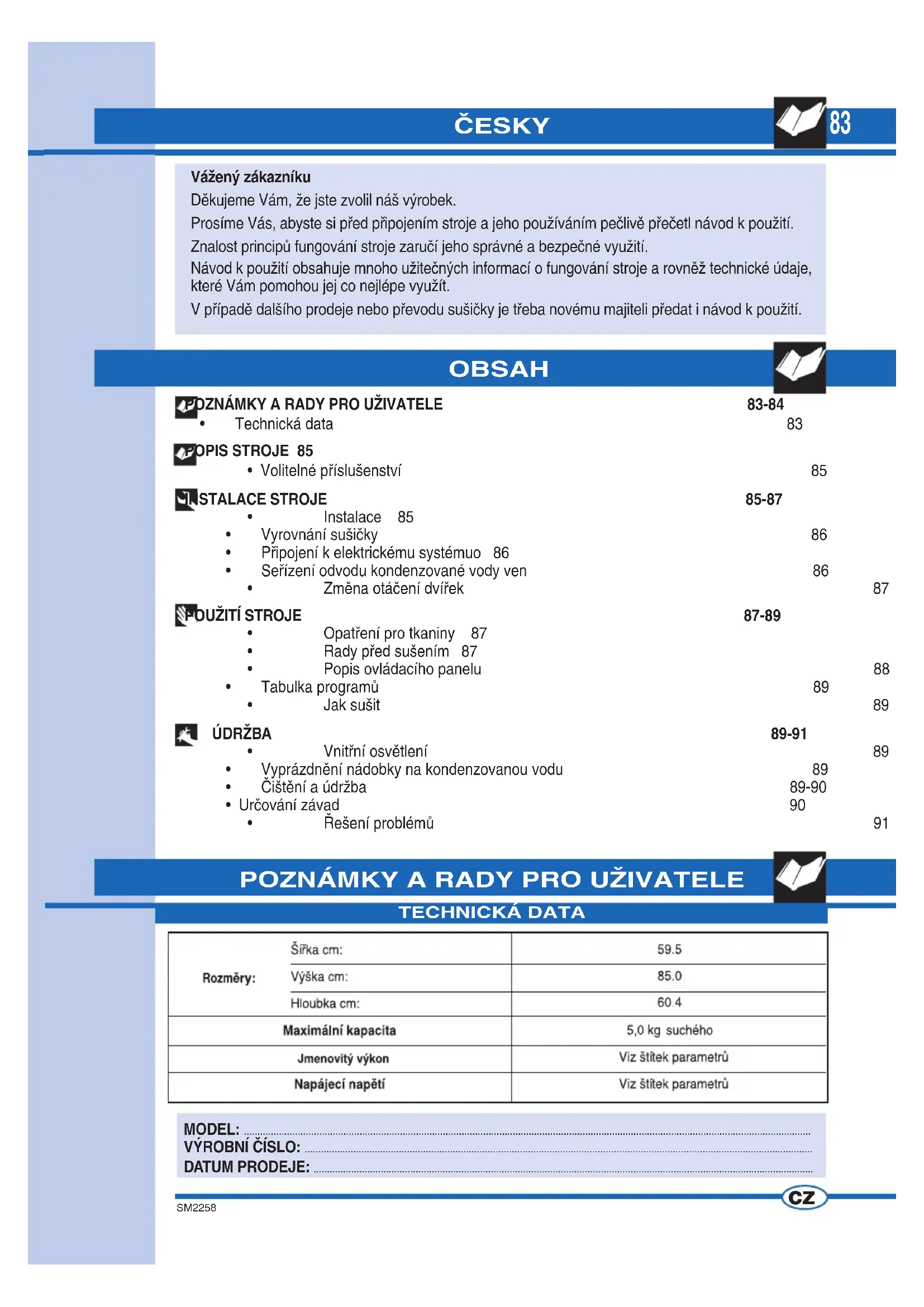 SM2258 NOTATKI83 SM2258 OBSAH MODEL: ................................................................................................................................................................................................................... VÝROBNÍ ČÍSLO: ............................................................................................................................................................................................. DATUM PRODEJE: .......................................................................................................................................................................................... ČESKY Vážený zákazníku Děkujeme Vám, že jste zvolil náš výrobek. Prosíme Vás, abyste si před připojením stroje a jeho používáním pečlivě přečetl návod k použití. Znalost principů fungování stroje zaručí jeho správné a bezpečné využití. Návod k použití obsahuje mnoho užitečných informací o fungování stroje a rovněž technické údaje, které Vám pomohou jej co nejlépe využít. V případě dalšího prodeje nebo převodu sušičky je třeba novému majiteli předat i návod k použití.