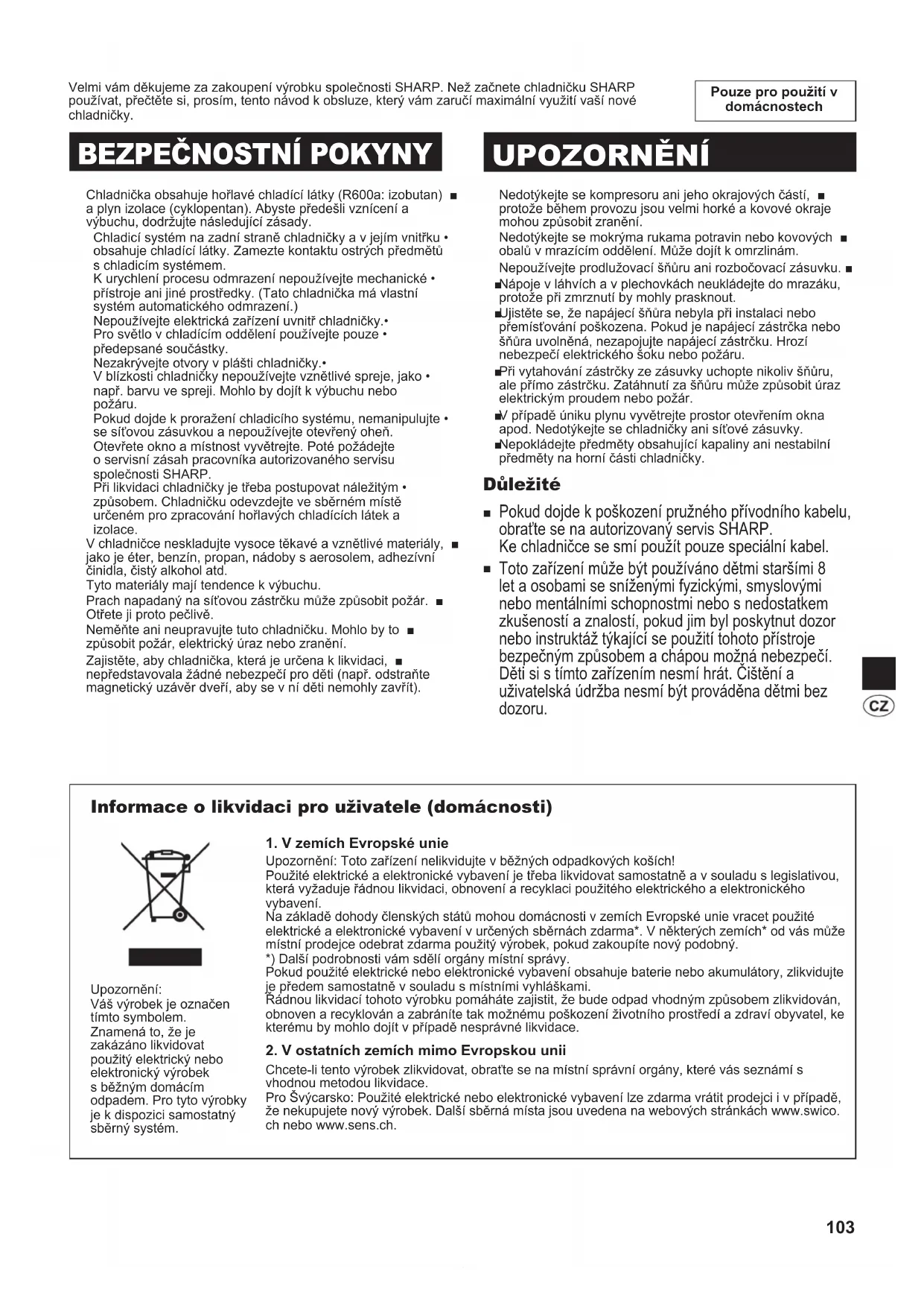 Než zavoláte opraváře, zkontrolujte si následující body. Problém Řešení Vnější strana skříně je horká na dotek. Je to zcela normální. Horké potrubí slouží k zabránění vzniku orosení. Když je chladnička hlučnější. Je normální, aby chladnička vydávala následující zvuky. Značný hluk způsobený kompresorem při zahájení provozu • --- Zvuk bude tišší po chvíli. Značný hluk způsobený kompresorem jednou denně • --- Provozní zvuk vyvolaný bezprostředně po provedení automatického odmrazení. Zvuk proudící tekutiny (bublavý nebo šumivý zvuk) • --- Zvuk proudícího chladiva v trubkách (zvuk může být čas od času hlasitější). Praskavý nebo křupavý zvuk, skřípavý zvuk • --- Zvuk vytvořený roztahováním a smršťováním vnitřních stěn a vnitřních součástí během chlazení. Uvnitř nebo vně chladničky se vytváří námraza nebo orosení. Může k tomu docházet v některém z následujících případů. Námrazu otřete vlhkou látkou, orosení suchou látkou. Při vysoké okolní vlhkosti.• Při častém otvírání a zavírání dveří.• Při uložení potravin s vysokým obsahem vlhkosti. (Je třeba je zabalit.)• Potraviny v chladicím oddělení jsou zmrzlé. Není chladnička provozována dlouhou dobu s nastavenou teplotou chladničky na 0°C?• Není chladnička provozována dlouhou dobu s nastavenou teplotou mrazáku na -21°C?• Nízká okolní teplota může způsobit, že umístěné potraviny zmrznou, i když je Nastavení • teploty chladničky nastavené na 6°C. V oddělení je cítit zápach. Potraviny se silným odérem je třeba zabalit.• Jednotka na odstraňování zápachu nemůže odstranit všechen zápach.• Dotykový ovládací panel nefunguje. K tomuto může dojít v jednom z následujících případů. Panel nebo váš prst jsou znečištěny mastnotou, olejem atp.• Panelu se dotýkáte rukou v rukavici, prstem v obvazu, nehtem či jiným objektem.• Na tlačítkách je přilepena nálepka či lepící páska.• Tlačítka se dotýkáte o kousek vedle.• Neposkytujete tlačítkům dostatek času, aby zareagovala.• JESTLIŽE STÁLE POŽADUJETE OPRAVÁŘE Obraťte se na nejbližší autorizovaný servis společnosti SHARP. (B504)-E.indb 111 2013/11/01 12:36:45112 Len na používanie v domácnosti Ďakujeme vám, že ste si kúpili práve výrobok značky SHARP. Pred použitím chladničky značky SHARP si láskavo preštudujte návod na obsluhu. Nová chladnička vám tak prinesie najväčší úžitok. Táto chladnička obsahuje horľavé chladivo (R600a: izobután) ■ a plyn na rozpínanie izolácie (cyklopentán). Dodržiavajte nasledovné pravidlá, aby nedošlo k zapáleniu a výbuchu. Chladiaci systém v zadnej časti a vo vnútri chladničky • obsahuje chladivo. Nedovoľte, aby do kontaktu s chladiacim systémom prišli akékoľvek ostré predmety. Nepoužívajte mechanické zariadenie, či iný nástroj • urýchlujúci rozmrazovanie. (Táto chladnička má zavedený automatický rozmrazovací systém.) Nepoužívajte žiadne elektrické prístroje vo vnútri chladničky.• Pre priestor chladničky používajte len stanovené osvetlenie.• Nezakrývajte otvory cirkulácie chladničky.• V blízkosti chladničky nepoužívajte horľavé spreje, ako sú • farby v spreji. Môžu spôsobiť výbuch alebo požiar. Ak by došlo k prederaveniu chladiaceho systému, • nedotýkajte sa sieťovej zásuvky a nepoužívajte otvorený oheň. Otvorte okno a vyvetrajte danú miestnosť. Potom požiadajte autorizovaného servisného zástupcu spoločnosti SHARP o servis. Táto chladnička by sa mala zlikvidovať požadovaným • spôsobom. Vezmite chladničku na recyklačné miesto so zameraním na horľavé chladivá a plyny na rozpínanie izolácie. Neodkladajte do chladničky vysoko prchavé horľavé ■ materiály ako éter, benzín, propán, plechovky s aerosólom, lepidlo, čistý lieh atď. Tieto materiály môžu spôsobiť výbuch. Starostlivo utierajte prach usadený na sieťovej vidlici. Mohol ■ by spôsobiť požiar. Je zakázané chladničku upravovať. Chladničku môžu ■ rozoberať alebo opravovať iba servisní technici. V opačnom prípade hrozí nebezpečenstvo vzniku požiaru, úrazu elektrickým prúdom alebo iného úrazu. Zabezpečte, aby chladnička nepredstavovala žiadne ■ nebezpečenstvo pre deti počas uskladnenia na likvidáciu. (Napr. odstráňte magnetické tesnenie dverí, aby sa predišlo zabuchnutiu detí.) UPOZORNENIE POZOR Nedotýkajte sa kompresora alebo jeho periférnych častí ■ z dôvodu ich veľkej teploty počas prevádzky a tiež kvôli kovovým hranám, ktoré môžu spôsobiť poranenie. Nedotýkajte sa potravín alebo kovových nádob v priestore ■ mrazničky mokrými rukami. Môže to spôsobiť omrzliny. Nepoužívajte predlžovaciu šnúru ani adaptérovú zástrčku. ■ Neodkladajte do mrazničky nápoje vo fľašiach a konzervách, ■ pretože obsah zamrzne a fľaše alebo konzervy môžu prasknúť. Presvedčte sa, či počas montáže alebo premiestňovania ■ nedošlo k poškodeniu sieťovej zástrčky. Ak sú kontakty sieťovej zástrčky alebo kábla uvoľnené, nezasúvajte sieťovú zástrčku do sieťovej zásuvky. Hrozí nebezpečenstvo úrazu elektrickým prúdom. Sieťovú vidlicu nevyťahujte za kábel, ale za vidlicu. Ťahanie ■ sieťového kábla môže spôsobiť úraz elektrickým prúdom alebo požiar. V prípade úniku plynu vetrajte miestnosť otvoreným oknom a ■ pod. Nedotýkajte sa chladničky ani elektrického prívodu. Neodkladajte na chladničku žiadne nádoby s kvapalinami ■ alebo nestabilné predmety.