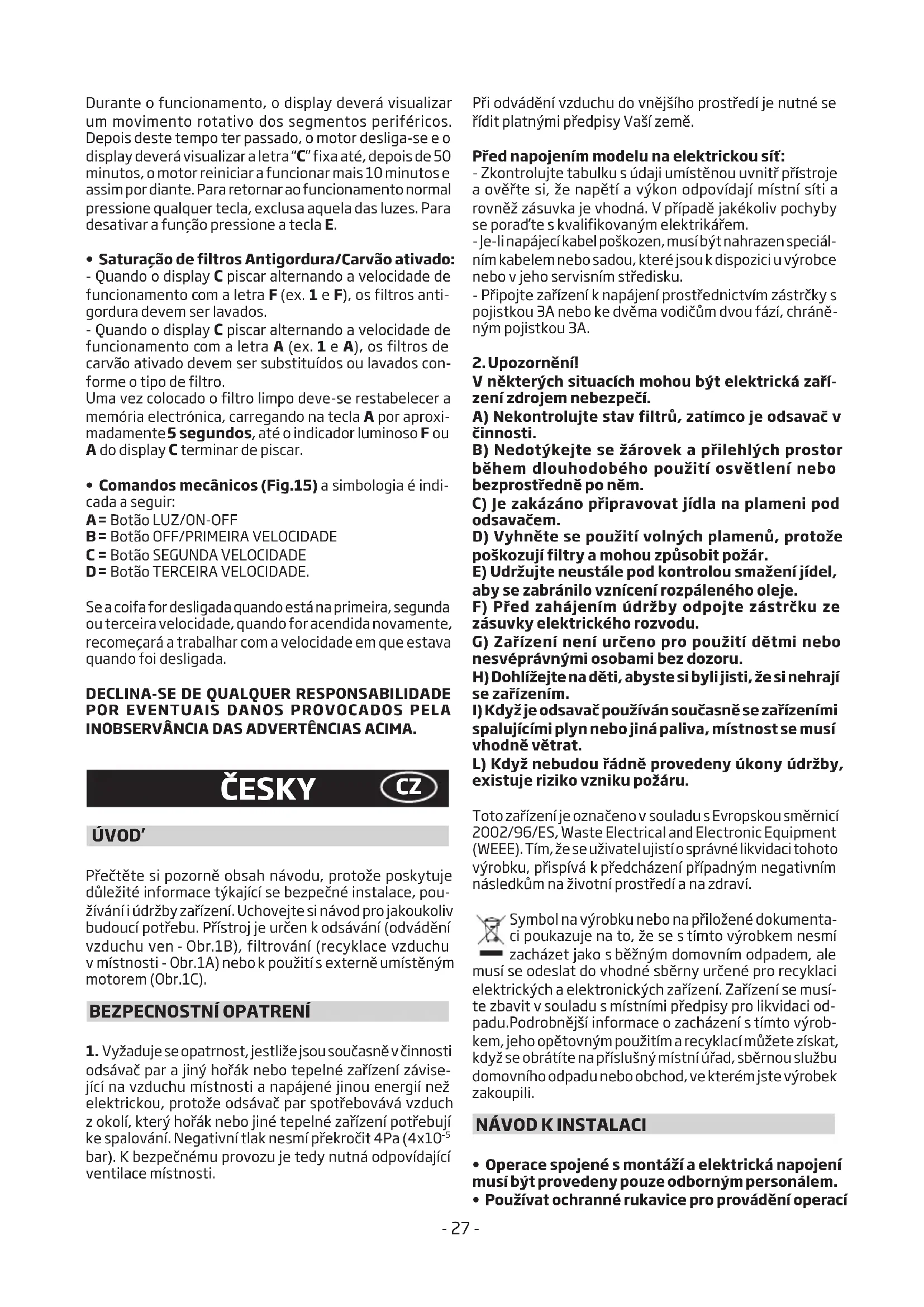 spalujícími plyn nebo jiná paliva, místnost se musí vhodně větrat. L) Když nebudou řádně provedeny úkony údržby, existujerizikovznikupožáru. Toto zařízení je označeno vsouladu s Evropskou směrnicí 2002/96/ES, Waste Electrical and Electronic Equipment (WEEE). Tím, že se uživatel ujistí o správné likvidaci tohoto výrobku, přispívá kpředcházení případným negativním následkům na životní prostředí a na zdraví. Symbol na výrobku nebo na přiložené dokumenta- ci poukazuje na to, že se stímto výrobkem nesmí zacházet jako sběžným domovním odpadem, ale musí se odeslat do vhodné sběrny určené pro recyklaci elektrických a elektronických zařízení. Zařízení se musí- te zbavit vsouladu smístními předpisy pro likvidaci od- padu.Podrobnější informace o zacházení stímto výrob- kem, jeho opětovným použitím a recyklací můžete získat, když se obrátíte na příslušný místní úřad, sběrnou službu domovního odpadu nebo obchod, ve kterém jste výrobek zakoupili.
