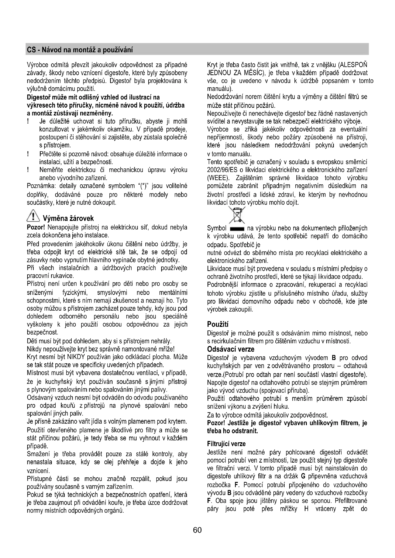 Vyrobce odmita prvizit jakoukoliv opdovednost za pripadne zavady, skody nebo vzniceni digestore, ktere byly zpúsobeny nedodrzenim těchto prédispů. Digestor byla projektována k vylucné domácimu použiti.