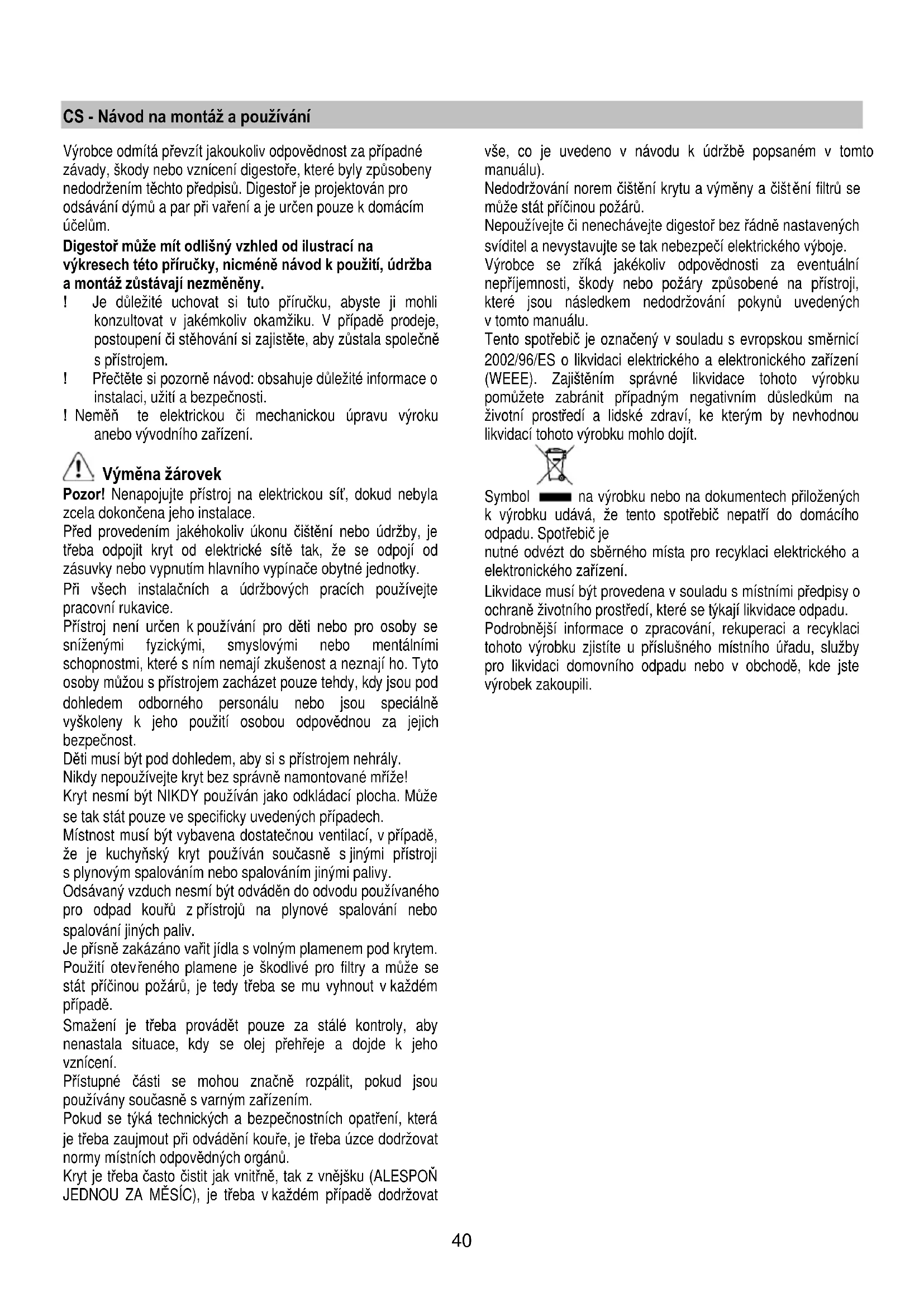 nedåt. 4.Tryck hakarna utåt och lyft dem (fig. 5). Ta ur filtret. Efter en noggrann rengöring av ramen skall ett nytt filter med korrekta dimensioner sättas i. Kontrollera att de kulörta markeringarna på filtret är vända inåt. Kolfilter (gäller endast filterversionen) Kolfiltret fångar upp obehagliga odörer som uppstår i samband med matlagningen. Kolfiltret mättas efter en mer eller mindre lång tidsperiod beroende på i vilken utsträckning fläkten används, på typen av matlagning och hur regelbundet fettfiltren rengörs. Det är under alla händelser nödvändigt att ersätta kolfilterpatronen minst var 4 månad. Filtret kan INTE rengöras eller återanvändas. Runda Kolfilter Applicera ett filter på varje sida för att täcka motorfläkthjulets båda skyddsgaller och vrid dem därefter medurs. Vid nedmontering vrider man filtret moturs. Byte av Lampor Koppla ur apparaten från elnätet. Varning! Kontrollera att lamporna har svalnat innan ni vidrör dem. Byt den trasiga lampan. Använd enbart halogena kronljuslampor Ø35mm E14 28W. I det fall belysningen inte fungerar, kontrollera att lamporna är korrekt iskruvade i sitt säte innan ni kontaktar det tekniska servicekontoret.37 HR - Uputstva za montažu i za uporabu Strogo se pridržavajte uputstava koje donosi ovaj priručnik. Otklanjamo bilo kakvu odgovornost za eventualne nezgode,smetnje ili požar na aparatu koji proizlaze iz nepoštivanja uputstava koje donosi ovaj priručnik. Kuhinjska napa ima funkciju usisavanja dima i pare za vrijeme kuhanja te je namijenjena samo kućanskoj uporabi. Vanjski izgled kuhinjske nape se može ponešto razlikovati od onog što smo opisali i ilustrirali u crtežima ovog priručnika, ali u svakom slučaju uputstva za uporabu, održavanje iste i instalacija ostaju nepromijenjena. ! Važno je sačuvati ovaj priručnik da biste ga mogli konzultirati u svakom trenutku. U slučaja da prodate ovaj proizvod , poklonite ili da se preselite uvjerite se da on bude uvijek zajedno sa proizvodom. ! Pažljivo pročitajte uputstva: u njima se nalaze važne informacije o instalaciji, uporabi i sigurnosti. ! Ne izvršavajte nikakve mehaničke ili električne varijacije (izmjene ) na proizvodu ili na cijevima za izbacivanje. Upozorenja Pozor! Ne priključujte aparat na električnu mrežu sve dok niste kompletno završili sa instaliranjem. Prije bilo kakvog čišćenja ili održavanja, iskopčajte kuhinjsku napu s električne mreže vadeći utikač ili isključujući opći kućni prekidač/sklopku. Ovaj aparat nije namijenjen uporabi od strane djece ili osoba koje imaju smanjene fizičke,mentale ili osjetne sposobnosti, i kojima nedostaje iskustva i saznanja osim ako oni nisu nadgledani i obučeni kako upotrebljavati aparat od osoba koje su odgovorne za njihovu sigurnost. Trebate paziti na djecu da se ne igraju s aparatom . Na upotrebljavajte nikada kuhinjsku napu bez da je pregrada ili mrežica pravilno montirana! Ne upotrebljavajte NIKADA napu kao podlogu na koju ćete polagati predmete ukoliko to nije jasno naglašeno. Prostorija treba imati dovoljno provjetravanje, kada je kuhinjska napa upotrebljavana istovremeno s drugim aparatima na plinski pogon ili na drugo gorivo. Zrak koji se usisava ne smije biti proveden u cijev koja se koristi za izbacivanje dimova koje proizvode ostali aparati na plinski pogon ili drugo gorivo. Strogo se zabranjuje pripremanje hrane na plamenu ispod nape. Korištenje nekontroliranog plamena je štetno za filtre te može izazvati požar ,u svakom slučaju bi ga trebalo izbjegavati. Držite pod kontrolom postupak pri prženju kako biste izbjeglii da se pregrijano ulje zapali. Neki dijelovi se mogu znatno zagrijati kada se koriste zajedno sa aparatima za kuhanje. Što se tiče tehničkih mjera kojih se treba pridržavati s obzirom na dimove, strogo se pridržavajte pravilnika nadležnih lokalnih vlasti . Kuhinjska napa se treba često čistiti i prati i izvana i iznutra (BAREM JEDANPUT NA MJESEC, poštivajte sve ono što je navedeno u uputstvima za održavanje koje donosi ovaj priručnik). Ne poštivanje propisa o čišćenju nape i zamjene i čišćenja filtra povećava opasnost od požara. Ne upotrebljavajte niti ostavljajte kuhinjsku napu bez da ste pravilno montirali lampe jer postoji rizik od električnog udara. Otklanjamo bilo kakvu odgovornost radi eventualnih neprilika,štete ili požara koje bi mogao izazvati aparat a koje proizlaze iz nepoštivanja uputstava koje donosi ovaj priručnik. Ovaj aparat je označen u skladu s Europskim pravilima 2002/96/EC, Waste Electrical and Electronic Equipment (WEEE). Provjerite jeste li odveli na otpad ovaj proizvod u skladu s lokalnim pravilima, korisnik doprinosi sprečavanju i uklanjanju eventualnih negativnih posljedica za okolinu i za zdravlje. Ovaj simbol na proizvodu ili na dokumentaciji koja ga prati govori da ovaj proizvod ne smije tretiran kao ostali kuhinjski otpad nego treba biti odveden na odgovarajući sabirni centar gdje se odbacuju električni i elektronski uređaji. Odbacite takve uređaje tako da se pridržavate lokalnih pravila za uklanjanje otpadaka. Za dobijanje daljnjih informacija o odbacivanju ovakvih aparata, obratite se lokalnim uredima, sabirnim mjestima za sakupljanje otpada ili trgovini u kojoj ste kupili ovaj proizvod.38 Korištenje Kuhinjska napa je napravljena kako bi se koristila u usisnojj verziji s vanjskim pražnjenjem (evakuacijom) ili pomoću filtra koji kruži u unutrašnjosti prostorije. Verzija za isisivanje Para se izbacuje vani uz pomoć cijevi za odsis koja se pričvršćuje za spojnu prirubnicu. Dijametar cijevi za odsis treba biti jednak dijametru karike za povezivanje. Upozorenje! Cijev za odsis nije priložena s opremom te se treba kupiti. U vodoravnom dijelu, cijev se treba lagano podizati prema gore ( otprilike 10°) na način da izbaci što je lakše moguće zrak prema vani. Ako je kuhinjska napa opremljena karbonskim filterima, oni se trebaju ukloniti. Povežite kuhinjsku napu i