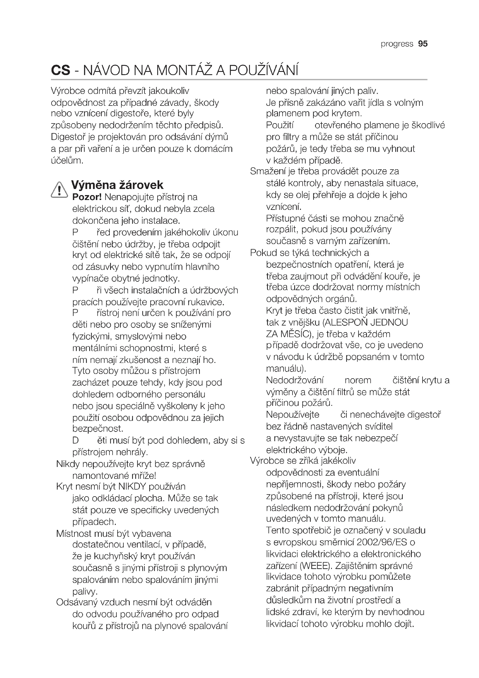 řípadě dodržovat vše, co je uvedeno v návodu k údržbě popsaném v tomto manuálu). Nedodržování norem čištění krytu a výměny a čištění filtrů se může stát příčinou požárů. Nepoužívejte či nenechávejte digestoř bez řádně nastavených svíditel a nevystavujte se tak nebezpečí elektrického výboje. Výrobce se zříká jakékoliv odpovědnosti za eventuální nepříjemnosti, škody nebo požáry způsobené na přístroji, které jsou následkem nedodržování pokynů uvedených v tomto manuálu. Tento spotřebič je označený v souladu s evropskou směrnicí 2002/96/ES o likvidaci elektrického a elektronického zařízení (WEEE). Zajištěním správné likvidace tohoto výrobku pomůžete zabránit případným negativním důsledkům na životní prostředí a lidské zdraví, ke kterým by nevhodnou likvidací tohoto výrobku mohlo dojít.96 progress Symbol na výrobku nebo na dokumentech přiložených k výrobku udává, že tento spotřebič nepatří do domácího odpadu. Spotřebič je nutné odvézt do sběrného místa pro recyklaci elektrického a elektronického zařízení. Likvidace musí být provedena v souladu s místními předpisy o ochraně životního prostředí, které se týkají likvidace odpadu. Podrobnější informace o zpracování, rekuperaci a recyklaci tohoto výrobku zjistíte u příslušného místního úřadu, služby pro likvidaci domovního odpadu nebo v obchodě, kde jste výrobek zakoupili. Použití Digestoř je projektována k použití v odsávací verzi s vnějším vývodem anebo ve fi ltrující verzi s vnitřním čištěním vzduchu . Instalace Tento typ digestoř musí být upevněn na stropě. Výrobek o velké hmotnosti, manipulace a instalace digestoře by měla být prováděna alespoň dvěma nebo více osobami. Minimální vzdálenost mezi podporou nádoby na varné ploše a nejnižší částí digestoře nesmí být menší než 40cm v případě elektrických sporáků 55cm v případě plynových či smíšených sporáků. Pokud návod na instalaci varného zařízení na plyn doporučují větší vzdálenost, je třeba se tímto pokynem řídit. Síťové napětí musí odpovídat napětí uvedenému na štítku s charakteristikamii umístěnému uvnitř krytu. Pokud je kryt vybaven přípojkou, stačí jej zapojit do zásuvky odpovídající stávajícím normám, která se nachází ve snadno dosažitelném prostoru i po provedené montáži. Pokud kryt není vybaven přípojkami (přímé připojení k síti) nebo se zásuvka nenachází ve snadno dosažitelném prostoru i po provedené montáži , je třeba použít dvojpólový vypínač odpovídající normám, který zaručí úplné odpojení od sítě v podmínkách kategorie přepětí III, v souladu s pravidly instalace. Pozor! Dříve než opět napojíte obvod digestoře na síťové napájení a ověříte správné fungování, zkontrolujte si vždy, že síťový kabel byl správně namontován. Digestoř je vybavena speciálním napájecím kabelem; v případě poškození kabelu vyžádejte si ho u servisní služby. Provoz V případě velmi intenzivní koncentrace kuchyňských par použijte maximální sací výkon. Doporučuje se zapnout digestoř 5 minut před zahájením vaření a vypnout ji cca 15 minut po ukončení vaření. T1T6 T2 T3 T4 T5 L1 L3 L2 L4 T1. osvětlení ON/OFF T2. Snížení rychlosti Stisknutím tlačítka “T2” se sníží rychlost ze stupně 4 (intenzívní) na rychlost 1. Stisknutím tlačítka “T2” během provozu za rychlosti 1 digestoř přejde do stavu OFF. T3. Zvýšení rychlosti Stisknutím tlačítka T3 digestoř přejde ze stavu OFF na rychlost 1. Stisknutím tlačítka (digestoř ve stavu ON) se zvýší rychlost motor ze stupně 1 na intenzívní (časovanou) rychlost. Rychlost 1 dioda L1 Rychlost 2 dioda L1+L2 Rychlost 3 diody L1+L2+L3 Intenzívní (časovaná) rychlost diody L1+L2+L3+L4 blikajíprogress 97 Poznámka: Rychlost 4 (intenzívní, časovaná) zůstává v provozu po dobu 5 minut, po tè se digestoř automaticky nastaví na rychlosti 2 T4. Časování rychlostí Časování rychlostí se nastavuje stisknutím tlačítka T4, po uplynutí nastaveného času se digestoř vypne. Časování je rozděleno násdiodaujícím způsobem: Rychlost 1 - 20 minut (dioda L1 bliká) Rychlost 2 - 15 minut (dioda L2 bliká) Rychlost 3 - 10 minut (dioda L3 bliká) Intenzívní rychlost - 5 minut (dioda L4 bliká) Během časovaného provozu stisknutím tlačítkai T2 digestoř vyjde z časované modality a sníží rychlost. Stisknutím tlačítka T3 digestoř vyjde z časované modality a zvýší rychlost. Stisknutím tlačítka T4 digestoř vyjde z časované modality a udrží si nastavenou rychlost. T5. Kontrolní tlačítko a konfigurace signalizace saturování filtrů: Viz pokyny v následujících odstavcích. T6. Odsávací motor ON/OFF: Stisknutím tlačítka T6 se digestoř vypne, bez ohledu v jaké rychlosti je v provozu. Je-li digestoř vypnuta (OFF) stisknutím tla čítka T6 digestoř začne fungovat v rychlosti 1. Signalizace fi ltru proti mastnotám Po 40 hodinách provozu dioda L1 bliká. Jakmile se objeví toto hlášení je třeba provést údržbu fi ltru proti mastnotám. K opětnému nastavení signalizace stiskněte tlačítko T5 po dobu 5”. (digestoř ve stavu ON). Digestoř pípne “BEEP” eadioda L1 přestane blikat. Signalizace fi ltru s uhlíkem Po 160 hodinách provozu dioda L2 bliká. Jakmile se objeví toto hlášení je třeba provést údržbu fi ltru s uhlíkem. K opětnému nastavení signalizace stiskněte tlačítko T5 po dobu 5”. (digestoř ve stavu ON). Digestoř pípne “BEEP” a dioda L2 přestane blikat. V případě současné signalizace obou fi ltrů L1 a L2 budou střídavě blikat. K opětnému nastavení dojde dvounásobným provedením výše uvedené procedury. První provedení opět nastaví signalizaci fi ltr