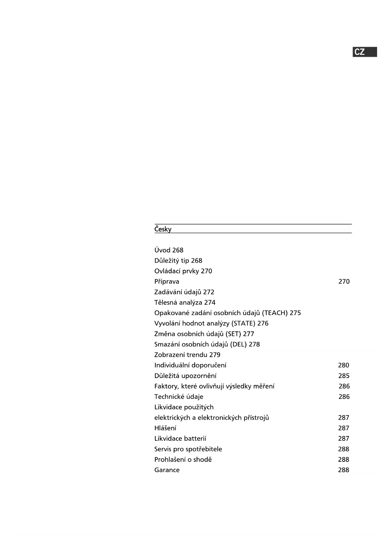 Společnost SOEHNLE nepřebírá odpovědnost za škody nebo ztráty způsobené prostřednictvím Body Balance, ani požadavky třetích osob. Tento výrobek je určen pouze k domácímu použití spotřebitelem. Není určen pro profesionální provoz v nemocnicích či zdravotnických zařízeních. Tento přístroj není vhodný pro osoby s elektronickými implantáty (kardiostimulátor atd.)