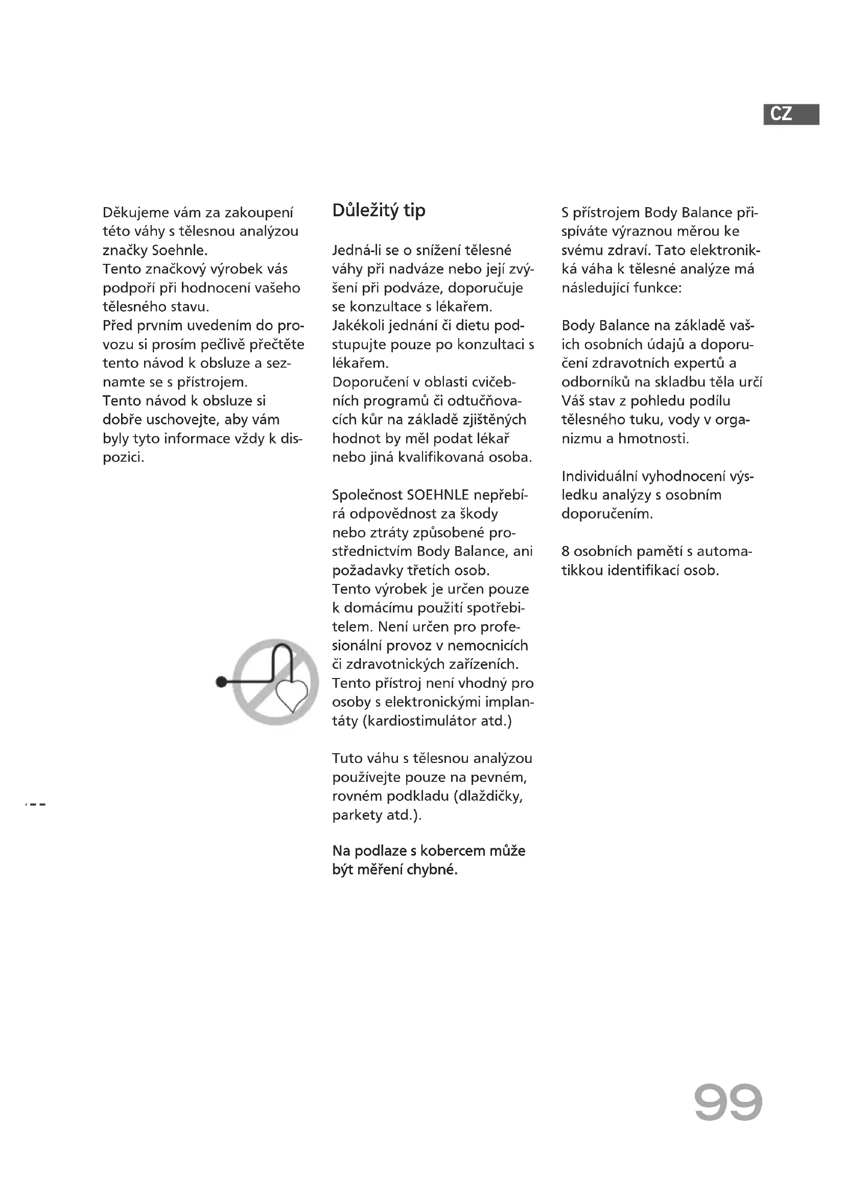 Spolecnost SOEHNLE neprebírá odpovednost za škody nebo ztraty zpúsobene prostrechnictvim Body Balance, ani požadavy tretich osob.