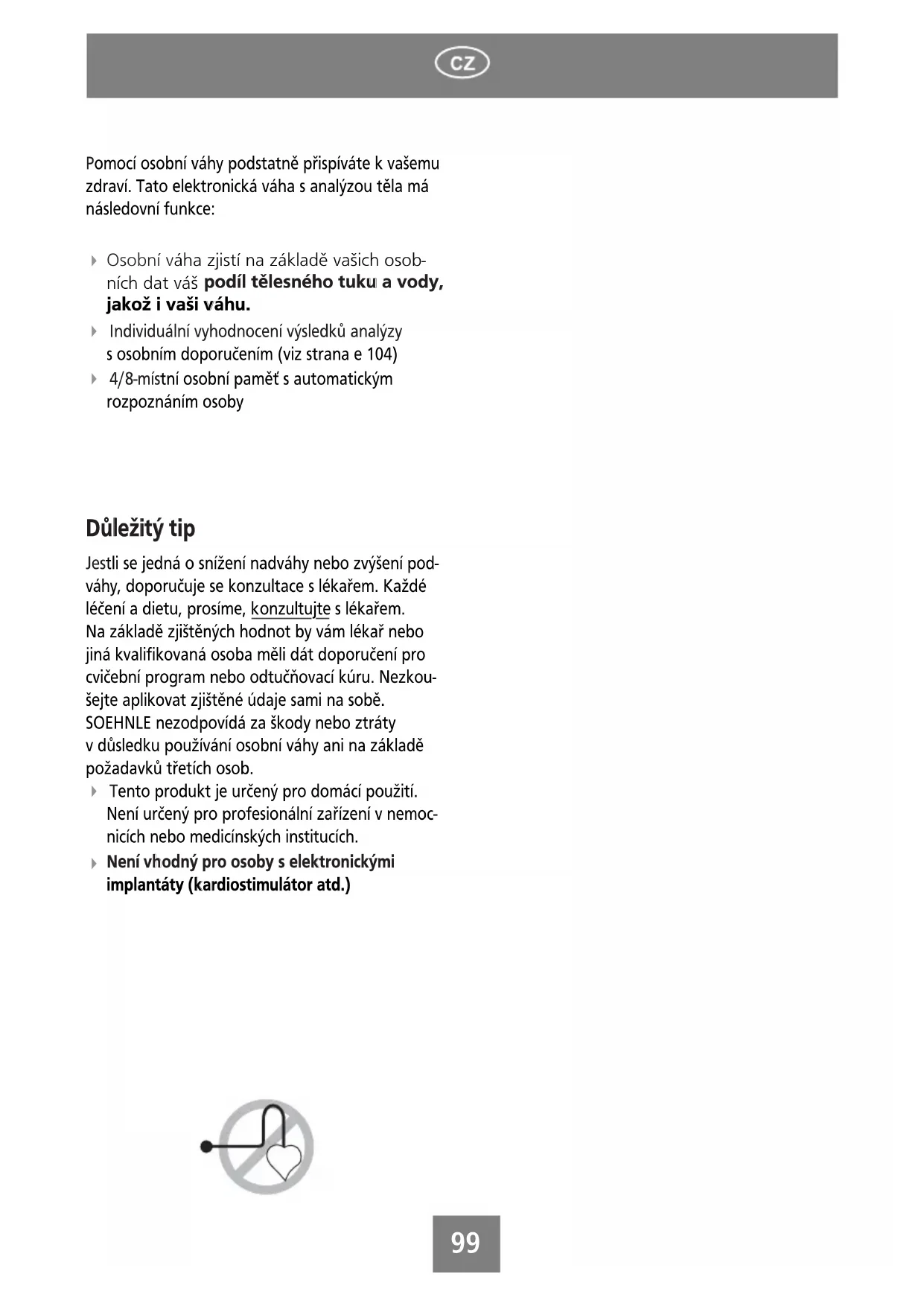 Jestli se jegnó o snizeni nadváhy nebo zvyşeni podváhy, doporučuje se konzultace s lékarem. Každé lečeni a dietu, prosime, konzultujte s lékarem. Na záklande zjištěnych hodnot by vám lékar nebo jiná kvalifikována osoba měli dát doporučeni pro cvičební program nebo odtučnovaci kúru. Nezkou-sejte aplikovat zjištěné udaje sami na sobě. SOEHNLE nezodpovída za škody nebo ztrát y dusledku použivání osobní váhy ani na záklande požadavků třetích osob.