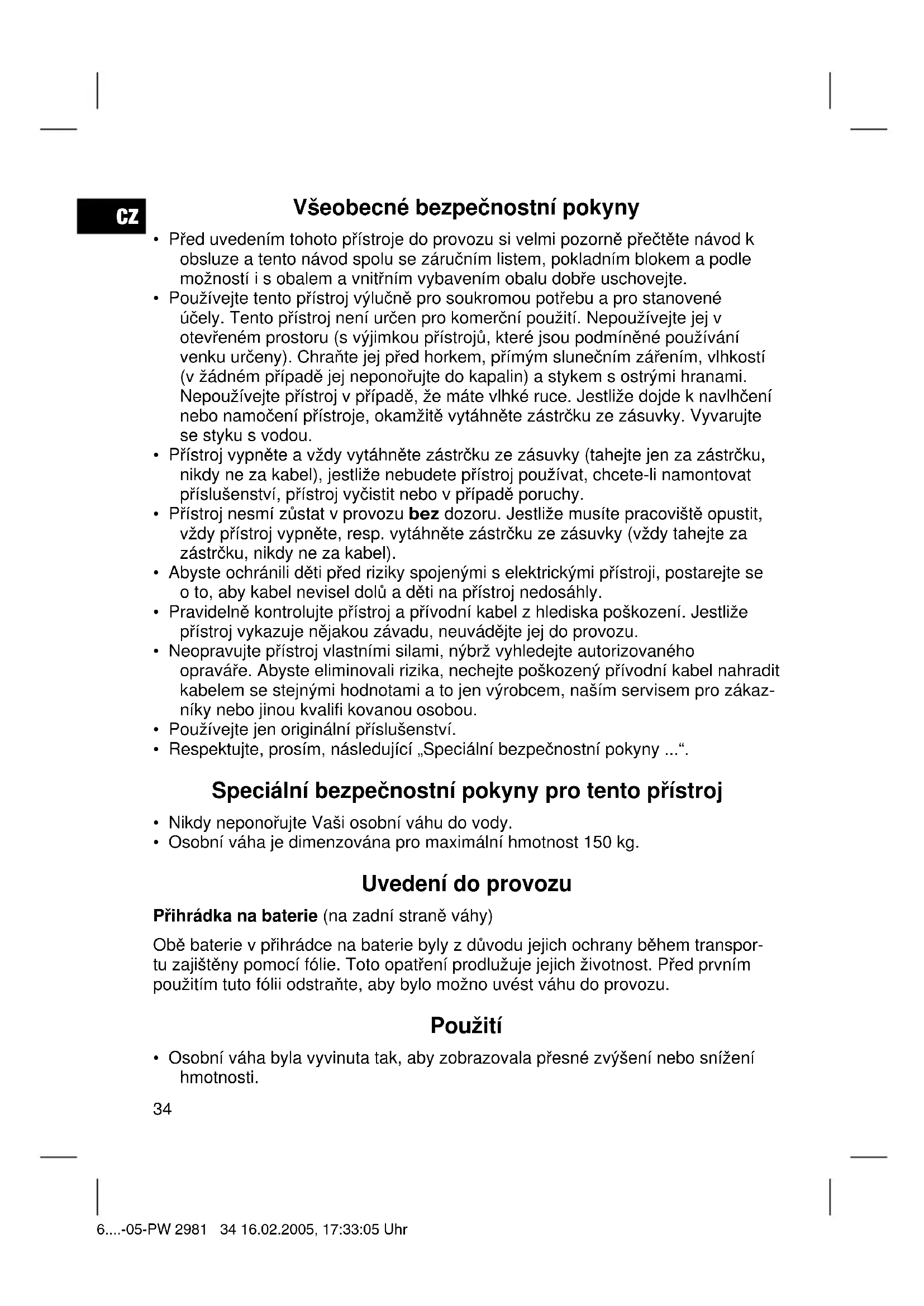 - Osobní váha byla vyvinuta tak, aby zobrazovala přesné zvýšení nebo snížení hmotnosti. 6....-05-PW 2981 34 16.02.2005, 17:33:05 UhrCZ