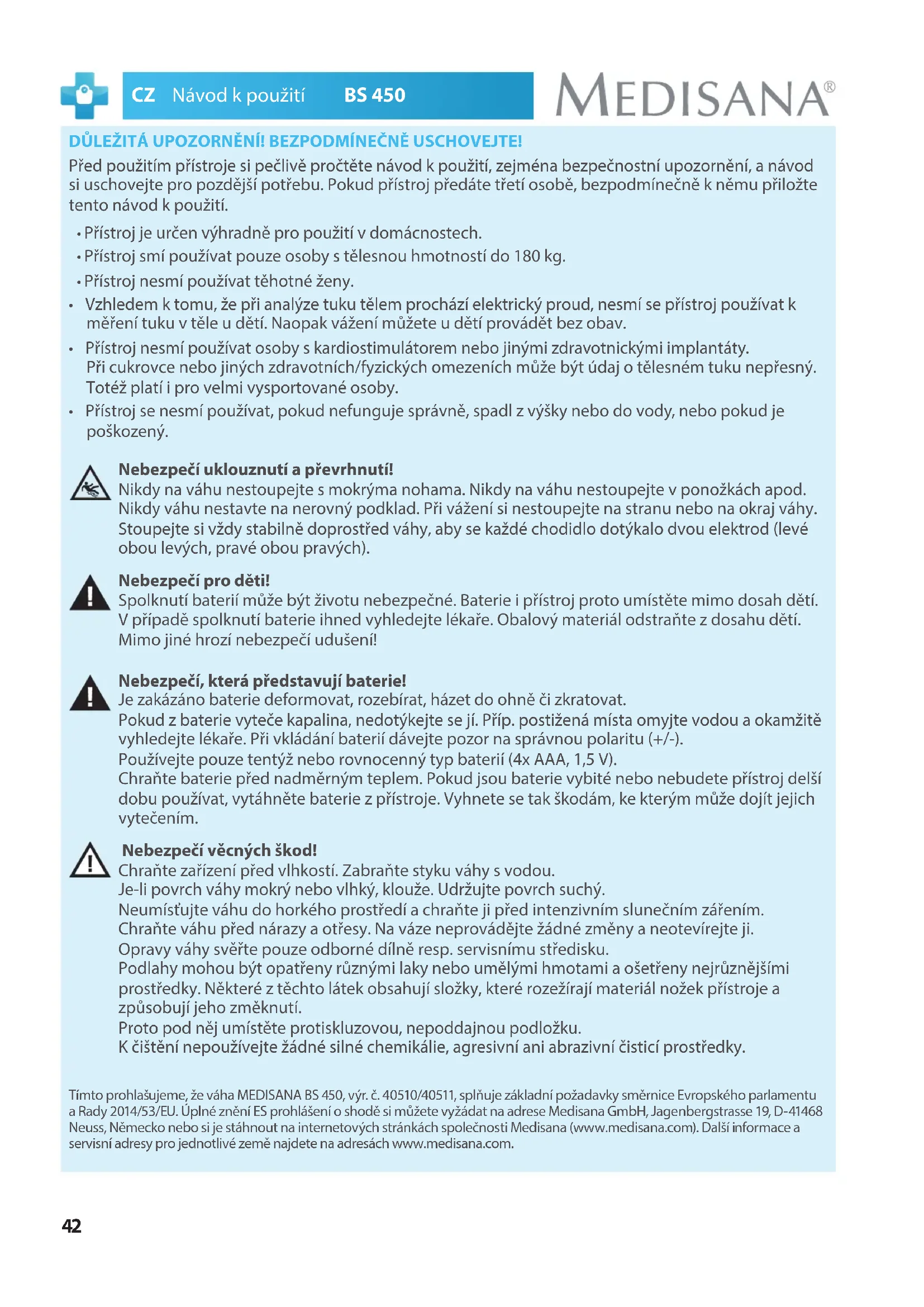 E-Mail: info@medisana.de; Διαδίκτυο: www.medisana.com42 CZ Návod kpoužití BS 450 DŮLEŽITÁ UPOZORNĚNÍ! BEZPODMÍNEČNĚ USCHOVEJTE! Před použitím přístroje si pečlivě pročtěte návod kpoužití, zejména bezpečnostní upozornění, a návod si uschovejte pro pozdější potřebu. Pokud přístroj předáte třetí osobě, bezpodmínečně kněmu přiložte tento návod kpoužití.
