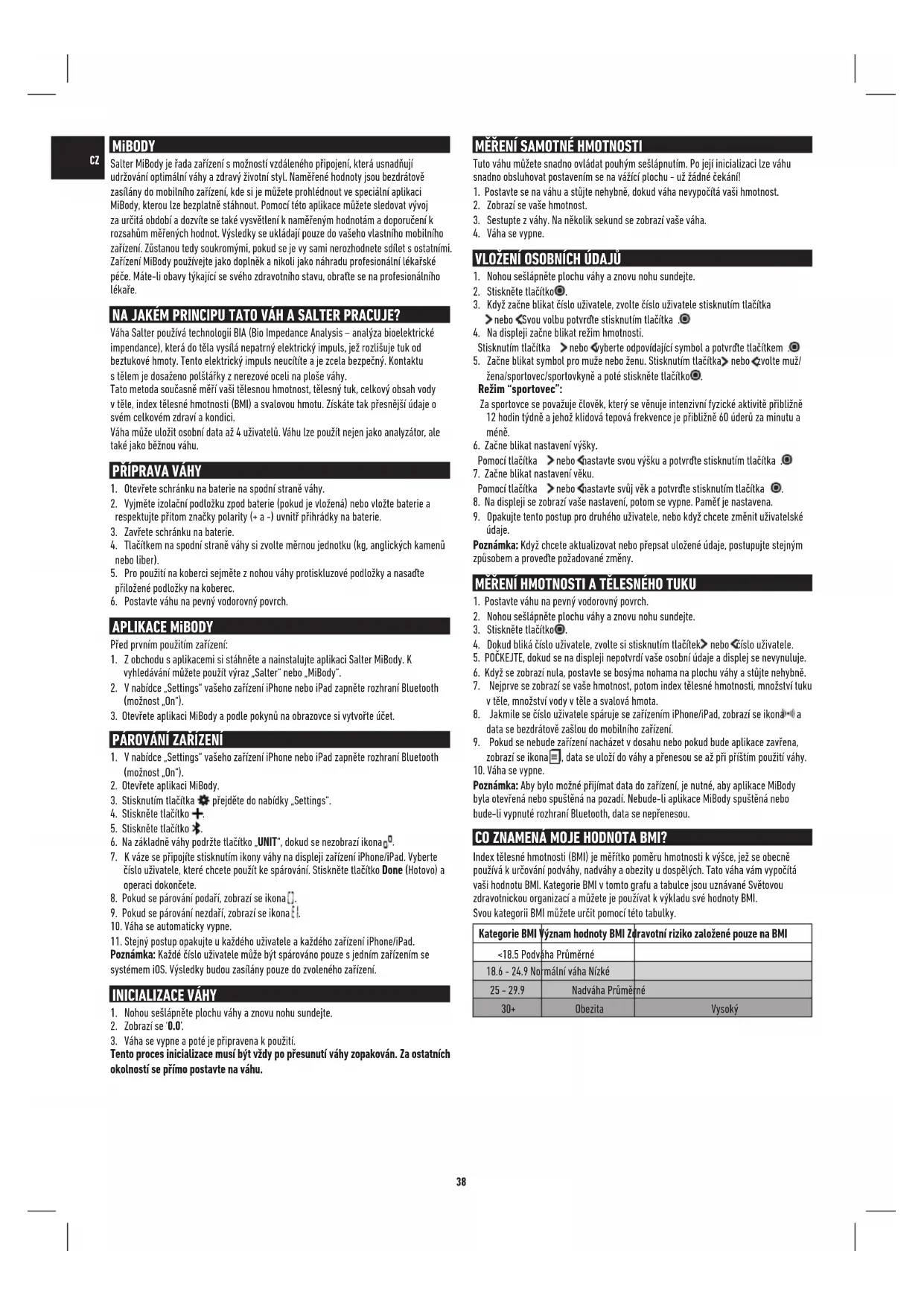 MiBODY Salter MiBody je řada zařízení s možností vzdáleného připojení, která usnadňují udržování optimální váhy a zdravý životní styl. Naměřené hodnoty jsou bezdrátově zasílány do mobilního zařízení, kde si je můžete prohlédnout ve speciální aplikaci MiBody, kterou lze bezplatně stáhnout. Pomocí této aplikace můžete sledovat vývoj za určitá období a dozvíte se také vysvětlení k naměřeným hodnotám a doporučení k rozsahům měřených hodnot. Výsledky se ukládají pouze do vašeho vlastního mobilního zařízení. Zůstanou tedy soukromými, pokud se je vy sami nerozhodnete sdílet s ostatními. Zařízení MiBody používejte jako doplněk a nikoli jako náhradu profesionální lékařské péče. Máte-li obavy týkající se svého zdravotního stavu, obraťte se na profesionálního lékaře. NA JAKÉM PRINCIPU TATO VÁH A SALTER PRACUJE? Váha Salter používá technologii BIA (Bio Impedance Analysis – analýza bioelektrické impendance), která do těla vysílá nepatrný elektrický impuls, jež rozlišuje tuk od beztukové hmoty. Tento elektrický impuls neucítíte a je zcela bezpečný. Kontaktu stělem je dosaženo polštářky znerezové oceli na ploše váhy. Tato metoda současně měří vaši tělesnou hmotnost, tělesný tuk, celkový obsah vody v těle, index tělesné hmotnosti (BMI) a svalovou hmotu. Získáte tak přesnější údaje o svém celkovém zdraví a kondici. Váha může uložit osobní data až 4 uživatelů. Váhu lze použít nejen jako analyzátor, ale také jako běžnou váhu.