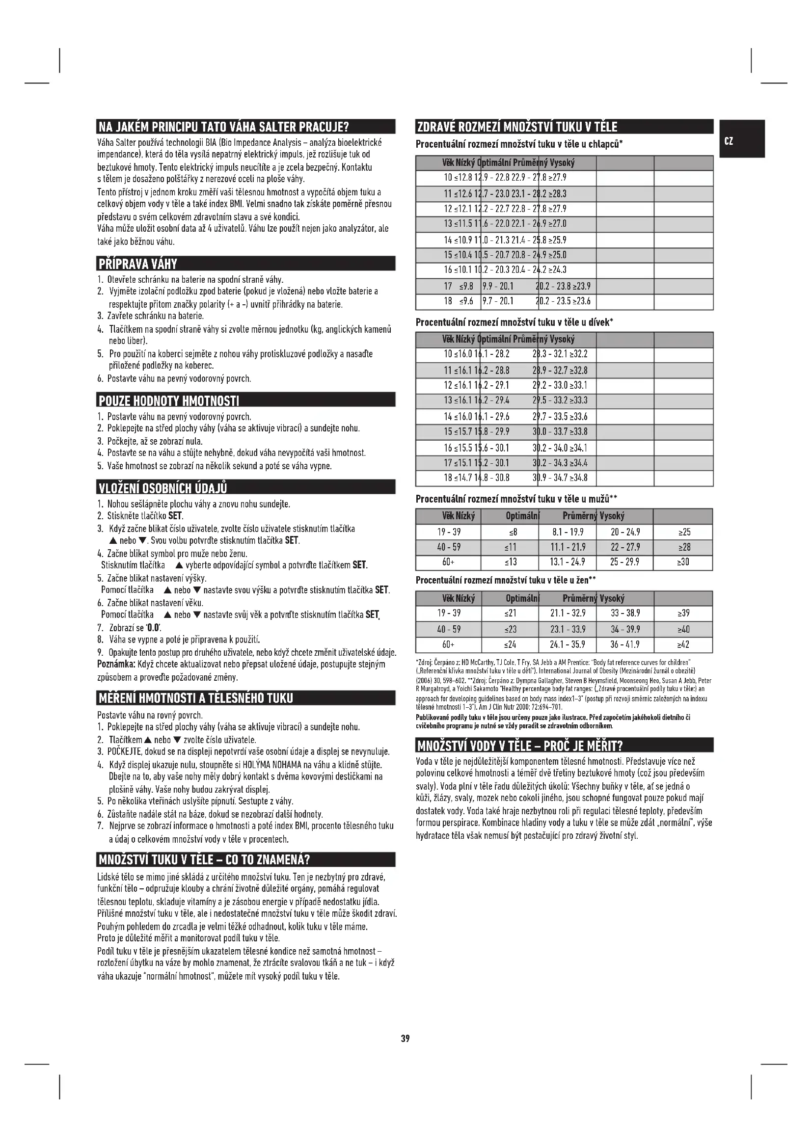 Jak přesně se množství tuku a vody vtěle měří? Tato váha Salter používá kměření metodu známou jako Analýza bioelektrické impedance (BIA).Do těla je skrz plosky nohou a nohy vysílán nepatrný elektrický proud. Tento proud snadno prochází beztukovou svalovou tkání, která má vysoký obsah tekutin, tukem však neprochází tak snadno. Měřením impedance těla (tj. odpor proudu) je tudíž možné určit množství svalové tkáně. Ztoho lze poté odhadnout množství tuku a vody. Jaká je hodnota proudu, který mi během měření prostupuje tělem? Je to bezpečné? Proud má méně než 1mA, což je zanedbatelná a zcela bezpečná hodnota. Ani tento proud neucítíte. Berte prosím na vědomí, že přístroj by neměly používat osoby svnitřní elektronickou lékařskou pomůckou, jako je kardiostimulátor, jako patření proti narušení chodu tohoto přístroje. Když si měřím množství tuku a vody v různou denní dobu, hodnoty bývají velmi rozlišné. Která hodnota je správná? Procentuální podíl tuku vtěle se mění souvisle s množstvím vody vtěle a toto množství se mění vprůběhu dne.Neexistuje správný nebo špatný čas kměření, usilujte se však o měření v pravidelnou dobu, kdy se domníváte, že je vaše tělo normálně hydratovaný. Pokud možno neměřte hodnoty po koupeli nebo sauně, po intenzivním cvičení nebo 1-2 hodiny po jídle nebo požití většího množství tekutin. Můj přítel má analyzátor množství tuku vtěle od jiného výrobce. Když jsem ji použil, naměřil mi jiné množství tuku vtěle. Proč tomu tak je? Různé analyzátory množství tuku vtěle měří tuky vodlišných částech těla a používají odlišné matematické algoritmy kvýpočtu procentuálního množství tuku vtěle. Pro sledování změn je nejlepší nesrovnávat výsledky z různých přístrojů, ale pokaždé používat stejný přístroj. Jak si mám vyložit své naměřené hodnoty množství tuku a vody v těle? Porovnejte je s tabulkami množství tuku a vody vtěle, která je součástí balení. Pomohou vám určit, zda naměřené hodnoty množství tuku a vody vtěle spadají do zdravé kategorie (úměrně kvašemu věku a pohlaví). Co mám dělat, pokud je naměřené množství tuku vtěle příliš „vysoké“? Zdravá dieta, příjem tekutin a cvičební režim mohou snížit množství tuku vtěle. Před započetím takového programu je nutné se vždy poradit se zdravotním odborníkem. Proč je takový rozdíl mezi procentuálním podílem tuku u mužů a žen? Ženy mají přirozeně větší obsah tuku než muži, protože mají jinou tělesnou skladbou, připravenou na těhotenství, kojení atd. Co mám dělat, pokud je naměřené množství vody vtěle příliš „nízké“? Ujistěte se, že máte dostatečný příjem vody a usilujte se o dosažení zdravého podílu tuku vtěle. Proč se mám vyvarovat použití váhy pro analýzu složení těla během těhotenství? Během těhotenství se tělesné složení značně mění za účelem podpory vyvíjejícího se dítěte. Za těchto okolností by mohly být hodnoty množství tuku vtěle nepřesné a zavádějící. Těhotné ženy by tudíž měly používat pouze funkci kměření hmotnosti.