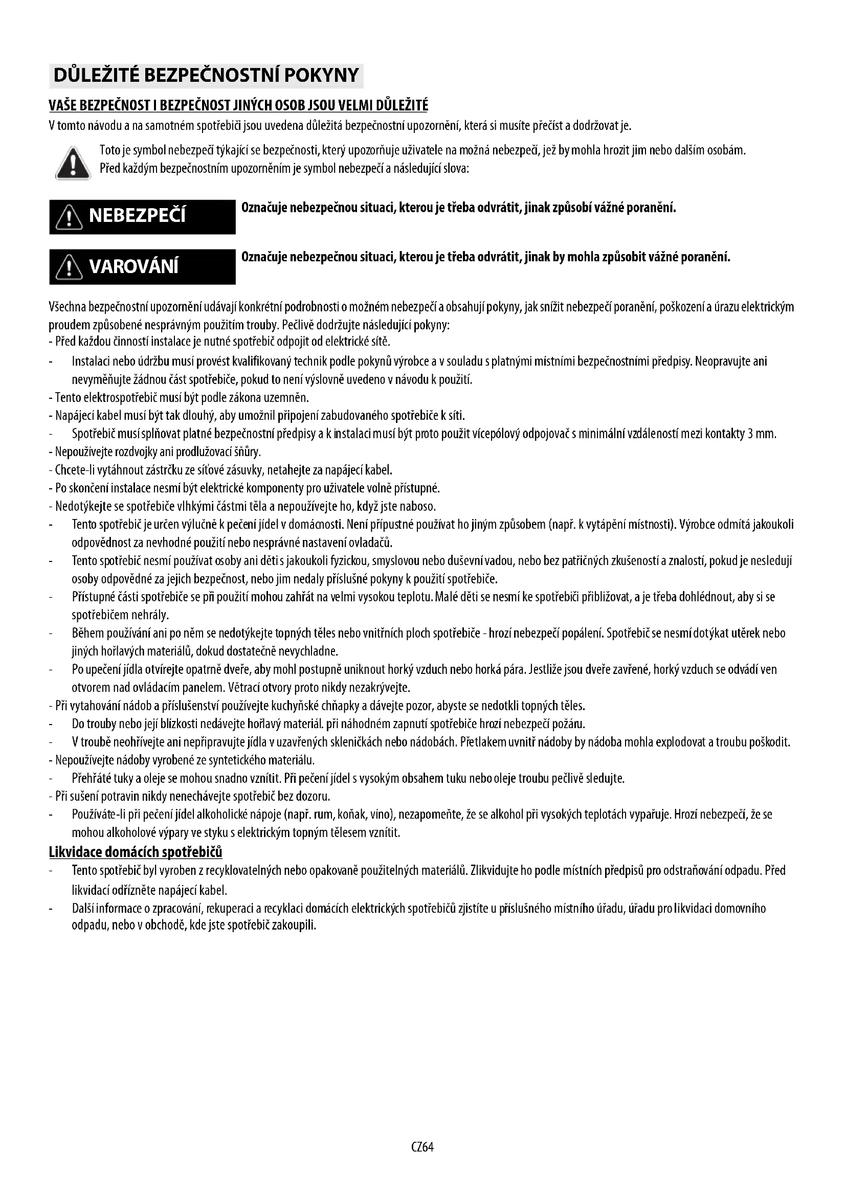 VAŠE BEZPEČNOST I BEZPEČNOST JINÝCH OSOB JSOU VELMI DŮLEŽITÉ V tomto návodu a na samotném spotřebiči jsou uvedena důležitá bezpečnostní upozornění, která si musíte přečíst a dodržovat je. Všechna bezpečnostní upozornění udávají konkrétní podrobnosti o možném nebezpečí a obsahují pokyny, jak snížit nebezpečí poranění, poškození a úrazu elektrickým proudem způsobené nesprávným použitím trouby. Pečlivě dodržujte následující pokyny: - Před každou činností instalace je nutné spotřebič odpojit od elektrické sítě. - Instalaci nebo údržbu musí provést kvalifikovaný technik podle pokynů výrobce a v souladu s platnými místními bezpečnostními předpisy. Neopravujte ani nevyměňujte žádnou část spotřebiče, pokud to není výslovně uvedeno v návodu k použití. - Tento elektrospotřebič musí být podle zákona uzemněn. - Napájecí kabel musí být tak dlouhý, aby umožnil připojení zabudovaného spotřebiče k síti. - Spotřebič musí splňovat platné bezpečnostní předpisy a k instalaci musí být proto použit vícepólový odpojovač s minimální vzdáleností mezi kontakty 3 mm. - Nepoužívejte rozdvojky ani prodlužovací šňůry. - Chcete-li vytáhnout zástrčku ze síťové zásuvky, netahejte za napájecí kabel. - Po skončení instalace nesmí být elektrické komponenty pro uživatele volně přístupné. - Nedotýkejte se spotřebiče vlhkými částmi těla a nepoužívejte ho, když jste naboso. - Tento spotřebič je určen výlučně k pečení jídel v domácnosti. Není přípustné používat ho jiným způsobem (např. k vytápění místnosti). Výrobce odmítá jakoukoli odpovědnost za nevhodné použití nebo nesprávné nastavení ovladačů. - Tento spotřebič nesmí používat osoby ani děti s jakoukoli fyzickou, smyslovou nebo duševní vadou, nebo bez patřičných zkušeností a znalostí, pokud je nesledují osoby odpovědné za jejich bezpečnost, nebo jim nedaly příslušné pokyny k použití spotřebiče. - Přístupné části spotřebiče se při použití mohou zahřát na velmi vysokou teplotu. Malé děti se nesmí ke spotřebiči přibližovat, a je třeba dohlédnout, aby si se spotřebičem nehrály. - Během používání ani po něm se nedotýkejte topných těles nebo vnitřních ploch spotřebiče - hrozí nebezpečí popálení. Spotřebič se nesmí dotýkat utěrek nebo jiných hořlavých materiálů, dokud dostatečně nevychladne. - Po upečení jídla otvírejte opatrně dveře, aby mohl postupně uniknout horký vzduch nebo horká pára. Jestliže jsou dveře zavřené, horký vzduch se odvádí ven otvorem nad ovládacím panelem. Větrací otvory proto nikdy nezakrývejte. - Při vytahování nádob a příslušenství používejte kuchyňské chňapky a dávejte pozor, abyste se nedotkli topných těles. - Do trouby nebo její blízkosti nedávejte hořlavý materiál. při náhodném zapnutí spotřebiče hrozí nebezpečí požáru. - V troubě neohřívejte ani nepřipravujte jídla v uzavřených skleničkách nebo nádobách. Přetlakem uvnitř nádoby by nádoba mohla explodovat a troubu poškodit. - Nepoužívejte nádoby vyrobené ze syntetického materiálu. - Přehřáté tuky a oleje se mohou snadno vznítit. Při pečení jídel s vysokým obsahem tuku nebo oleje troubu pečlivě sledujte. - Při sušení potravin nikdy nenechávejte spotřebič bez dozoru. - Používáte-li při pečení jídel alkoholické nápoje (např. rum, koňak, víno), nezapomeňte, že se alkohol při vysokých teplotách vypařuje. Hrozí nebezpečí, že se mohou alkoholové výpary ve styku s elektrickým topným tělesem vznítit. Likvidace domácích spotřebičů - Tento spotřebič byl vyroben z recyklovatelných nebo opakovaně použitelných materiálů. Zlikvidujte ho podle místních předpisů pro odstraňování odpadu. Před likvidací odřízněte napájecí kabel. - Další informace o zpracování, rekuperaci a recyklaci domácích elektrických spotřebičů zjistíte u příslušného místního úřadu, úřadu pro likvidaci domovního odpadu, nebo v obchodě, kde jste spotřebič zakoupili.