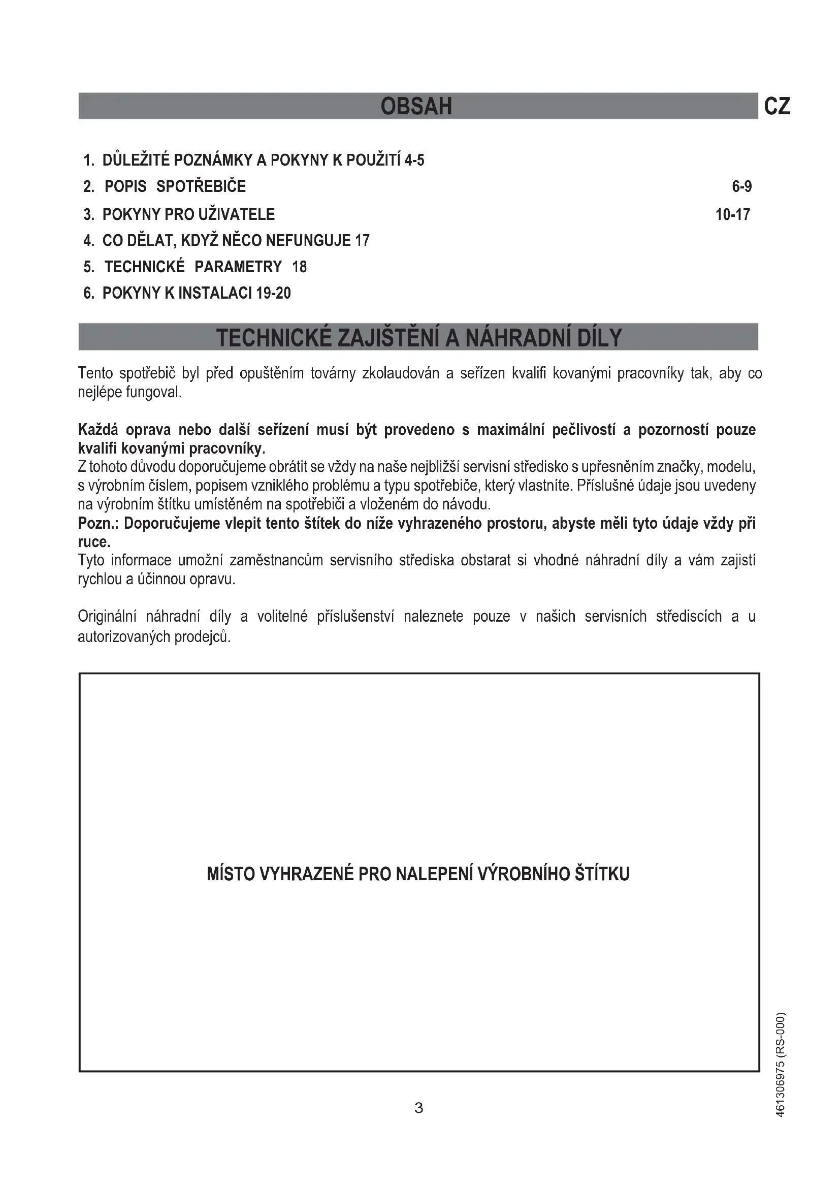 TECHNICKÉ ZAJIŠTĚNÍ A NÁHRADNÍ DÍLY Tento spotřebič byl před opuštěním továrny zkolaudován a seřízen kvalifi kovanými pracovníky tak, aby co nejlépe fungoval. Každá oprava nebo další seřízení musí být provedeno s maximální pečlivostí a pozorností pouze kvalifi kovanými pracovníky. Z tohoto důvodu doporučujeme obrátit se vždy na naše nejbližší servisní středisko s upřesněním značky, modelu, s výrobním číslem, popisem vzniklého problému a typu spotřebiče, který vlastníte. Příslušné údaje jsou uvedeny na výrobním štítku umístěném na spotřebiči a vloženém do návodu. Pozn.: Doporučujeme vlepit tento štítek do níže vyhrazeného prostoru, abyste měli tyto údaje vždy při ruce. Tyto informace umožní zaměstnancům servisního střediska obstarat si vhodné náhradní díly a vám zajistí rychlou a účinnou opravu. Originální náhradní díly a volitelné příslušenství naleznete pouze v našich servisních střediscích a u autorizovaných prodejců. MÍSTO VYHRAZENÉ PRO NALEPENÍ VÝROBNÍHO ŠTÍTKU OBSAH461306975 (RS-000)