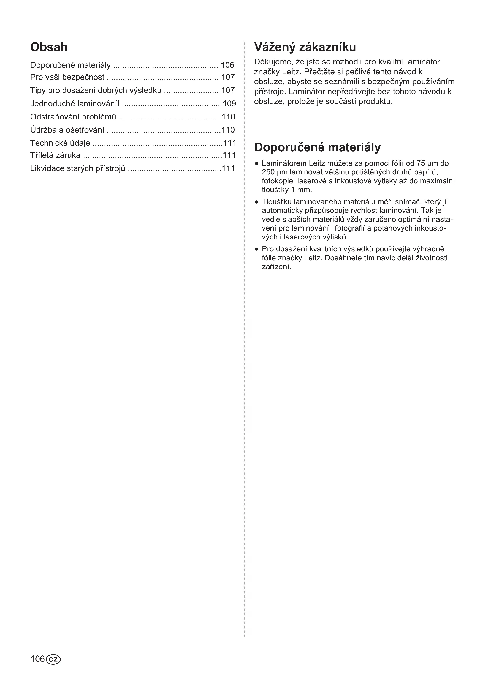 Vážený zákazníku Děkujeme, že jste se rozhodli pro kvalitní laminátor značky Leitz. Přečtěte si pečlivě tento návod k obsluze, abyste se seznámili s bezpečným používáním přístroje. Laminátor nepředávejte bez tohoto návodu k obsluze, protože je součástí produktu. Doporučené materiály
