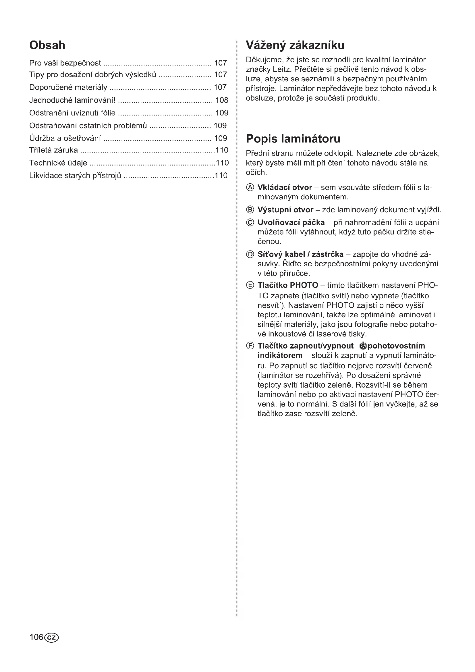 - Likvidace starých přístrojů Vážený zákazníku Děkujeme, že jste se rozhodli pro kvalitní laminátor značky Leitz. Přečtěte si pečlivě tento návod k obs- luze, abyste se seznámili s bezpečným používáním přístroje. Laminátor nepředávejte bez tohoto návodu k obsluze, protože je součástí produktu. p. 110