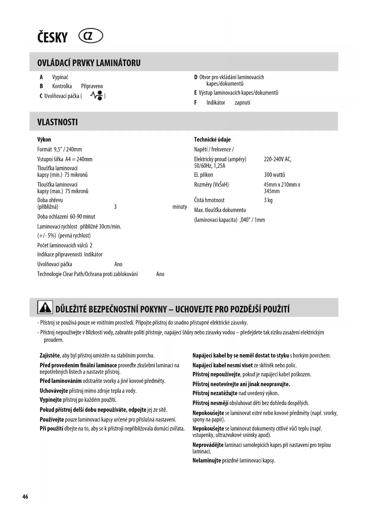 D Otvor pro vkládání laminovacích kapes/dokumentů E Výstup laminovacích kapes/dokumentů F Indikátor zapnutí VLASTNOSTI Výkon Formát 9,5” / 240mm Vstupní šířka A4 = 240mm Tloušťka laminovací kapsy (min.) 75 mikronů Tloušťka laminovací kapsy (max.) 75 mikronů Doba ohřevu (přibližná) 3 minuty Doba ochlazení 60-90 minut Laminovací rychlost přibližně 30cm/min. (+/- 5%) (pevná rychlost) Počet laminovacích válců 2 Indikace připravenosti Indikátor Uvolňovací páčka Ano Technologie Clear Path/Ochrana proti zablokování Ano Technické údaje Napětí / frekvence / Elektrický proud (ampéry) 220-240V AC, 50/60Hz, 1,25A El. příkon 300 wattů Rozměry (VxŠxH) 45mm x 210mm x 345mm Čistá hmotnost 3 kg Max. tloušťka dokumentu (laminovací kapacita) ,040” / 1mm - Přístroj se používá pouze ve vnitřním prostředí. Připojte přístroj do snadno přístupné elektrické zásuvky. - Přístroj nepoužívejte v blízkosti vody, zabraňte polití přístroje, napájecí šňůry nebo zásuvky vodou – předejdete tak riziku zasažení elektrickým proudem. Zajistěte, aby byl přístroj umístěn na stabilním povrchu. Před provedením finální laminace proveďte zkušební laminaci na nepotřebných listech a nastavte přístroj. Před laminováním odstraňte svorky a jiné kovové předměty. Uchovávejte přístroj mimo zdroje tepla a vody. Vypínejte přístroj po každém použití. Pokud přístroj delší dobu nepoužíváte, odpojte jej ze sítě. Používejte pouze laminovací kapsy určené pro příslušná nastavení. Při použití dbejte na to, aby se k přístroji nepřibližovala domácí zvířata. Napájecí kabel by se neměl dostat to styku s horkým povrchem. Napájecí kabel nesmí viset ze skříněk nebo polic. Přístroj nepoužívejte, pokud je napájecí kabel poškozen. Přístroj neotevírejte ani jinak neopravujte. Přístroj nezatěžujte nad uvedený výkon. Přístroj nesmějí obsluhovat děti bez dohledu dospělých. Nepokoušejte se laminovat ostré nebo kovové předměty (např. svorky, spony na papír). Nepokoušejte se laminovat dokumenty citlivé vůči teplu (např. vstupenky, ultrazvukové snímky apod). Neprovádějte laminaci samolepicích kapes při nastavení pro teplou laminaci. Nelaminujte prázdné laminovací kapsy. ČESKY CZVLASTNOSTI & TIPY Uvolňovací funkce Chcete-li během laminování odebrat nebo zarovnat laminovací kapsu, použijte uvolňovací páčku umístěnou na zadní straně přístroje. Laminovací kapsu lze ze vstupního otvoru uvolnit pouze po použití této páčky. Automatické vypnutí Po 30 minutách zařízení automaticky přejde do režimu automatického vypnutí. Kontrolka Zapnuto bude 5 minut červeně blikat a potom zhasne. Kon- trolka Připraveno zhasne. Pokud chcete přístroj dále používat, stiskněte vypínač. Přístroj se sám resetuje.