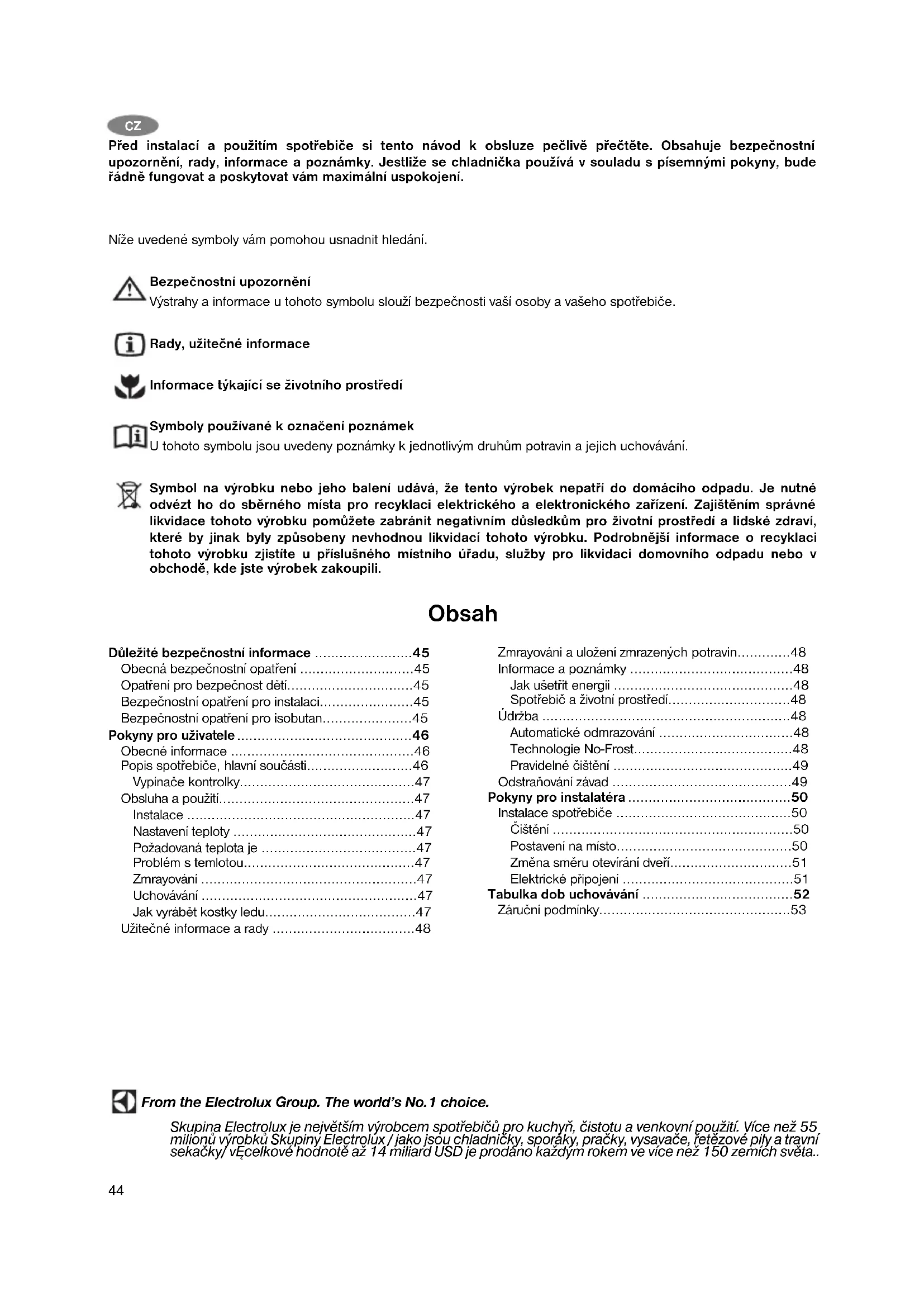 - Před instalací a použitím spotřebiče si tento návod k obsluze pečlivě přečtěte. Obsahuje bezpečnostní upozornění, rady, informace a poznámky. Jestliže se chladnička používá v souladu s písemnými pokyny, bude řádně fungovat a poskytovat vám maximální uspokojení. Níže uvedené symboly vám pomohou usnadnit hledání. Bezpečnostní upozornění Výstrahy a informace u tohoto symbolu slouží bezpečnosti vaší osoby a vašeho spotřebiče. Rady, užitečné informace Informace týkající se životního prostředí Symboly používané k označení poznámek U tohoto symbolu jsou uvedeny poznámky k jednotlivým druhům potravin a jejich uchovávání. Symbol na výrobku nebo jeho balení udává, že tento výrobek nepatří do domácího odpadu. Je nutné odvézt ho do sběrného místa pro recyklaci elektrického a elektronického zařízení. Zajištěním správné likvidace tohoto výrobku pomůžete zabránit negativním důsledkům pro životní prostředí a lidské zdraví, které by jinak byly způsobeny nevhodnou likvidací tohoto výrobku. Podrobnější informace o recyklaci tohoto výrobku zjistíte u příslušného místního úřadu, služby pro likvidaci domovního odpadu nebo v obchodě, kde jste výrobek zakoupili. Obsah Důležité bezpečnostní informace p. 45