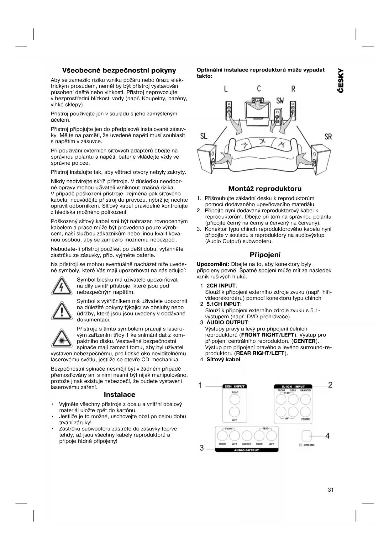 1 2CH INPUT RIGHT LEFT 5.1CH INPUT FRONT REAR 38-FOOER RIGHT LEFT CENTER 3 FRONT RIGHT LEFT CENTER RIGHT LEFT SEAR AUDIO OUTPUT -220V dBHz 4Správné propojení kabely vypadá takto: