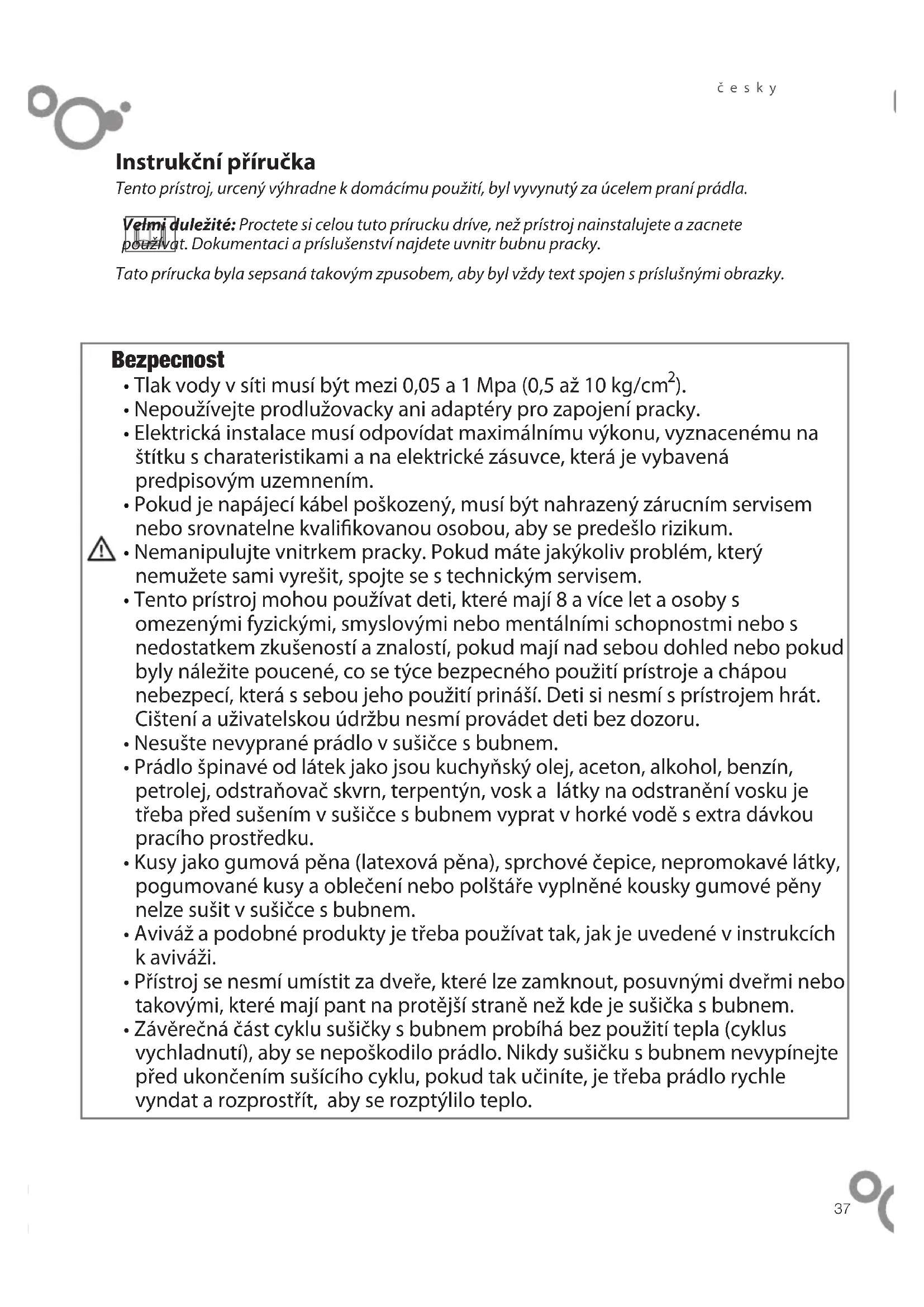 - Prádlo špinavé od látek jako jsou kuchyňský olej, aceton, alkohol, benzín, petrolej, odstraňovač skvrn, terpentýn, vosk a látky na odstranění vosku je třeba před sušením v sušičce s bubnem vyprat v horké vodě s extra dávkou pracího prostředku.