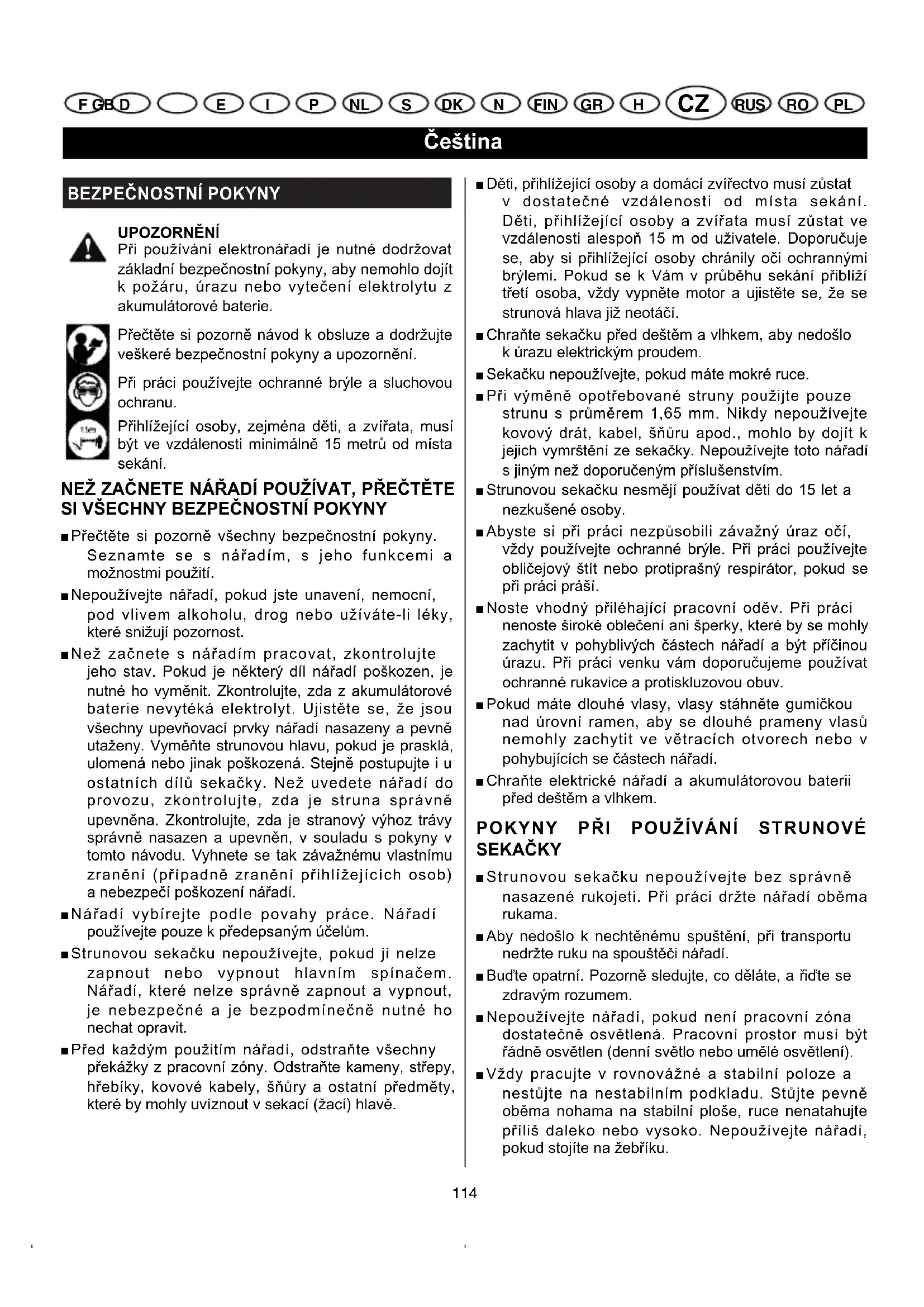 F GB D Magyar E I P NL S DK N FIN GR CZ RUS RO PL CLT-1423P / 1823 P manual 24/11/04 11:57 Page 113BEZPEČNOSTNÍ POKYNY UPOZORNĚNÍ Při používání elektronářadí je nutné dodržovat základní bezpečnostní pokyny, aby nemohlo dojít k požáru, úrazu nebo vytečení elektrolytu z akumulátorové baterie. Přečtěte si pozorně návod k obsluze a dodržujte veškeré bezpečnostní pokyny a upozornění. Při práci používejte ochranné brýle a sluchovou ochranu. Přihlížející osoby, zejména děti, a zvířata, musí být ve vzdálenosti minimálně 15 metrů od místa sekání. NEŽ ZAČNETE NÁŘADÍ POUŽÍVAT, PŘEČTĚTE
