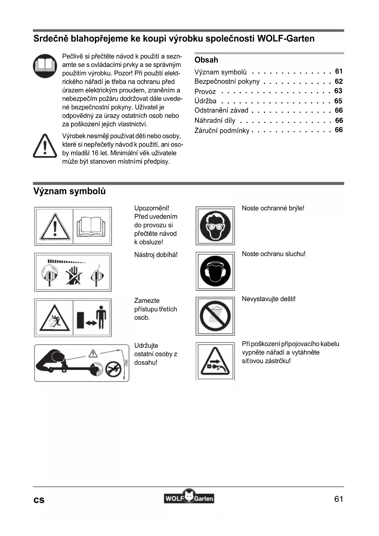Srdečně blahopřejeme ke koupi výrobku společnosti WOLF-Garten Obsah Význam symbolů