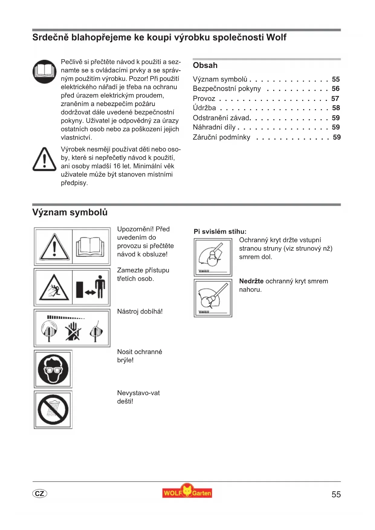 -vyčkejte, až se Žací zařizení uplně zastaví - ciisteni, kontrolu a udrzbu stroje provadejte pouze pri vypnutem motoru, stojicim zaicom zaizeni a vytahnutem kabelu ze zasuvky. Pouzivejte pouze originni kazety WOLF-Garten a dodrzujte navod k montazi