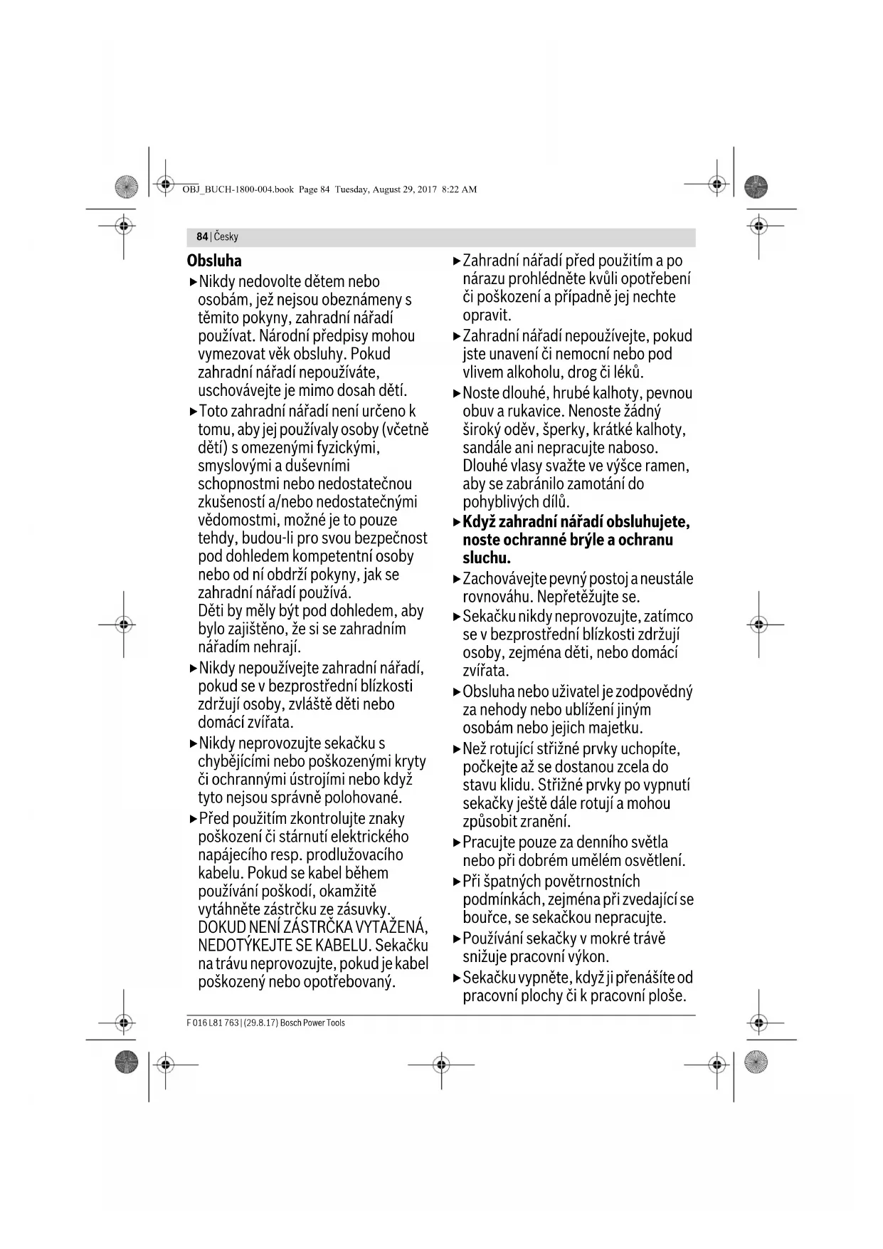 Planowane działanie Rysunek Strona Symptomy Możliwa przyczyna Usunięcie usterki Podkaszarka nie działa Brak napięcia sieciowego Skontrolować i włączyć Uszkodzone gniazdko sieciowe Podłączyć urządzenie do innego gniazdka Przedłużacz jest uszkodzony Skontrolować przewód, w razie potrzeby wymienić Zadziałał bezpiecznik Wymienić bezpiecznik Podkaszarka pracuje z przerwami Przedłużacz jest uszkodzony Skontrolować przewód, w razie potrzeby wymienić Zwrócić się do punktu serwisowego Nastąpiło uszkodzenie wewnętrznego okablowania narzędzia ogrodowego Zwrócić się do punktu serwisowego Narzędzie ogrodowe jest przeciążone Za wysoka trawa Podkaszać stopniowo Urządzenie nie ścina trawy Elementy tnące są zbyt krótkie/złamane Wymienić elementy tnące Nić się nie wysuwa Szpula jest pusta Wymienić szpulę Nić zaplątała się w szpuli Skontrolować szpulę i, w razie potrzeby, ponownie nawinąć nić Nić wciągana jest ponownie do szpuli Nić nie wysuwa się Ponownie nawinąć nić na szpulę (zob. rys. 11) Nić urywa się Nić zaplątała się w szpuli Skontrolować szpulę i, w razie potrzeby, ponownie nawinąć nić Podkaszarka jest niewłaściwie użytkowana Podkaszać tylko czubkiem nici, unikać kontaktu z kamieniami, ścianami i innymi twardymi przedmiotami. Nić należy regularnie przesuwać, aby wykorzystywać całkowitą średnicę cięcia. OBJ_BUCH-1800-004.book Page 82 Tuesday, August 29, 2017 8:22 AMČesky | 83 Bosch Power Tools F 016 L81 763 | (29.8.17) Obsługa klienta oraz doradztwo dotyczące użytkowania www.bosch-garden.com Przy wszystkich zgłoszeniach i zamówieniach części zamiennych konieczne jest podanie dziesięciocyfrowego numeru katalogowego, znajdującego się na tabliczce znamionowej narzędzia ogrodowego. Polska Robert Bosch Sp. z o.o. BSC Ul. Szyszkowa 35/37 02-285 Warszawa Na www.bosch-pt.pl znajdą Państwo wszystkie szczegóły dotyczące usług serwisowych online. Tel.: +48 227 154460 Faks: +48 227 154441 E-Mail: bsc@pl.bosch.com www.bosch-pt.pl Usuwanie odpadów Nie wolno wyrzucać narzędzi ogrodowych do odpadów z gospodarstwa domowego! Tylko dla państw należących do UE: Zgodnie z europejską wytycznymi Europejskiej Dyrektywy 2012/19/UE o starych, zużytych narzędziach elektrycznych i elektronicznych i jej stosowania w prawie krajowym, wyeliminowane niezdatne do użycia narzędzia elektryczne i elektroniczne należy zbierać osobno i doprowadzić do ponownego przetworzenia zgodnego z zasadami ochrony środowiska. Zastrzega się prawo dokonywania zmian. Česky Bezpečnostní upozornění Pozor! Pročtěte si pozorně následující pokyny. Seznamte se s obslužnými prvky a řádným používáním zahradního nářadí. Uschovejte si prosím pečlivě návod k použití pro pozdější potřebu. Vysvětlivky obrázkových symbolů Všeobecné upozornění na nebezpečí. Pročtěte si návod k použití. Dbejte na to, aby osoby stojící v blízkosti nebyly poraněny odmrštěnými cizími tělesy. Varování: Pokud zahradní nářadí pracuje, udržujte vůči němu bezpečný odstup. Než přistoupíte k nastavování nebo čištění stroje, když se zamotal kabel nebo když sekačku trávy i jen na krátkou dobu necháváte bez dozoru, vždy sekačku vypněte a vytáhněte zástrčku ze zásuvky. Elektrický kabel udržujte daleko od střižných prvků. Noste ochranu sluchu a ochranné brýle. Nesečte za deště a nenechávejte sekačku za deště stát venku. Dbejte na to, aby nebyly v blízkosti stojící osoby zraněny odletujícími cizími tělesy. Varování: Pokud zahradní nářadí pracuje, udržujte vůči němu bezpečný odstup. OBJ_BUCH-1800-004.book Page 83 Tuesday, August 29, 2017 8:22 AM84 | Česky F 016 L81 763 | (29.8.17) Bosch Power Tools Obsluha Nikdy nedovolte dětem nebo osobám, jež nejsou obeznámeny s těmito pokyny, zahradní nářadí používat. Národní předpisy mohou vymezovat věk obsluhy. Pokud zahradní nářadí nepoužíváte, uschovávejte je mimo dosah dětí. Toto zahradní nářadí není určeno k tomu, aby jej používaly osoby (včetně dětí) s omezenými fyzickými, smyslovými a duševními schopnostmi nebo nedostatečnou zkušeností a/nebo nedostatečnými vědomostmi, možné je to pouze tehdy, budou-li pro svou bezpečnost pod dohledem kompetentní osoby nebo od ní obdrží pokyny, jak se zahradní nářadí používá. Děti by měly být pod dohledem, aby bylo zajištěno, že si se zahradním nářadím nehrají. Nikdy nepoužívejte zahradní nářadí, pokud se v bezprostřední blízkosti zdržují osoby, zvláště děti nebo domácí zvířata. Nikdy neprovozujte sekačku s chybějícími nebo poškozenými kryty či ochrannými ústrojími nebo když tyto nejsou správně polohované. Před použitím zkontrolujte znaky poškození či stárnutí elektrického napájecího resp. prodlužovacího kabelu. Pokud se kabel během používání poškodí, okamžitě vytáhněte zástrčku ze zásuvky. DOKUD NENÍ ZÁSTRČKA VYTAŽENÁ, NEDOTÝKEJTE SE KABELU. Sekačku na trávu neprovozujte, pokud je kabel poškozený nebo opotřebovaný. Zahradní nářadí před použitím a po nárazu prohlédněte kvůli opotřebení či poškození a případně jej nechte opravit. Zahradní nářadí nepoužívejte, pokud jste unavení či nemocní nebo pod vlivem alkoholu, drog či léků. Noste dlouhé, hrubé kalhoty, pevnou obuv a rukavice. Nenoste žádný široký oděv, šperky, krátké kalhoty, sandále ani nepracujte naboso. Dlouhé vlasy svažte ve výšce ramen, aby se zabránilo zamotání do pohyblivých dílů. Když zahradní nářadí obsluhujete, noste ochranné brýle a ochranu sluchu. Zachovávejte pevný postoj a neustále rovnováhu. Nepřetěžujte se. Sekačku nikdy neprovozujte, zatímco se v bezprostřední blízkosti zdržují osoby, zejména děti, nebo domácí zvířata. Obsluha nebo uživatel je zodpovědný za nehody nebo ublí