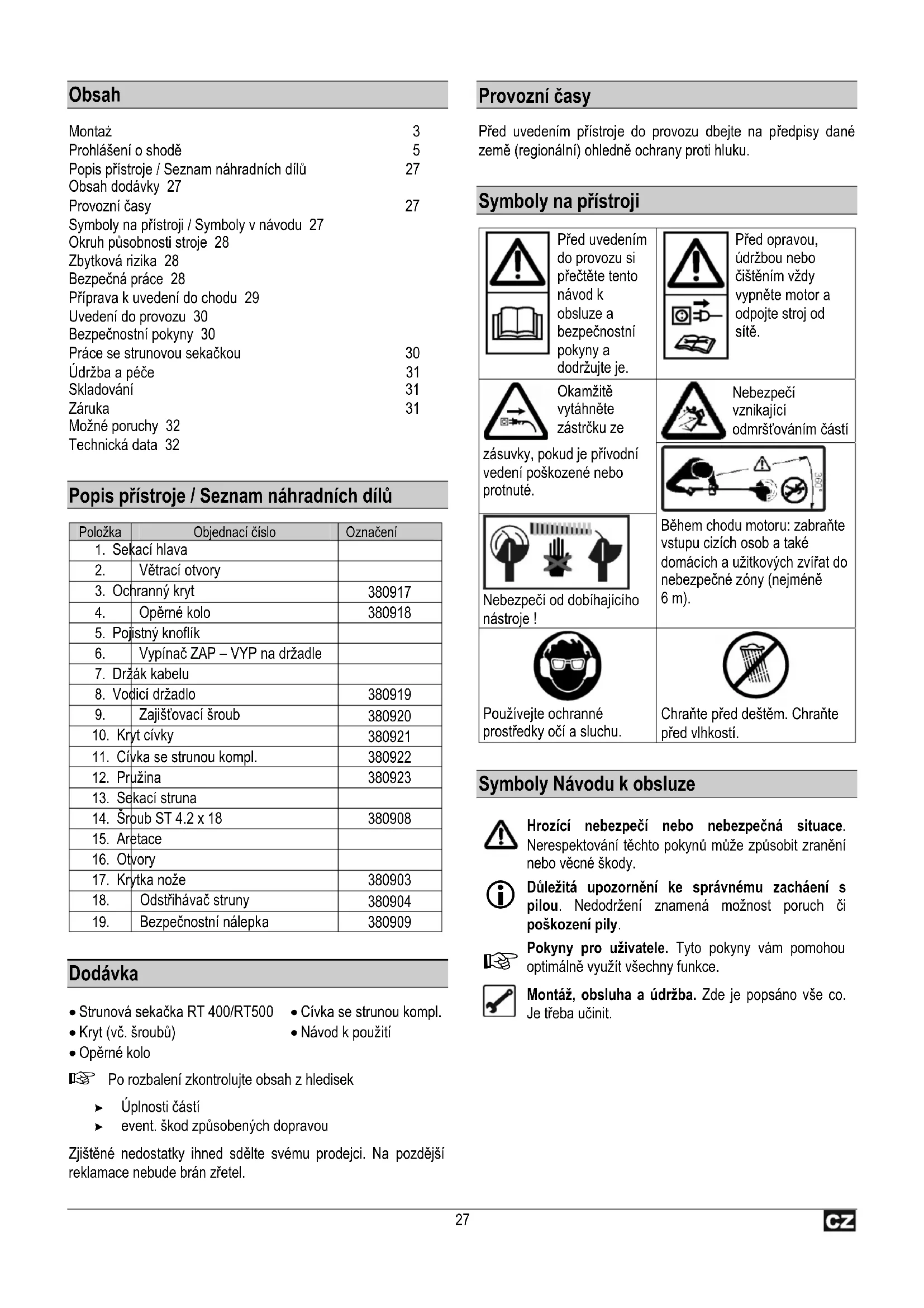 - Použivat strunovou sekačku a provadět její serizováni a udrzbu smí pouze osoby, které jsou s temito cinnostmi obeznámeny a které byly poučeny o možněch rizicich. Event.opravy pily smí, vedle vyrobce,provadět pouze autorizovány servis.