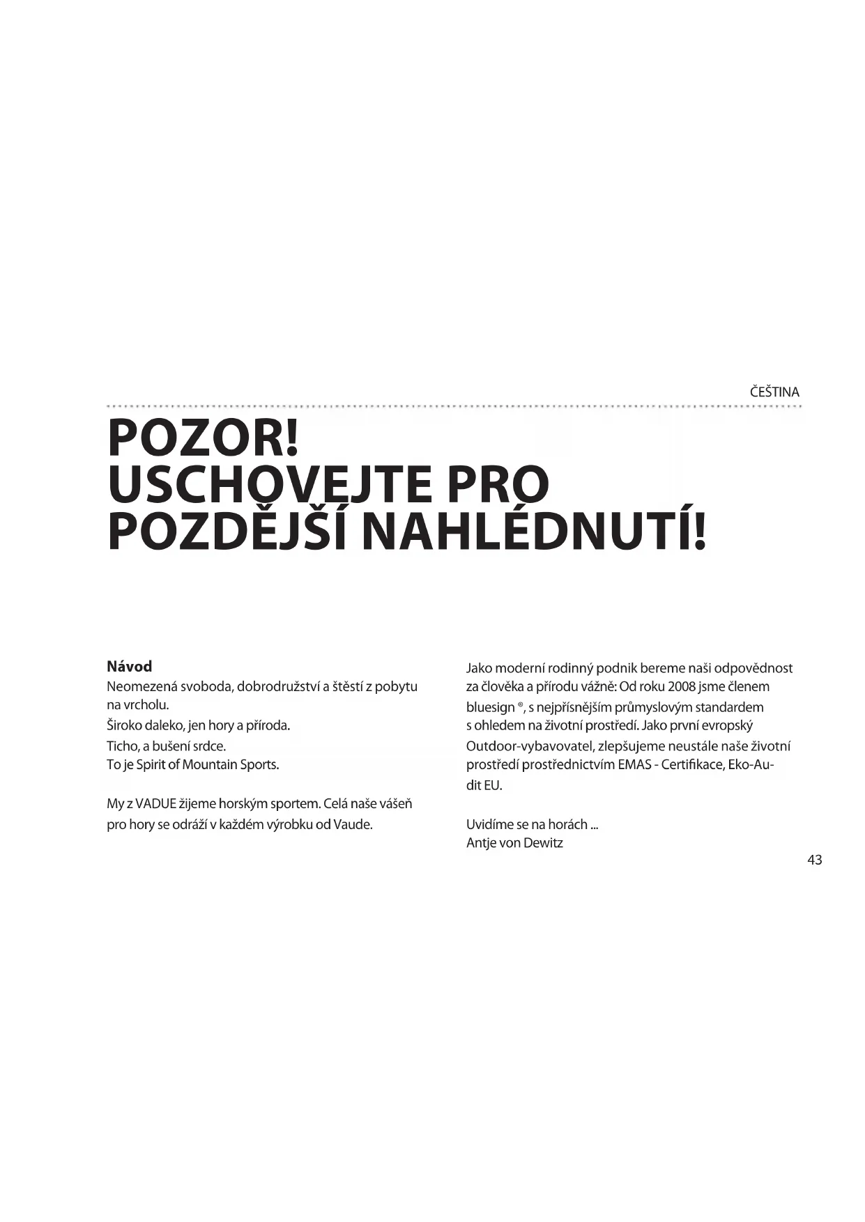 - Bevestig de afspanlijnen niet op looppaden, in het donker kan men er gemakkelijk over struikelen.43 ČEŠTINA POZOR! USCHOVEJTE PRO POZDĚJŠÍ NAHLÉDNUTÍ! Návod Neomezená svoboda, dobrodružství a štěstí z pobytu na vrcholu. Široko daleko, jen hory a příroda. Ticho, a bušení srdce. To je Spirit of Mountain Sports. My z VADUE žijeme horským sportem. Celá naše vášeň pro hory se odráží v každém výrobku od Vaude. Jako moderní rodinný podnik bereme naši odpovědnost za člověka a přírodu vážně: Od roku 2008 jsme členem bluesign ®, s nejpřísnějším průmyslovým standardem s ohledem na životní prostředí. Jako první evropský Outdoor-vybavovatel, zlepšujeme neustále naše životní prostředí prostřednictvím EMAS - Certikace, Eko-Au- dit EU. Uvidíme se na horách ... Antje von Dewitz44 ČEŠTINA volBa mísTa: