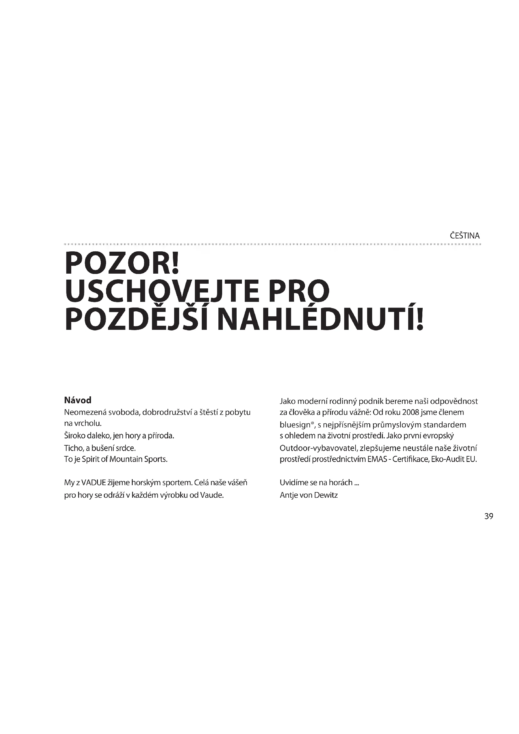 - Bevestig de afspanlijnen niet op looppaden, in het donker kan men er gemakkelijk over struikelen. NEDERLANDS39 ČEŠTINA POZOR! USCHOVEJTE PRO POZDĚJŠÍ NAHLÉDNUTÍ! Návod Neomezená svoboda, dobrodružství a štěstí z pobytu na vrcholu. Široko daleko, jen hory a příroda. Ticho, a bušení srdce. To je Spirit of Mountain Sports. My z VADUE žijeme horským sportem. Celá naše vášeň pro hory se odráží v každém výrobku od Vaude. Jako moderní rodinný podnik bereme naši odpovědnost za člověka a přírodu vážně: Od roku 2008 jsme členem bluesign®, s nejpřísnějším průmyslovým standardem s ohledem na životní prostředí. Jako první evropský Outdoor-vybavovatel, zlepšujeme neustále naše životní prostředí prostřednictvím EMAS - Certikace, Eko-Audit EU. Uvidíme se na horách ... Antje von Dewitz40 ČEŠTINA VoLBa míSta: