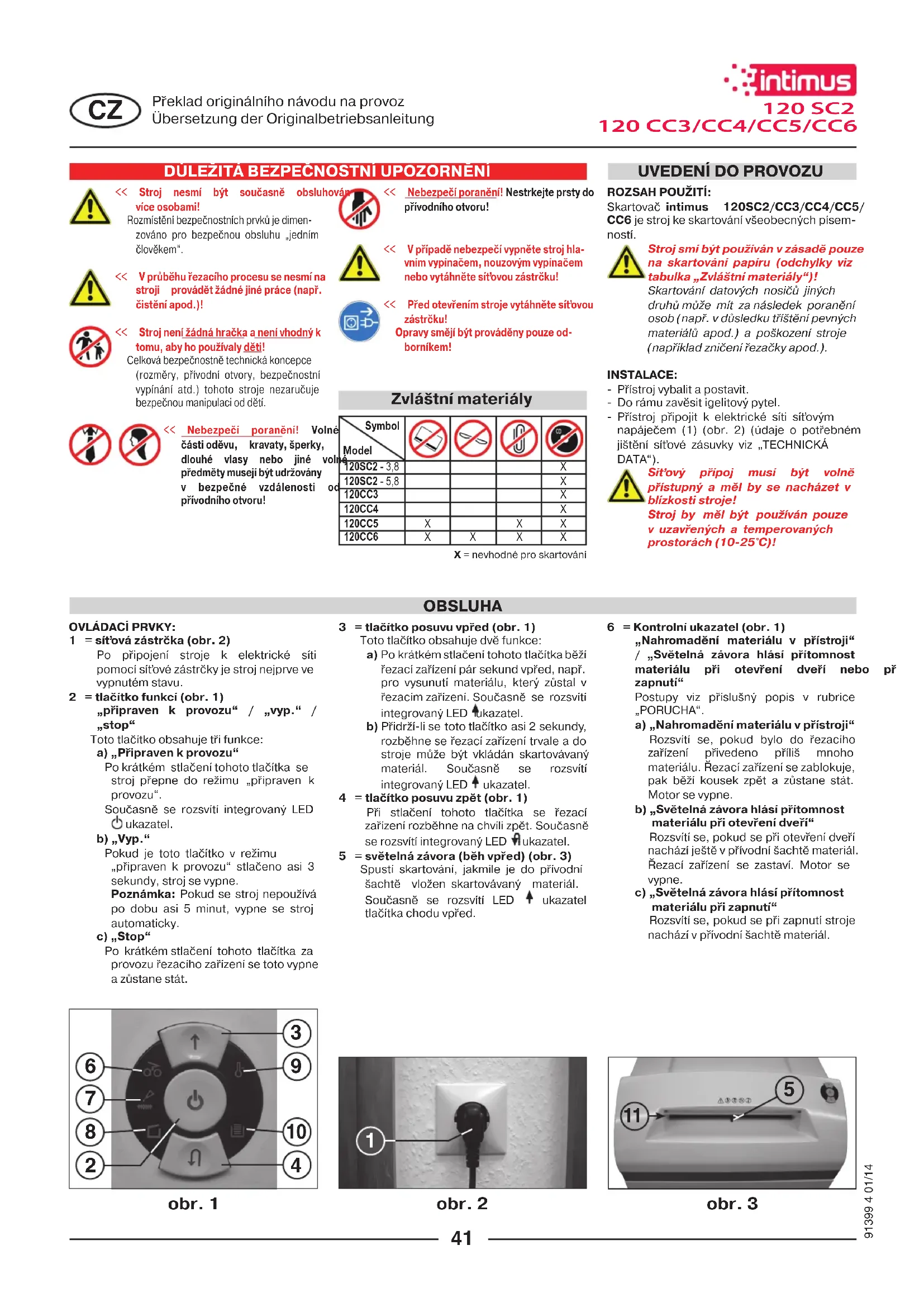 PORUCHA obr.5obr.6ČIŠTĚNÍFOTOBUNĚK(obr.5): Pokud se do vstupní štěrbiny dostanou kousky papíru (např. po nahromadění papíru) je možné, že se přístroj kvůli hlášení přítomnosti materiálu světelnou závorou nevypne.Můžete kousky papíru odstranit, resp. fotobuňku vyčistit tak, že do řezacího zařízení zavedete další list papíru nebo stroj přepnete na zpětný chod a štětcem krátce očistíte obě „oči“ fotobuňky.ÚDRŽBAŘEZACÍHOZAŘÍZENÍ(CROSS-CUT):Řezací zařízení Cross-Cut musí být po určité době provozu namazáno olejem. Pokud se rozsvítí kontrolní ukazatel (7), postupujte následovně:Otevřít dveře. Rozsvítí se kontrolní ukazatel (8) a blikají LED ukazatel tlačítka chodu zpět (4) a kontrolní ukazatel (7). Olejovou nádobku (13) (obr. 6) vyjmout z držáku ve dveřích a dveře opět zavřít. Na list papíru rozlít a rozprostřít trochu oleje a papír zavést do přívodní šachty na papír (11) řezacího zařízení. Papír je zatažen dovnitř a olej se tak dostane do řezacího zařízení.Poznámka: Aby zhasl příslušný ukazatel, musí být po provedeném mazání řezacího zařízení následujícím postupem promazání potvrzeno:- Dveře otevřít tak, až se rozsvítí kontrolní ukazatel (8). Kontrolní ukazatele (7) a (4) blikají. Překlad originálního návodu na provoz Übersetzung der Originalbetriebsanleitung NAHROMADĚNÍMATERIÁLUVPŘÍSTROJI:(automatickáreverznífunkce) Dojde-li k nahromadění materiálu ve stroji, reaguje stroj následovně:- Řezací zařízení se zablokuje, potom se vrátí kousek nazpět (materiál se uvolní) a zastaví se. Motor se vypne. Rozsvítí se kontrolní ukazatel (6).Postupujte následovně:Nahromadění papíru v přívodní šachtě napapír(11)- Vyjmout zpět vysunutý papír. - Řezací zařízení se automaticky rozběhne a skartuje zbytek papíru, který zůstal ve skartovacím zařízení. Během chodu vpřed svítí LED ukazatel tlačítka chodu vpřed (3). Kontrolní ukazatel (6) zhasne. - Pokračovat ve skartování s menším množstvím papíru.- V případě potřeby přepínat řezací zařízení manuálně vpřed a zpět tak dlouho, dokud skartovávaný materiál neprojde řezacím zařízením a neskartuje se.SVĚTELNÁZÁVORAHLÁSÍPŘÍTOMNOSTMATERIÁLUPŘIOTEVŘENÝCHDVEŘÍCH:Pokud by se při otevření dveří nacházel ještě v přívodní šachtě materiál, motor se vypne a řezací zařízení se zastaví. Rozsvítí se kontrolní ukazatel (6). Zavřete dveře a krátkým stlačením tlačítka chodu vpřed (3) potvrďte stav. Skartovávaný materiál se vtáhne do řezacího zařízení a skartuje se.SVĚTELNÁZÁVORAHLÁSÍPŘÍTOMNOSTMATERIÁLUPŘIZAPNUTÍ: Pokud by se při zapnutí stroje nacházel v přívodní šachtě materiál, rozsvítí se kontrolní ukazatel (6). Vyndejte materiál a potvrďte stav krátkým stlačením tlačítka chodu vpřed (3).OCHRANAMOTORU:Pokud je motor přetížen, vypne se. Rozsvítí se kontrolní ukazatel (9).Po ochlazení trvajícím asi 25-40 minut můžete přístroj znovu spustit.ELEKTRICKÁPORUCHA:Bliká-li kontrolní ukazatel (9) ve spojení s LED ukazatelem funkčního tlačítka (2) nebo jen kontrolní ukazatel (8), vyskytla se elektrická porucha. Stroj nelze spustit.V takovém případě informujte svého odborného prodejce.KONTROLNÍSEZNAMPŘIPORUCHÁCH: Pokud přístroj nefunguje, zkontrolujte následující body:- Je síťovýnapáječ připojen k síti?- Jsou zavřeny dveře?- Není plný sběrnýpytelnapapír? Postupujte podle instrukcí u „VYPRÁZDNĚNÍ SBĚRNÉHO PYTLE NA PAPÍR“. - Nenahromadil se v přístroji materiál? Postupujte podle instrukcí u „NAHROMADĚNÍ MATERIÁLU V PŘÍSTROJI“.- Nepřetížil se motor? Viz pod „OCHRANA MOTORU“.Pokudnešloožádnýzuvedenýchbodů,informujteprosímVašehoodbornéhoprodejce.* vztaženo na papír A4 70g/m při 230V/50Hz Model Datasíťovéhopřipojení Napájecí napětí/frekvence • odběr proudu • výkon intimus120SC2 220-230V/50Hz • 7,8 A • 1,8 kW 115-125V/60Hz • 12,0 A • 1,4 kW 100V/50/60Hz • 18,0 A • 1,8 kW intimus120SC2 220-230V/50Hz • 7,8 A • 1,8 kW 115-125V/60Hz • 12,0 A • 1,4 kW 100V/50/60Hz • 18,0 A • 1,8 kW intimus120CC3 220-230V/50Hz • 7,8 A • 1,8 kW 115-125V/60Hz • 12,0 A • 1,4 kW 100V/50/60Hz • 18,0 A • 1,8 kW intimus120CC4 220-230V/50Hz • 7,8 A • 1,8 kW 115-125V/60Hz • 12,0 A • 1,4 kW 100V/50/60Hz • 18,0 A • 1,8 kW intimus120CC5 220-230V/50Hz • 7,8 A • 1,8 kW 115-125V/60Hz • 12,0 A • 1,4 kW 100V/50/60Hz • 18,0 A • 1,8 kW intimus120CC6 220-230V/50Hz • 7,8 A • 1,8 kW 115-125V/60Hz • 12,0 A • 1,4 kW 100V/50/60Hz • 18,0 A • 1,8 kW Model TípusŠířkanařezanýchproužků Řezacívýkonpro Pracovníšířka Hlučnost Rozměry Váha papíru papíru Š x H x V intimus120SC2 227-6S 5,8 mm 35-38 listů* 310 mm asi 57 dB(A) 535 x 395 x 980 mm 46 kg intimus120SC2 227-4S 3,8 mm 31-33 listů* 310 mm asi 57 dB(A) 535 x 395 x 980 mm 46 kg intimus120CC3 227-4C 3,8x36 mm 23-25 listů* 310 mm asi 57 dB(A) 535 x 395 x 980 mm 47 kg intimus120CC4 227-2C 1,9x15 mm 15-17 listů* 310 mm asi 57 dB(A) 535 x 395 x 980 mm 47 kg intimus120CC5 227-1C 0,8x12 mm 10-12 listů* 310 mm asi 57 dB(A) 535 x 395 x 980 mm 47 kg intimus120CC6 227-1CF 0,8x4,5 mm 7-8 listů* 310 mm asi 57 dB(A) 535 x 395 x 980 mm 47 kg Pojistka(zpožděná): 220-230V=10A/115-125V=15A/100V=18A120 SC2 120 CC3/CC4/CC5/CC6