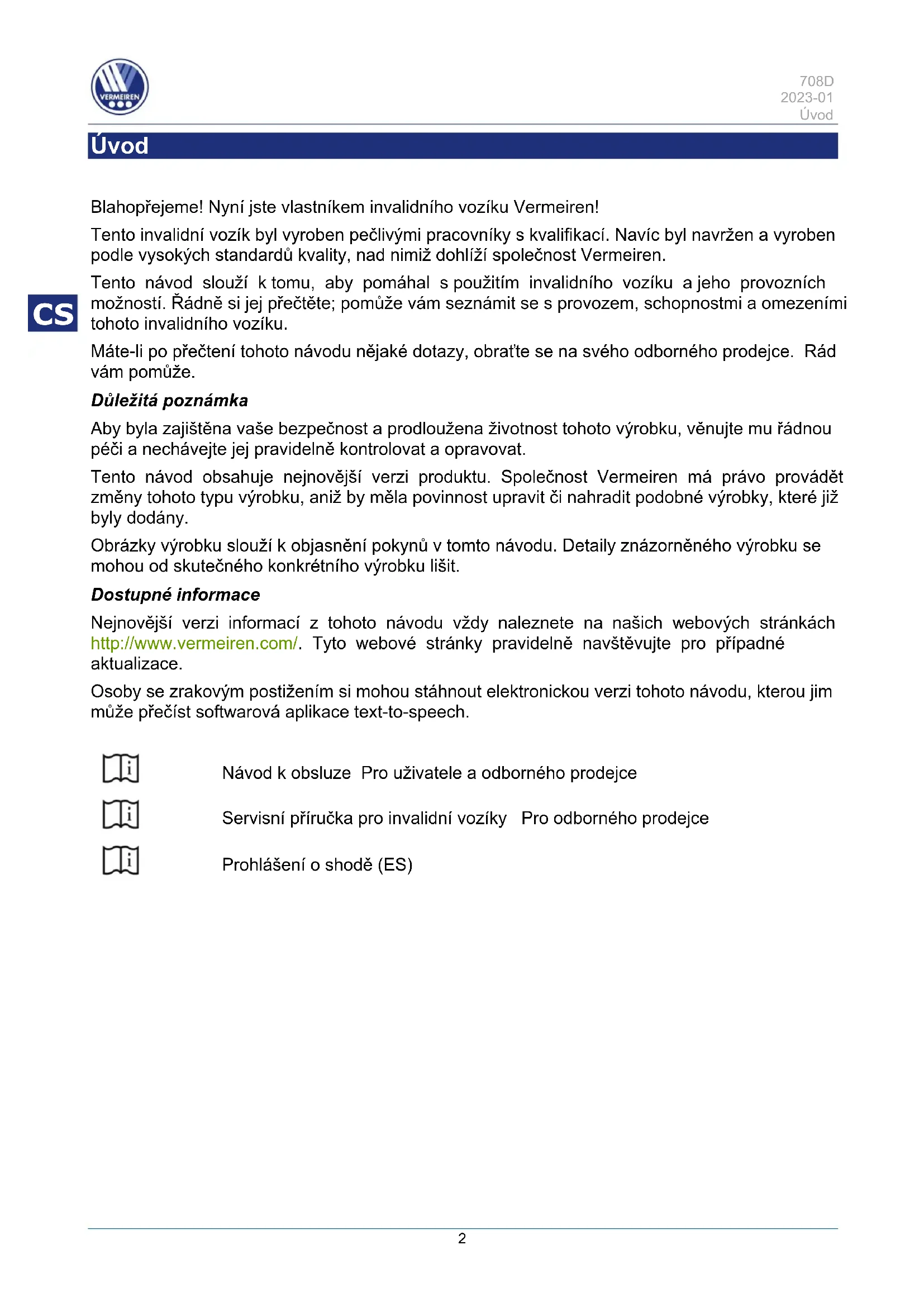 Úvod Blahopřejeme! Nyní jste vlastníkem invalidního vozíku Vermeiren! Tento invalidní vozík byl vyroben pečlivými pracovníky s kvalifikací. Navíc byl navržen a vyroben podle vysokých standardů kvality, nad nimiž dohlíží společnost Vermeiren. Tento návod slouží k tomu, aby pomáhal s použitím invalidního vozíku a jeho provozních možností. Řádně si jej přečtěte; pomůže vám seznámit se s provozem, schopnostmi a omezeními tohoto invalidního vozíku. Máte-li po přečtení tohoto návodu nějaké dotazy, obraťte se na svého odborného prodejce. Rád vám pomůže. Důležitá poznámka Aby byla zajištěna vaše bezpečnost a prodloužena životnost tohoto výrobku, věnujte mu řádnou péči a nechávejte jej pravidelně kontrolovat a opravovat. Tento návod obsahuje nejnovější verzi produktu. Společnost Vermeiren má právo provádět změny tohoto typu výrobku, aniž by měla povinnost upravit či nahradit podobné výrobky, které již byly dodány. Obrázky výrobku slouží k objasnění pokynů v tomto návodu. Detaily znázorněného výrobku se mohou od skutečného konkrétního výrobku lišit. Dostupné informace Nejnovější verzi informací z tohoto návodu vždy naleznete na našich webových stránkách http://www.vermeiren.com/. Tyto webové stránky pravidelně navštěvujte pro případné aktualizace. Osoby se zrakovým postižením si mohou stáhnout elektronickou verzi tohoto návodu, kterou jim může přečíst softwarová aplikace text-to-speech.