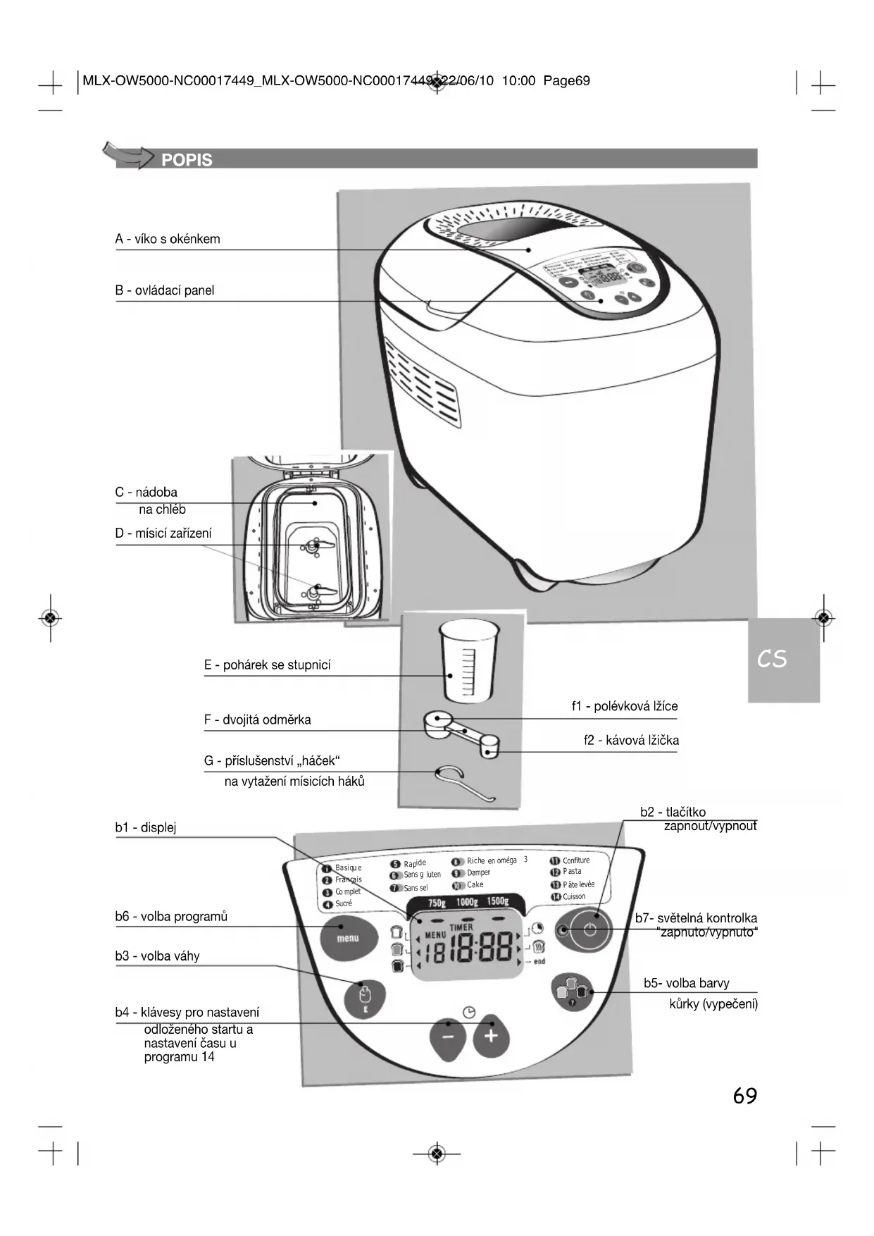 te levée Cuisson A - víko s okénkem b6 - volba programů b4 - klávesy pro nastavení odloženého startu a nastavení času u programu 14 b1 - displej b3 - volba váhy b2 - tlačítko zapnout/vypnout b7- světelná kontrolka "zapnuto/vypnuto" b5- volba barvy kůrky (vypečení) B - ovládací panel C - nádoba na chléb D - mísicí zařízení E - pohárek se stupnicí F - dvojitá odměrka f1 - polévková lžíce f2 - kávová lžička G - příslušenství „háček“ na vytažení mísicích háků