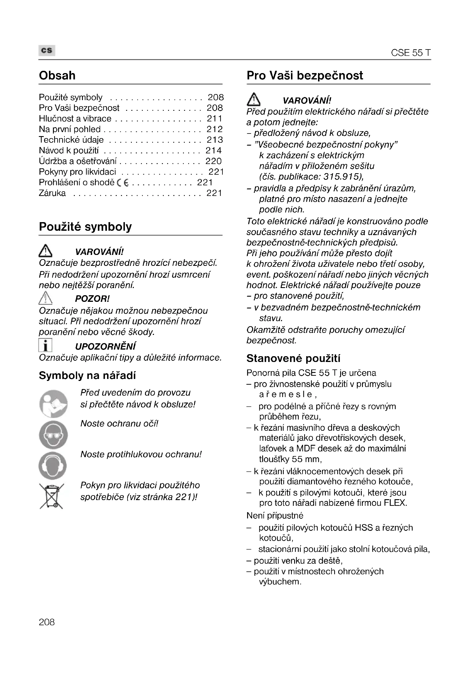 - Záruka Použité symboly VAROVÁNÍ! Označuje bezprostøednì hrozící nebezpečí. Pøi nedodržení upozornìní hrozí usmrcení nebo nejtìžší poranìní. POZOR! Označuje nìjakou možnou nebezpečnou situaci. Pøi nedodržení upozornìní hrozí poranìní nebo vìcné škody. UPOZORNÌNÍ Označuje aplikační tipy a dùležité informace. Symboly na náøadí Pøed uvedením do provozu si pøečtìte návod k obsluze! Noste ochranu očí! Noste protihlukovou ochranu! Pokyn pro likvidaci použitého spotøebiče (viz stránka 221)! Pro Vaši bezpečnost VAROVÁNÍ! Pøed použitím elektrického náøadí si pøečtìte a potom jednejte: – pøedložený návod k obsluze, – ”Všeobecné bezpečnostní pokyny” k zacházení s elektrickým náøadím v pøiloženém sešitu (čís. publikace: 315.915), – pravidla a pøedpisy k zabránìní úrazùm, platné pro místo nasazení a jednejte podle nich. Toto elektrické náøadí je konstruováno podle současného stavu techniky a uznávaných bezpečnostnì-technických pøedpisù. Pøi jeho používání mùže pøesto dojít k ohrožení života uživatele nebo tøetí osoby, event. poškození náøadí nebo jiných vìcných hodnot. Elektrické náøadí používejte pouze – pro stanovené použití, – v bezvadném bezpečnostnì-technickém stavu. Okamžitì odstraòte poruchy omezující bezpečnost. Stanovené použití Ponorná pila CSE 55 T je určena – pro živnostenské použití v prùmyslu aøemesle, – pro podélné a pøíčné øezy s rovným prùbìhem øezu, – k øezání masivního døeva a deskových materiálù jako døevotøískových desek, laˆovek a MDF desek až do maximální tloušˆky 55 mm, – k øezání vláknocementových desek pøi použití diamantového øezného kotouče, – k použití s pilovými kotouči, které jsou pro toto náøadí nabízené firmou FLEX. Není pøípustné – použití pilových kotoučù HSS a øezných kotoučù, – stacionární použití jako stolní kotoučová pila, – použití venku za deštì, – použití v místnostech ohrožených výbuchem.CSE 55 T p. 221